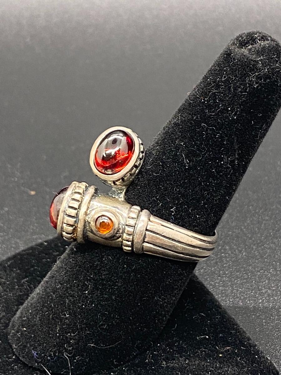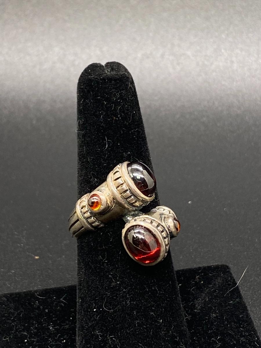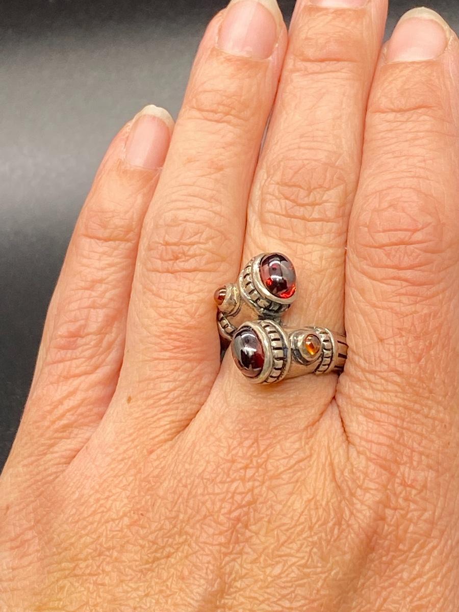 Sterling silver wrap style ring. Garnet like cabochon accents. Large size, maybe an 8. Stamped inside.