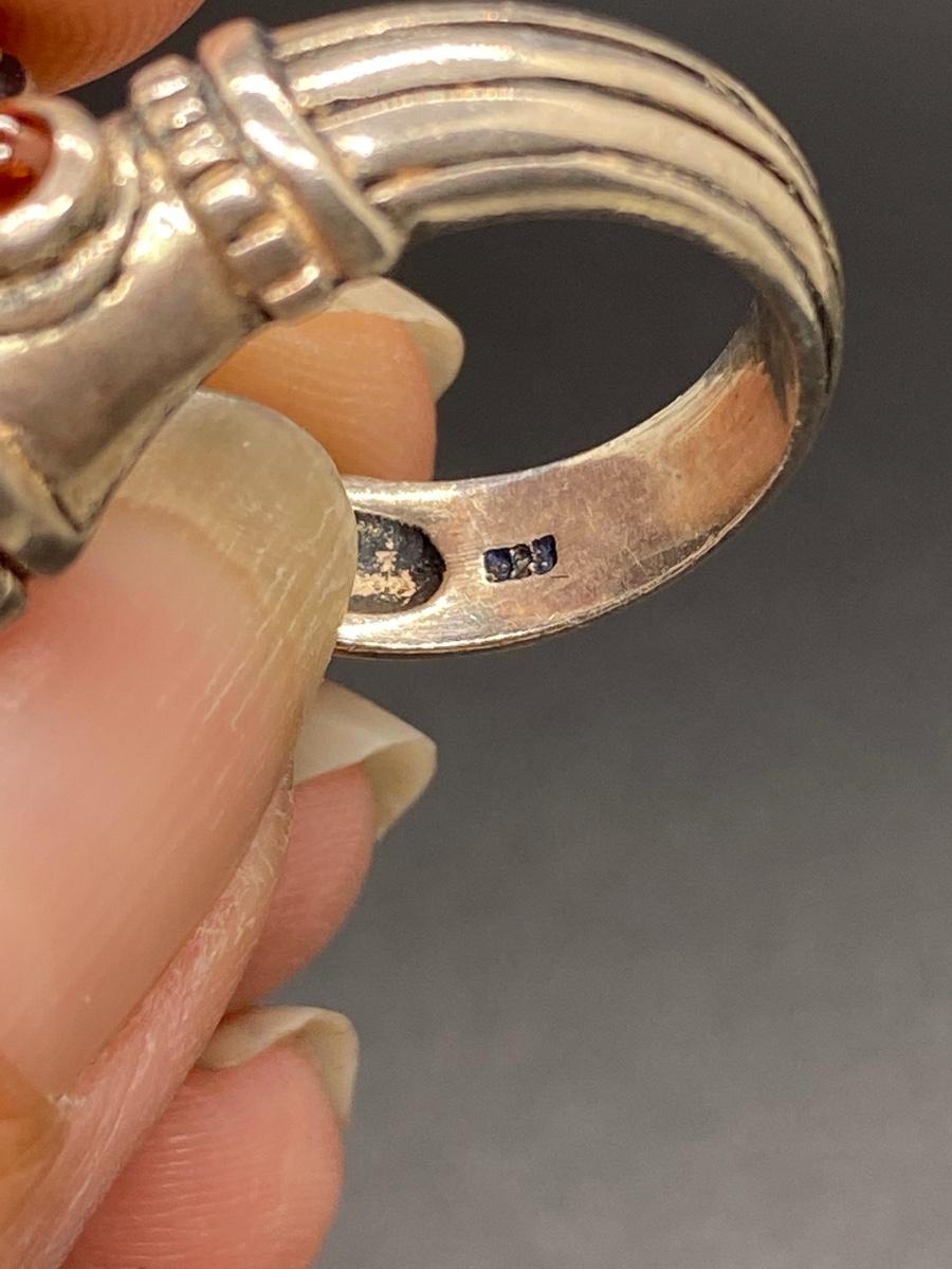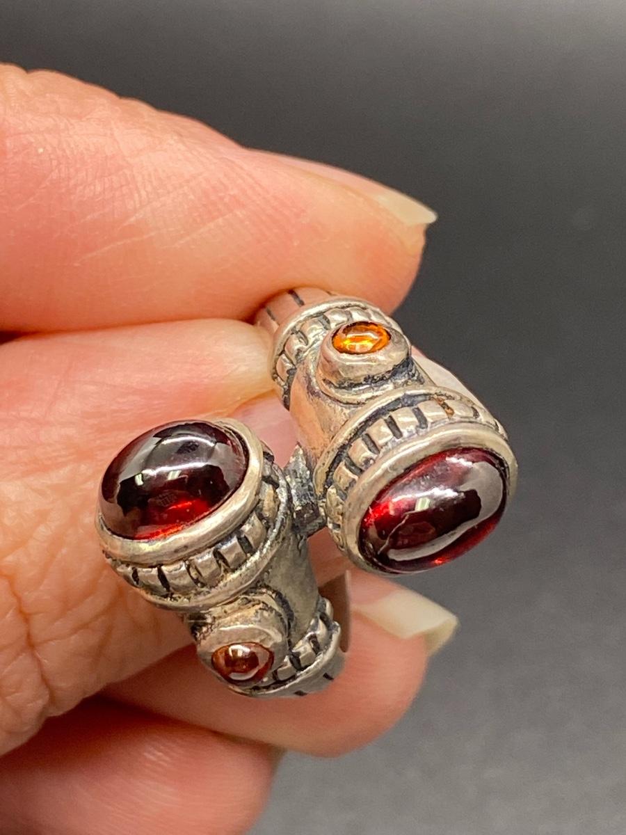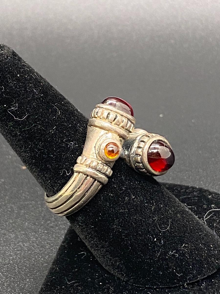 Sterling silver wrap style ring. Garnet like cabochon accents. Large size, maybe an 8. Stamped inside.