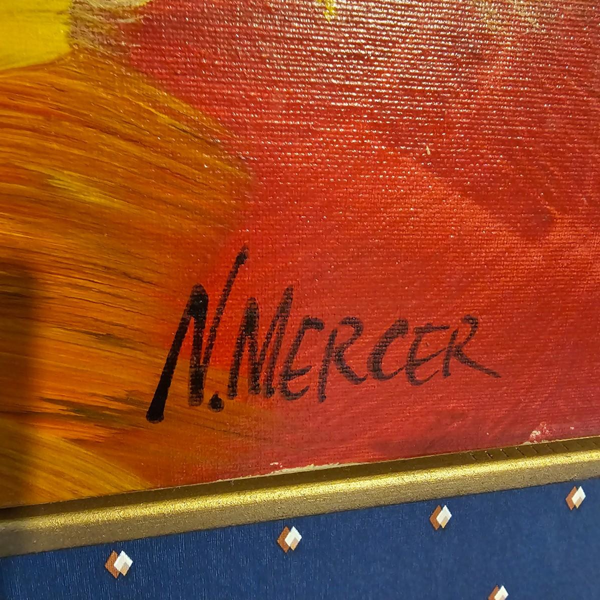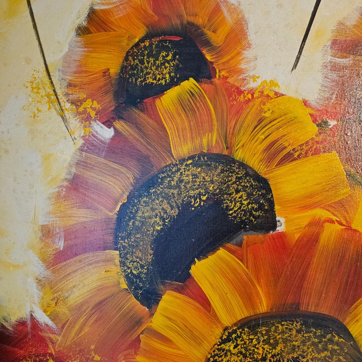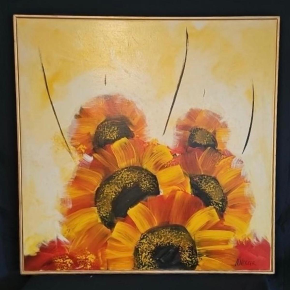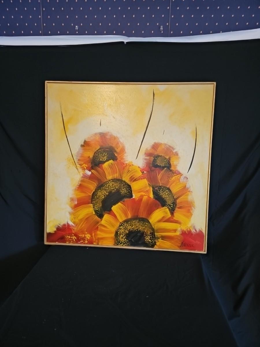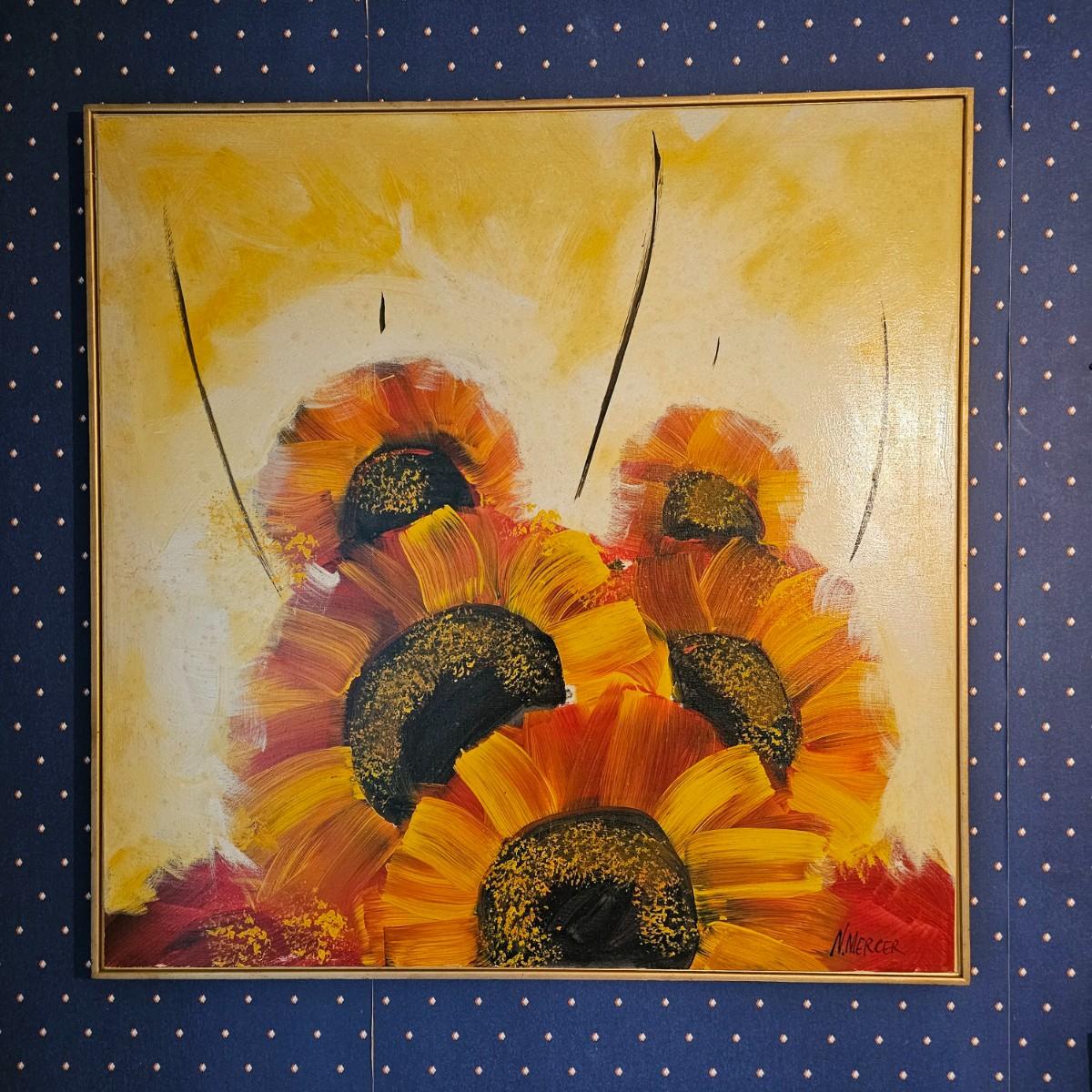 Original signed artwork by N. Mercer, sunflowers oil on canvas. Painting has wood frame with gold edge, measures 37" Sq. Some slight discoloring on back of canvas. See photos for details. Shipping available. Shipping can be costly. We suggest contacting our preferred local shipping provider, Postage Express, with dimensions and getting an estimate before bidding: (828) 670-5501 or shipping@postageexpressnc.com