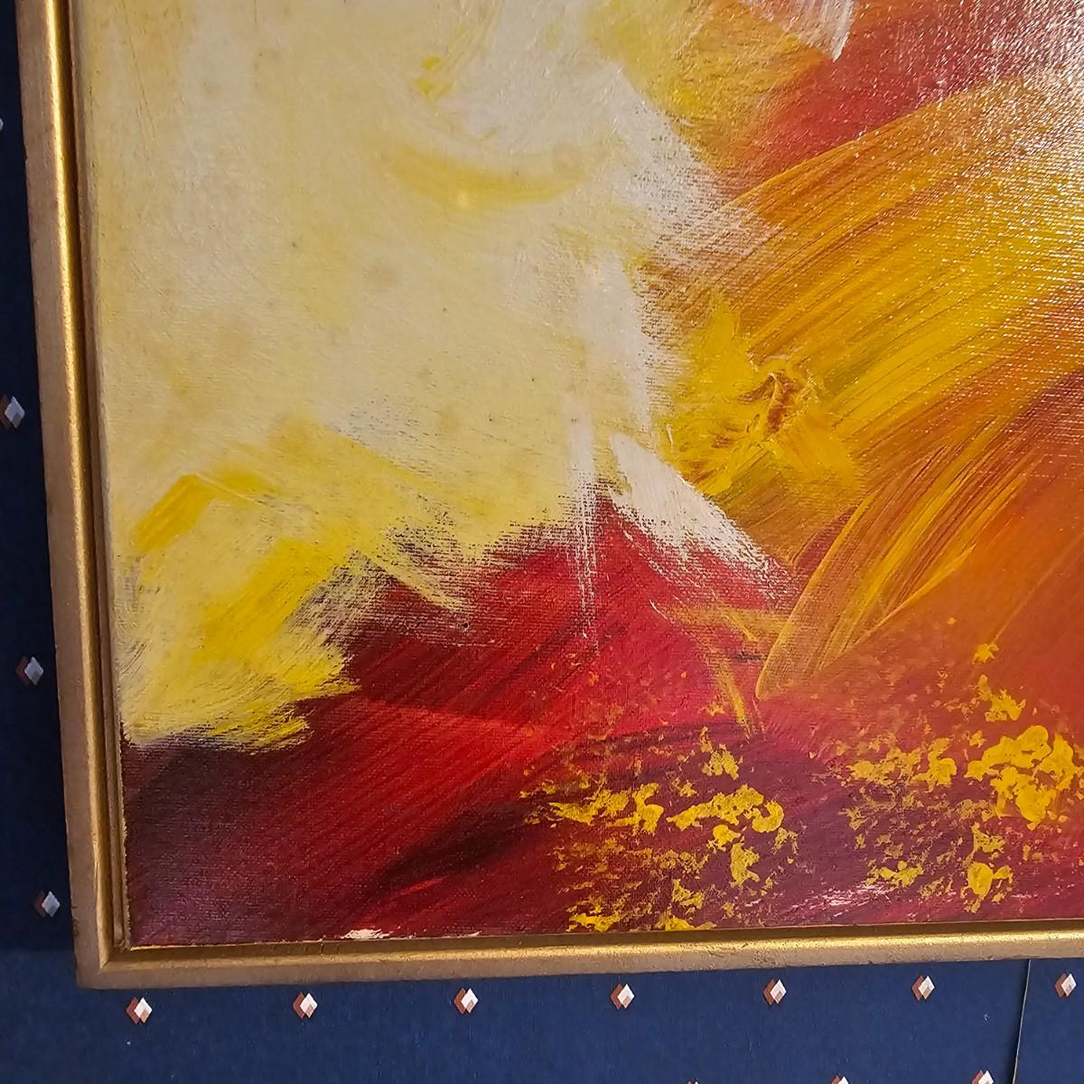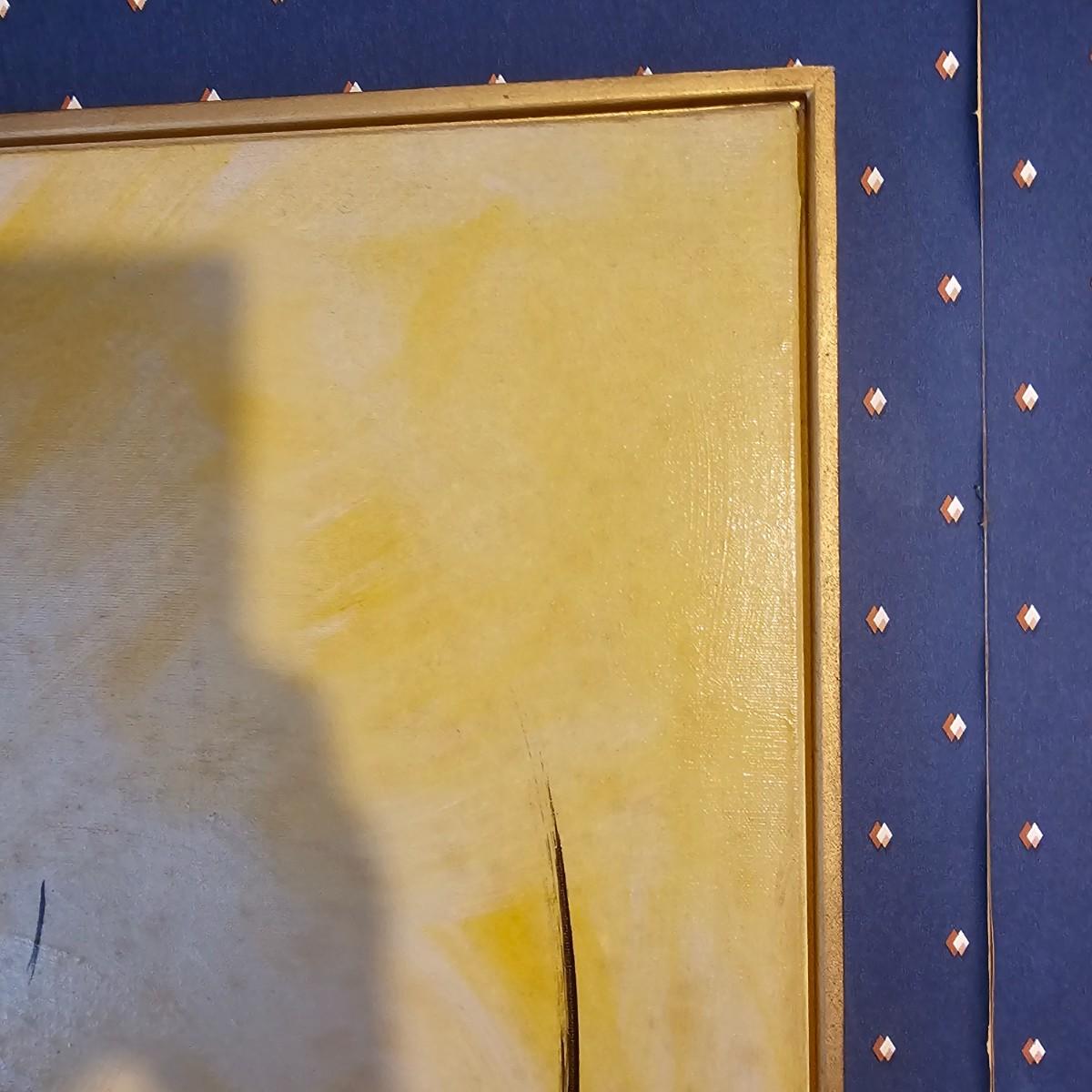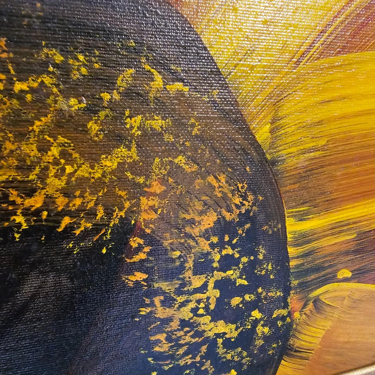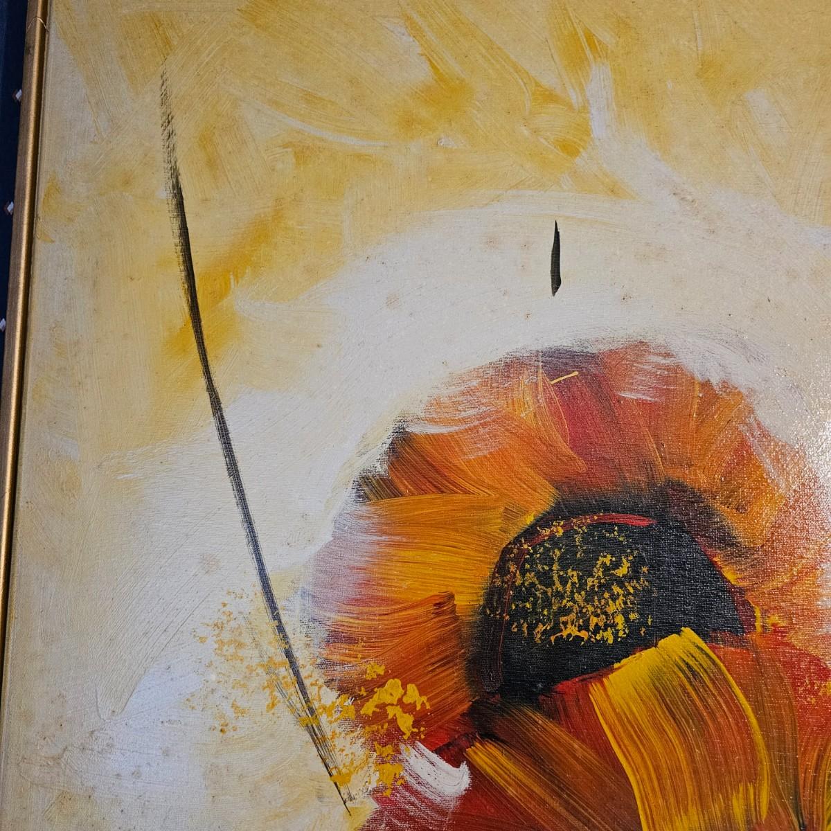 Original signed artwork by N. Mercer, sunflowers oil on canvas. Painting has wood frame with gold edge, measures 37" Sq. Some slight discoloring on back of canvas. See photos for details. Shipping available. Shipping can be costly. We suggest contacting our preferred local shipping provider, Postage Express, with dimensions and getting an estimate before bidding: (828) 670-5501 or shipping@postageexpressnc.com