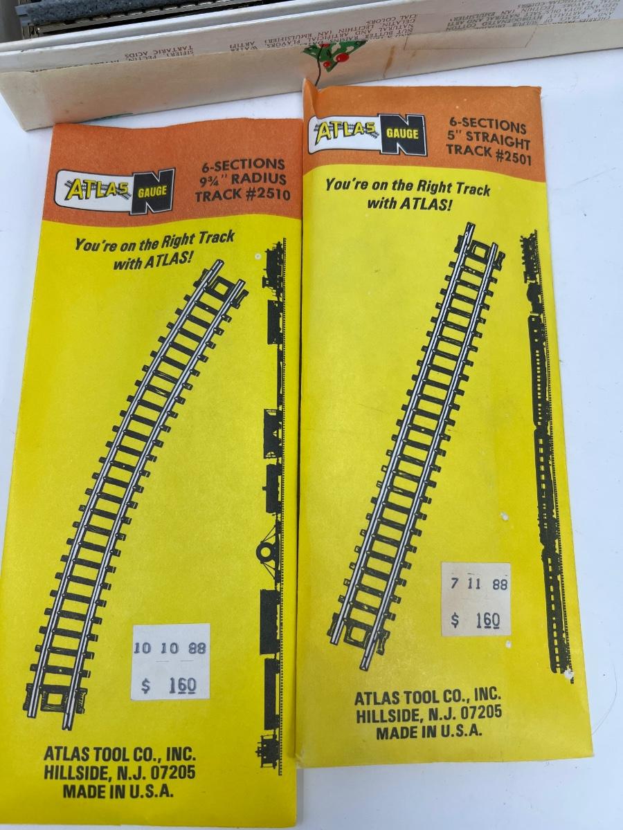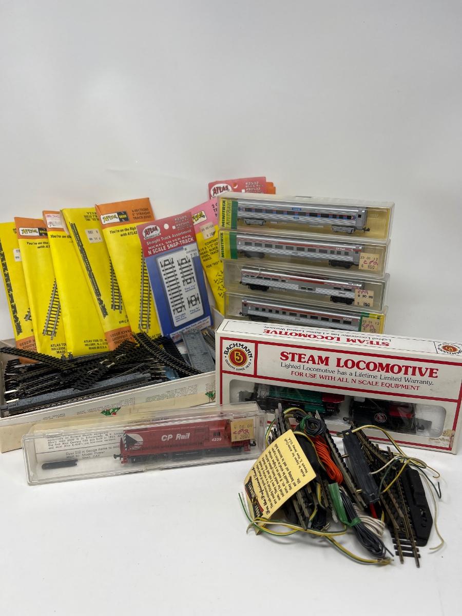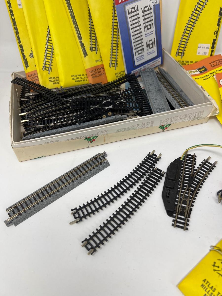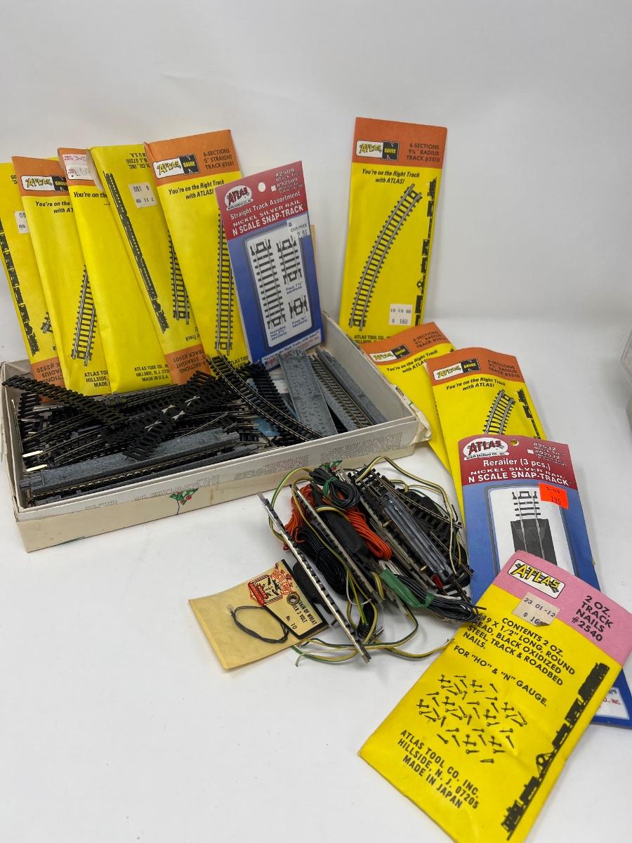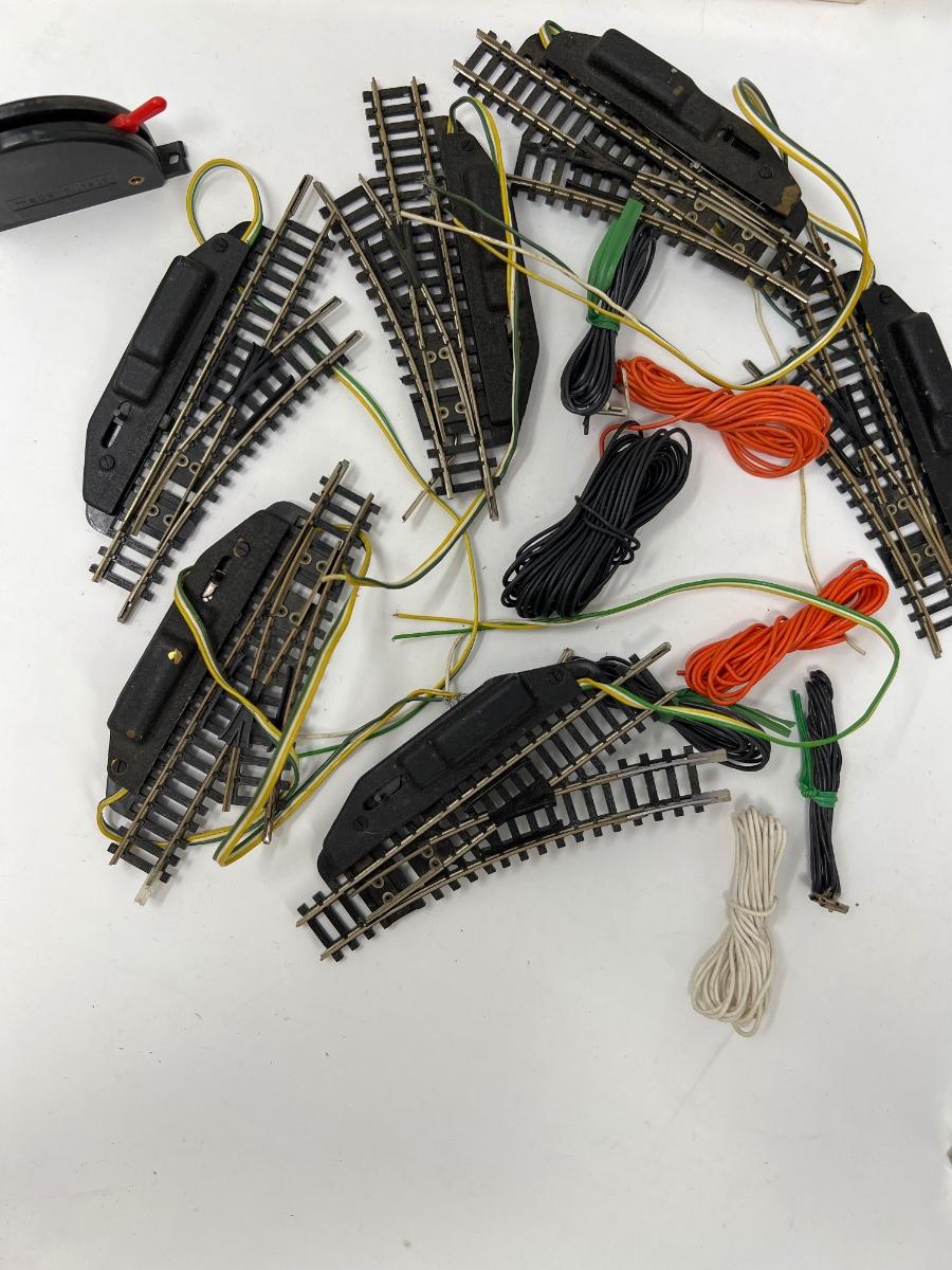 Various vinyage train cars and two engines (one made in Yugoslavia) and straight and curved track and Y switch track.