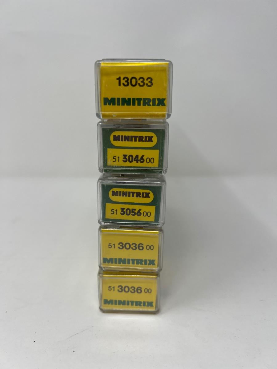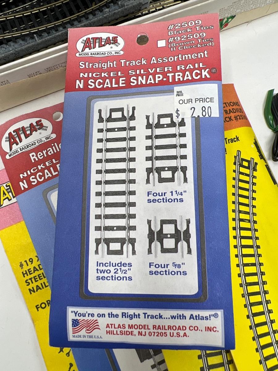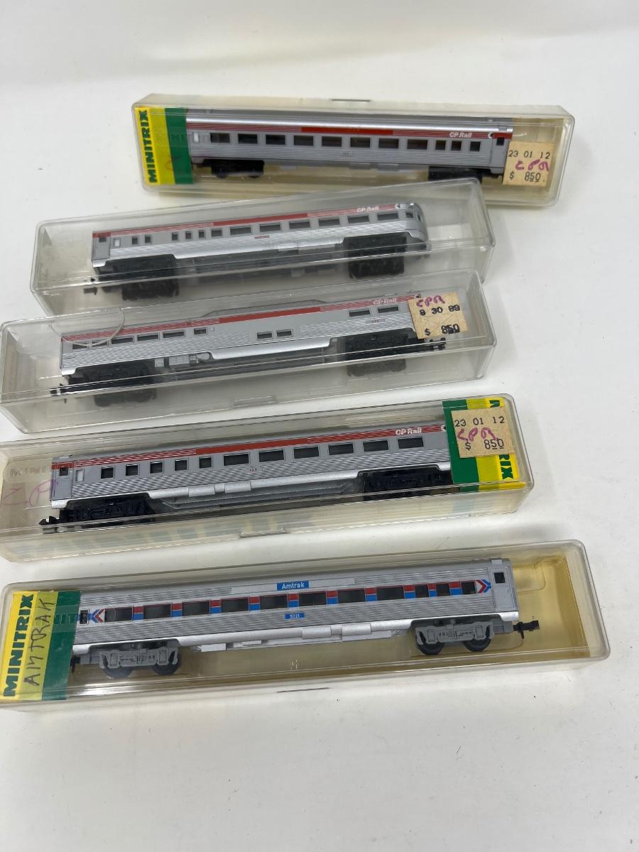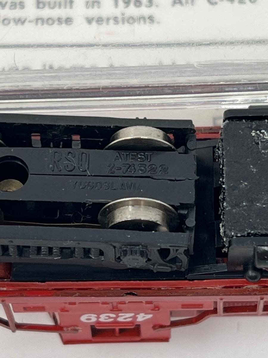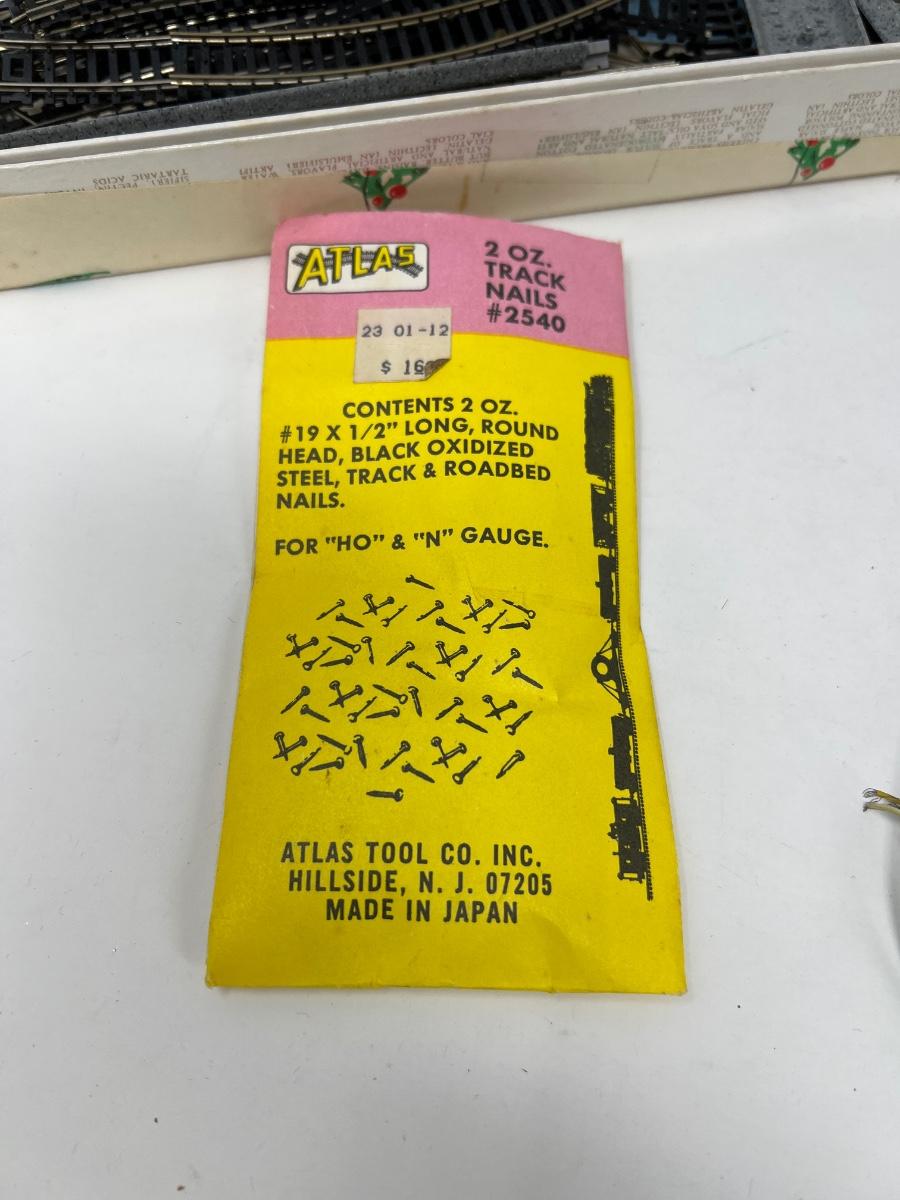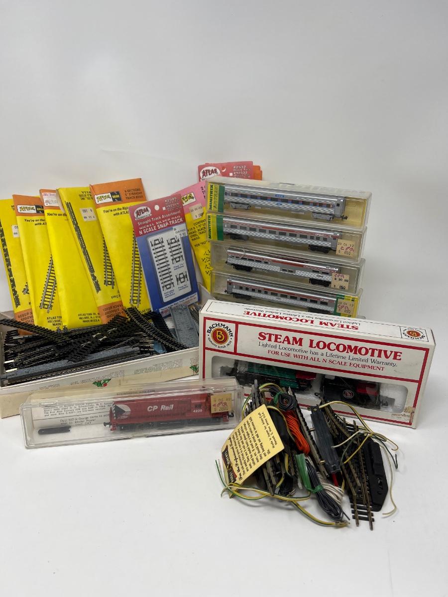 Various vinyage train cars and two engines (one made in Yugoslavia) and straight and curved track and Y switch track.