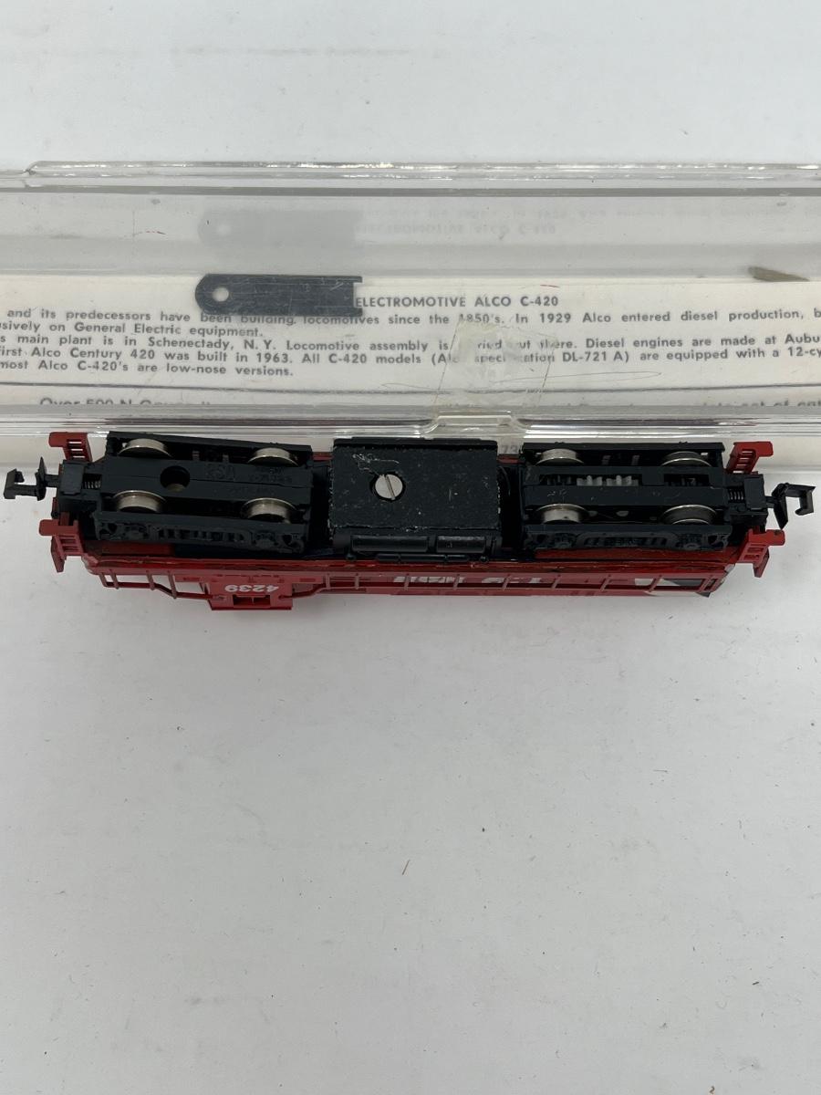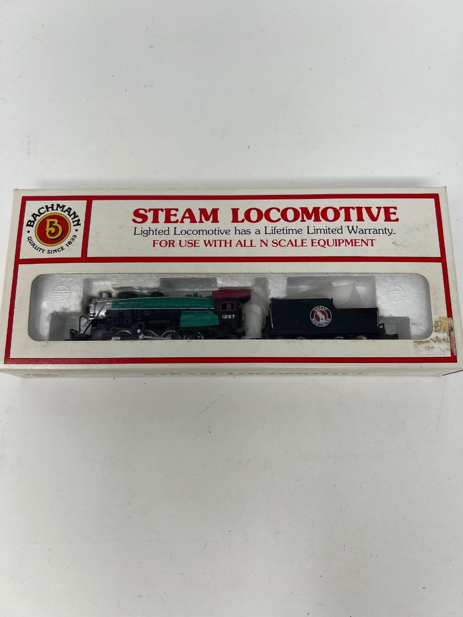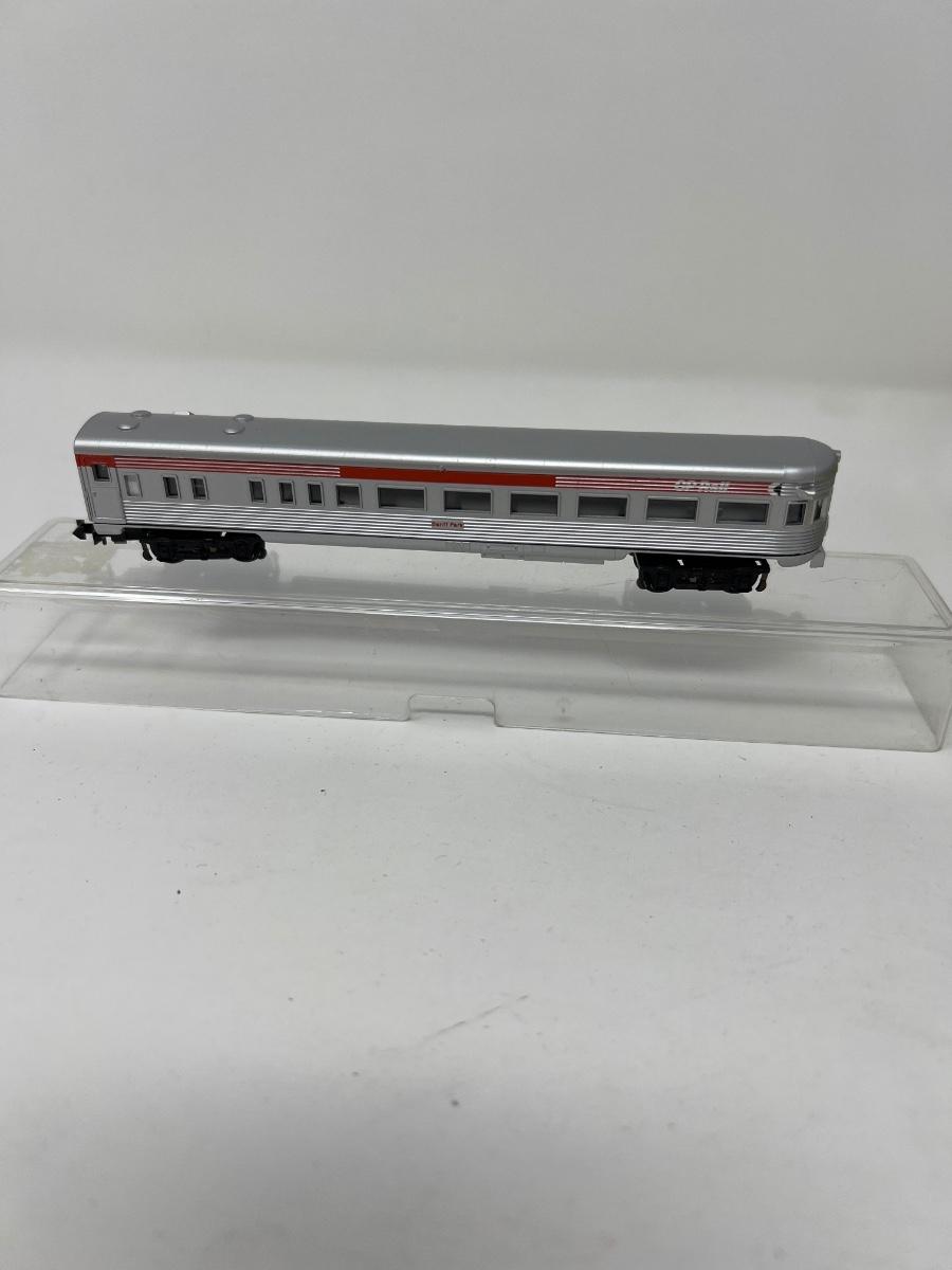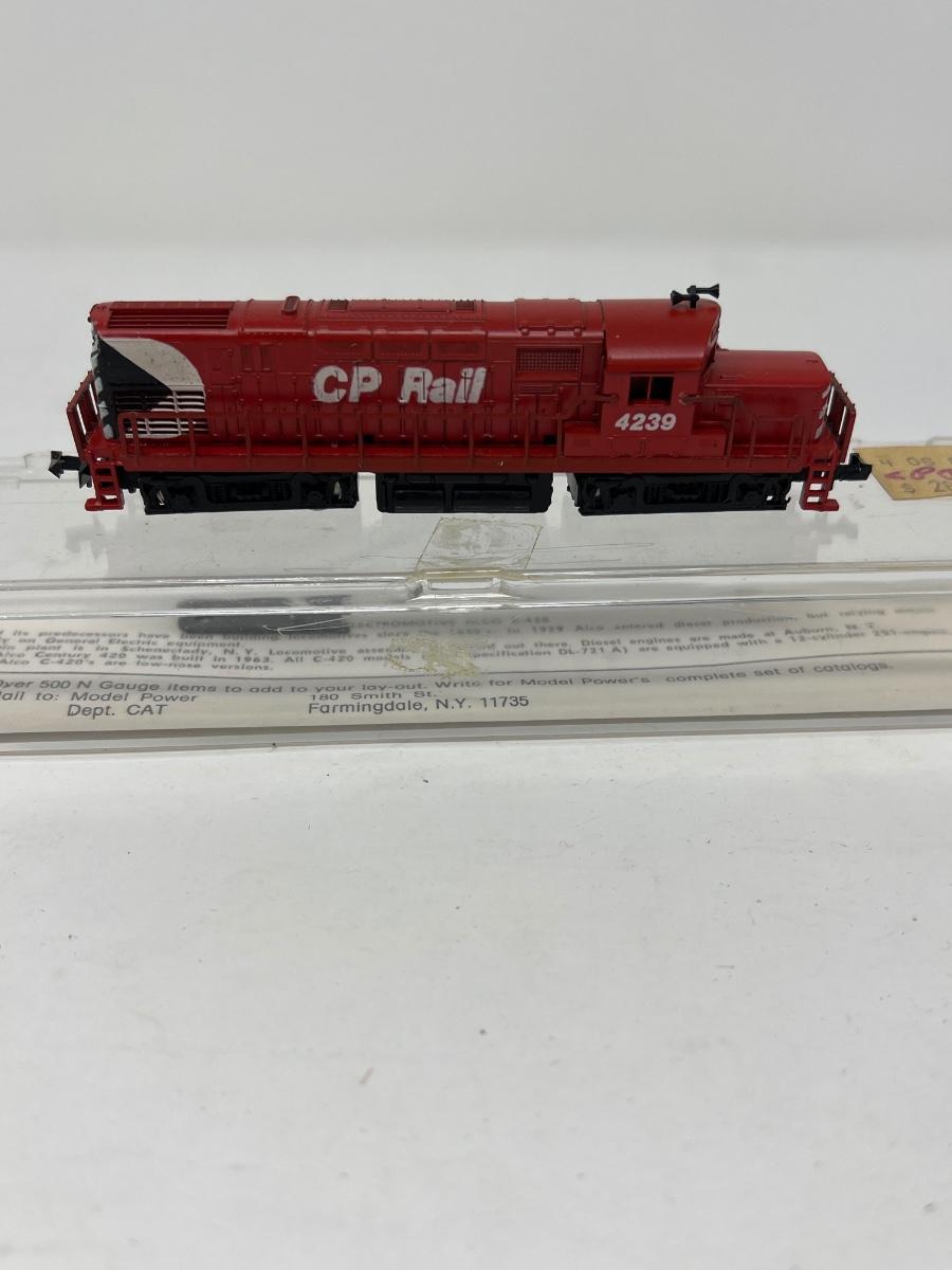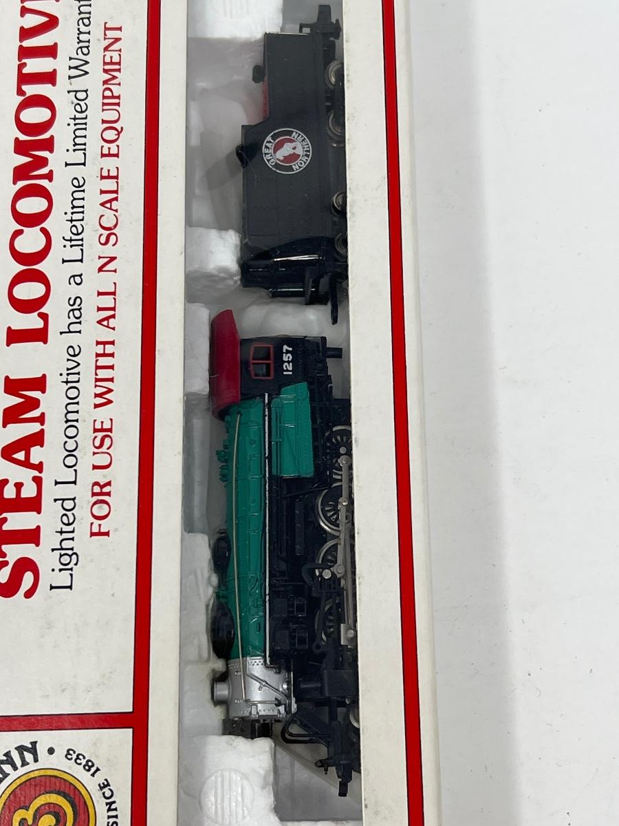 Various vinyage train cars and two engines (one made in Yugoslavia) and straight and curved track and Y switch track.