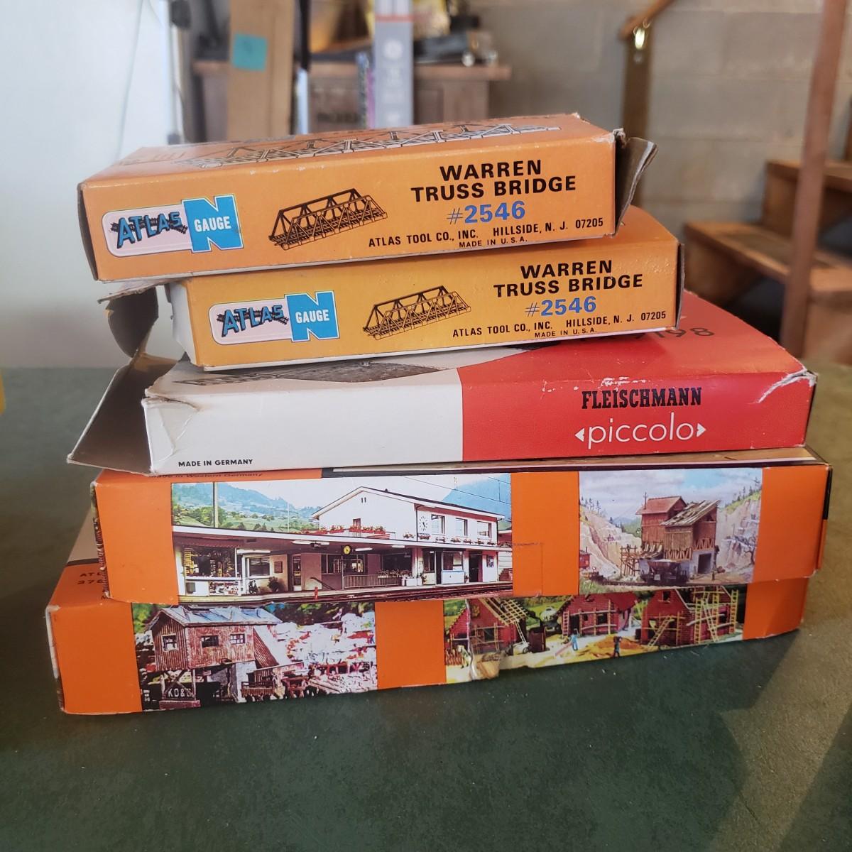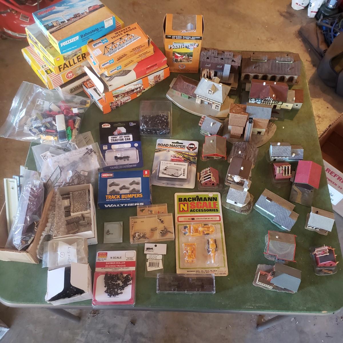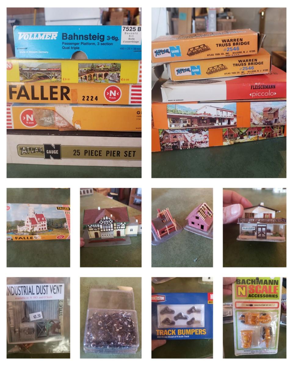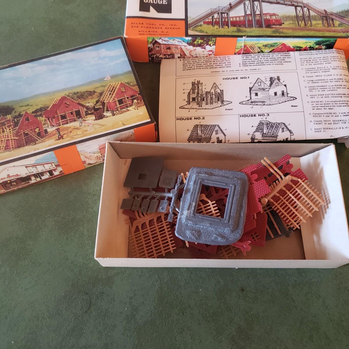 This N scale model scenery has a lot to choose from some! There are some vintage house/building sets, still new, ready to put together! The largest house measures approximately 6" x 3" x 2"H. There is so much, we let the pictures do the explaining on this lot!