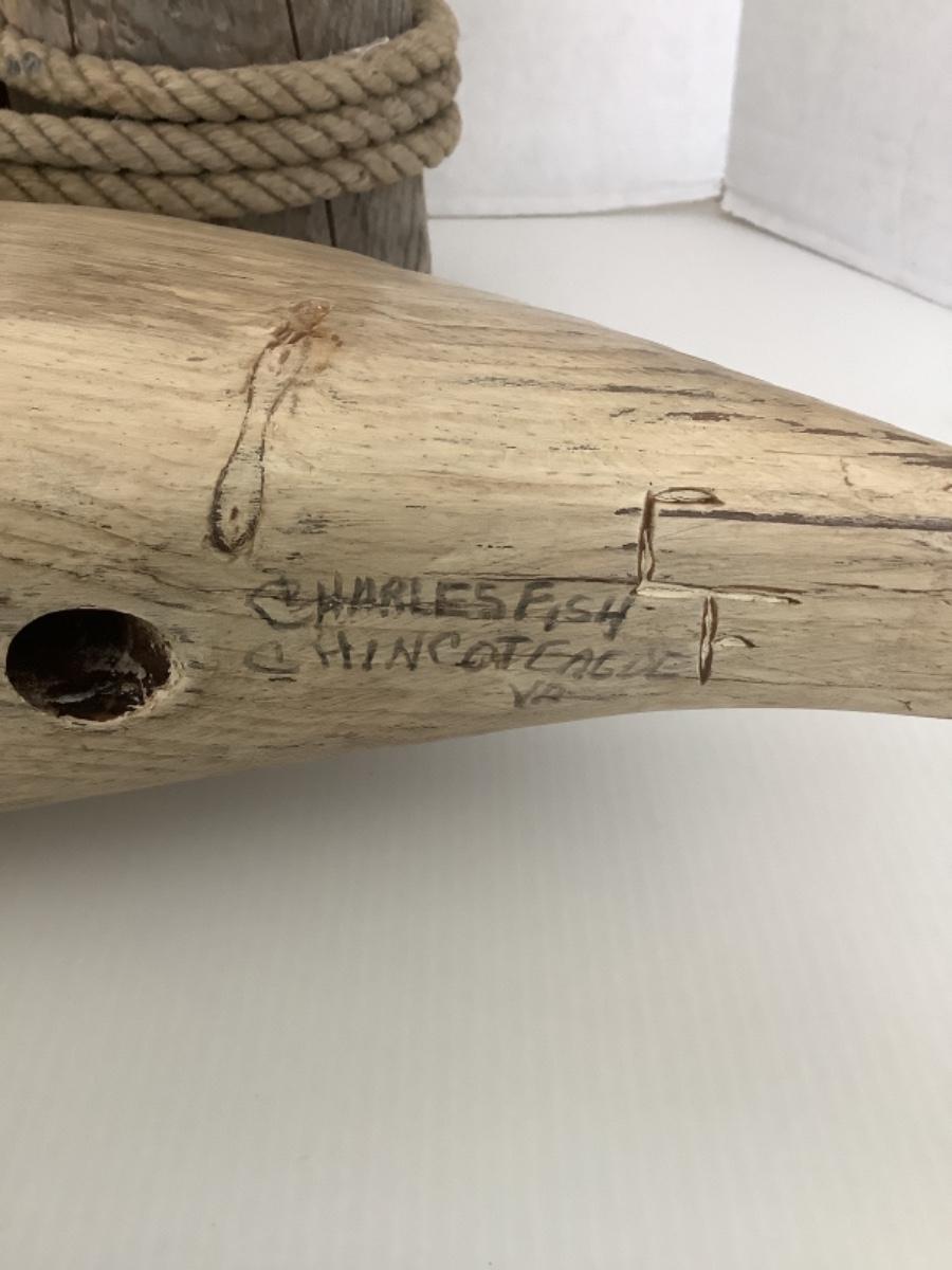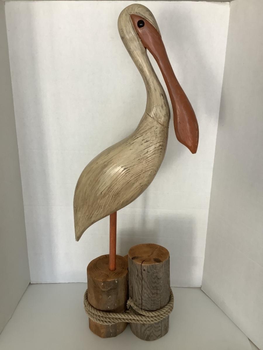 Large Wooden Carved Brown Pelican on Pilings by Charles Fish of Chincoteague , VA.