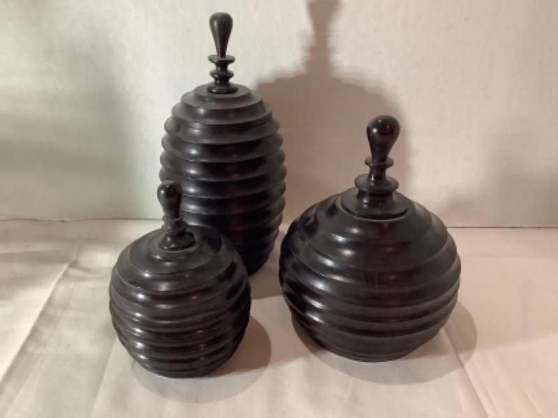 N1474 Three Piece Wooden Covered Jars Made in Mecambique