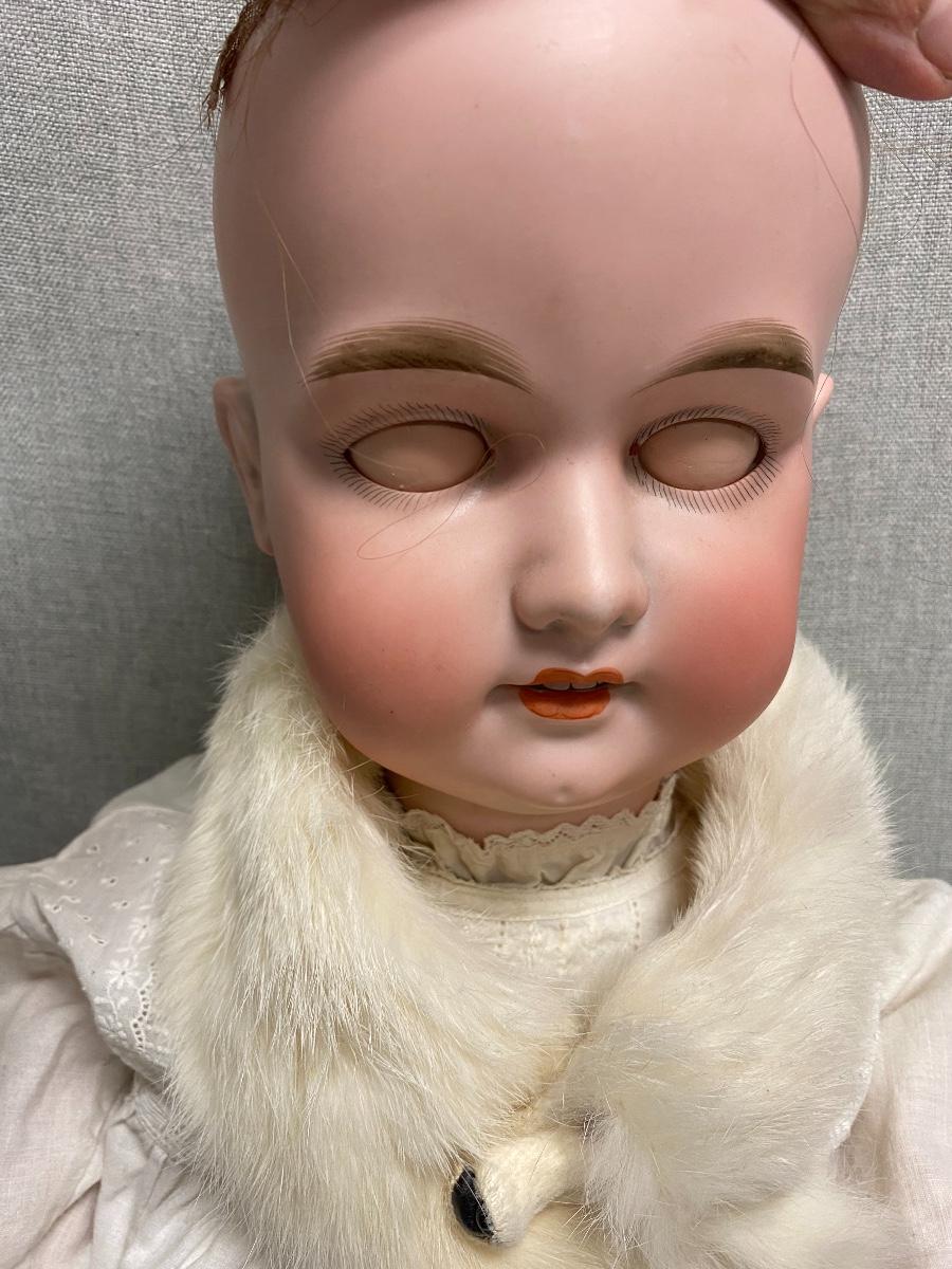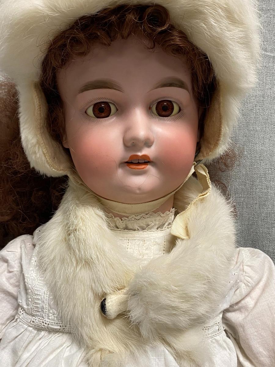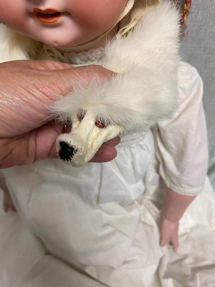 Beautiful bisque and composite Armand Marseille Doll. Marked A15M on back of head. Sleep eyes. About 31" tall. Wearing real ermine hat and collar wrap. That is a hair going across her face, not a crack, I doubled checked. There is some yellowing to the whites of her eyes. Composite has some scratches not too bad, Pinky on right hand has tip damage. No other marks on head or body noticed.
