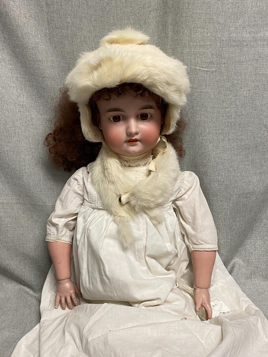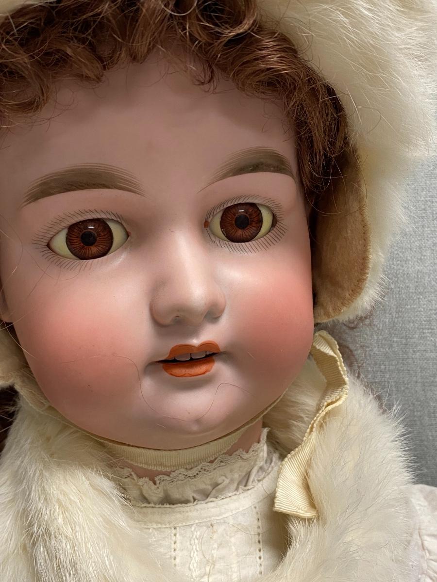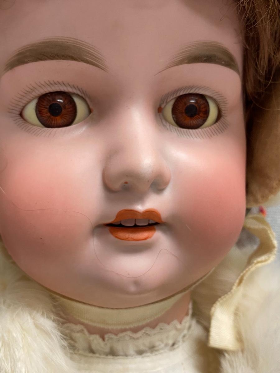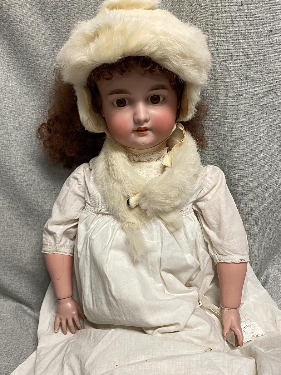 Beautiful bisque and composite Armand Marseille Doll. Marked A15M on back of head. Sleep eyes. About 31" tall. Wearing real ermine hat and collar wrap. That is a hair going across her face, not a crack, I doubled checked. There is some yellowing to the whites of her eyes. Composite has some scratches not too bad, Pinky on right hand has tip damage. No other marks on head or body noticed.
