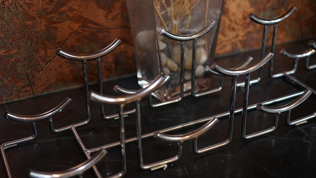 seven bottle wine bottle holder of chrome. perfect for the cabinet or counter.