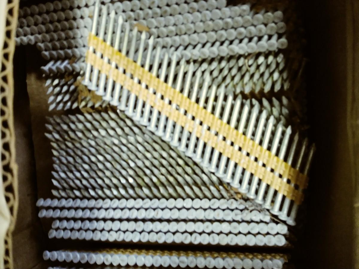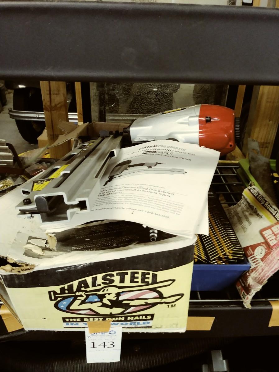 Pneumatic Framing Nail Gun and Boxes of nails for nail gun; boxes of bolts, tool bags