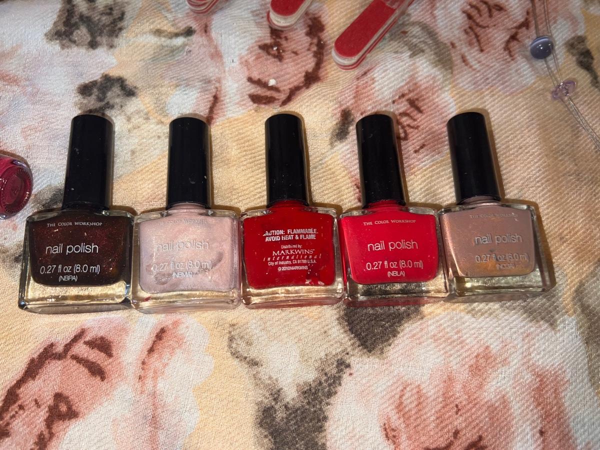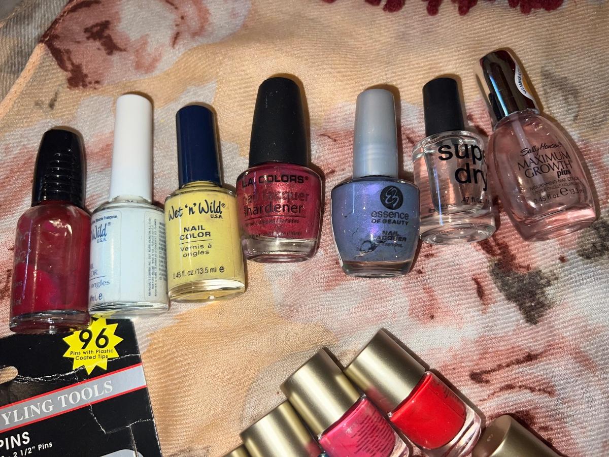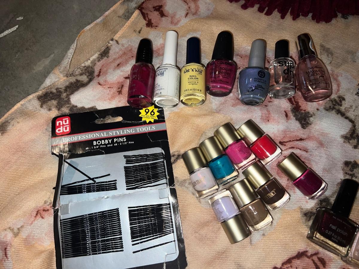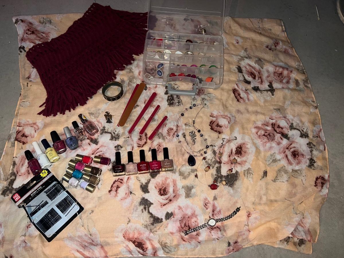 NAIL POLISH, BOBBY PINS, EARRINGS, NAIL FILES, NECKLACES, WATCH AND SCARFS.
