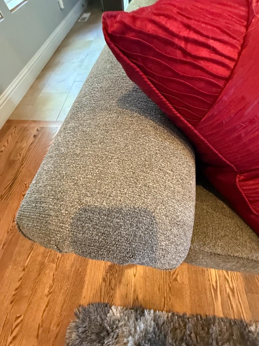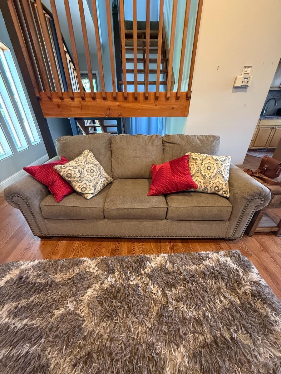 Neutral-toned sofa with rolled arms and nailhead trim, includes four accent pillows. Excellent condition.
