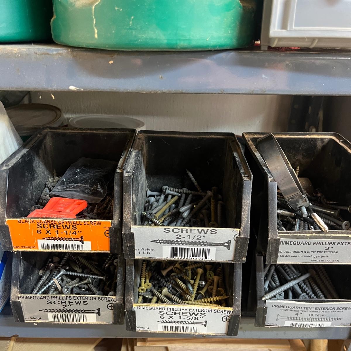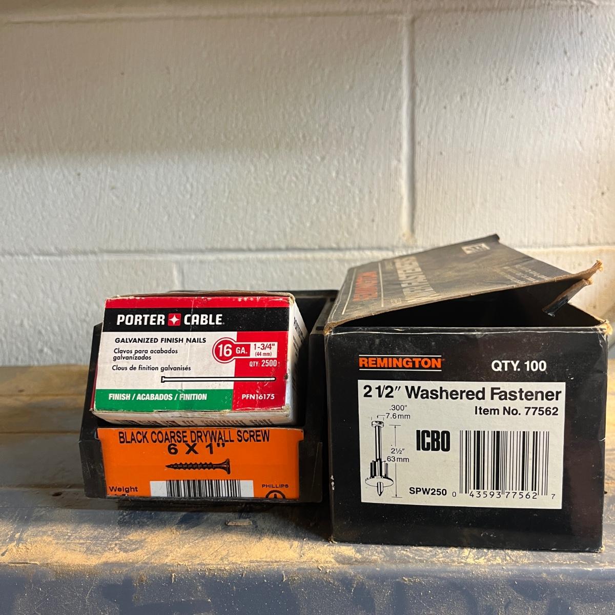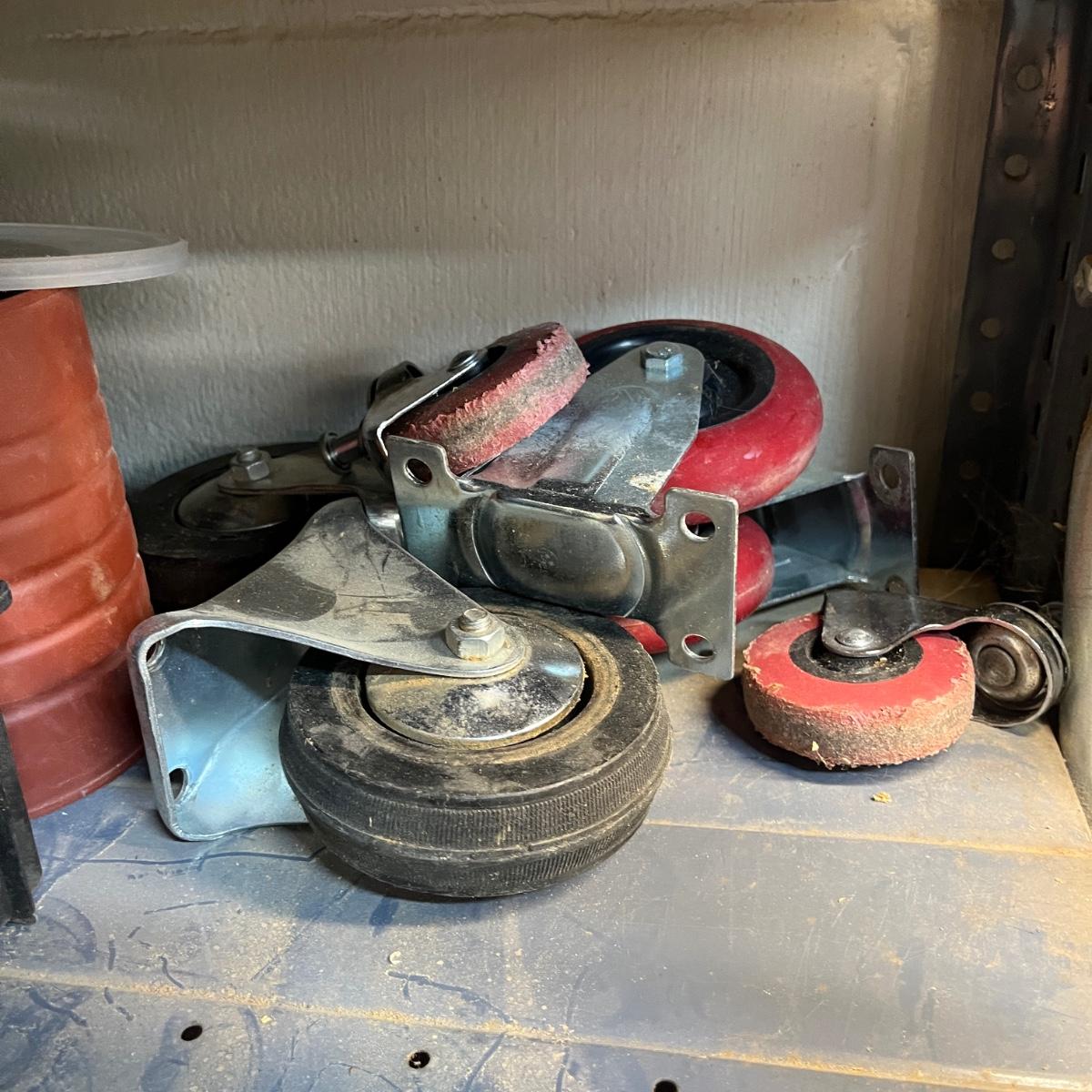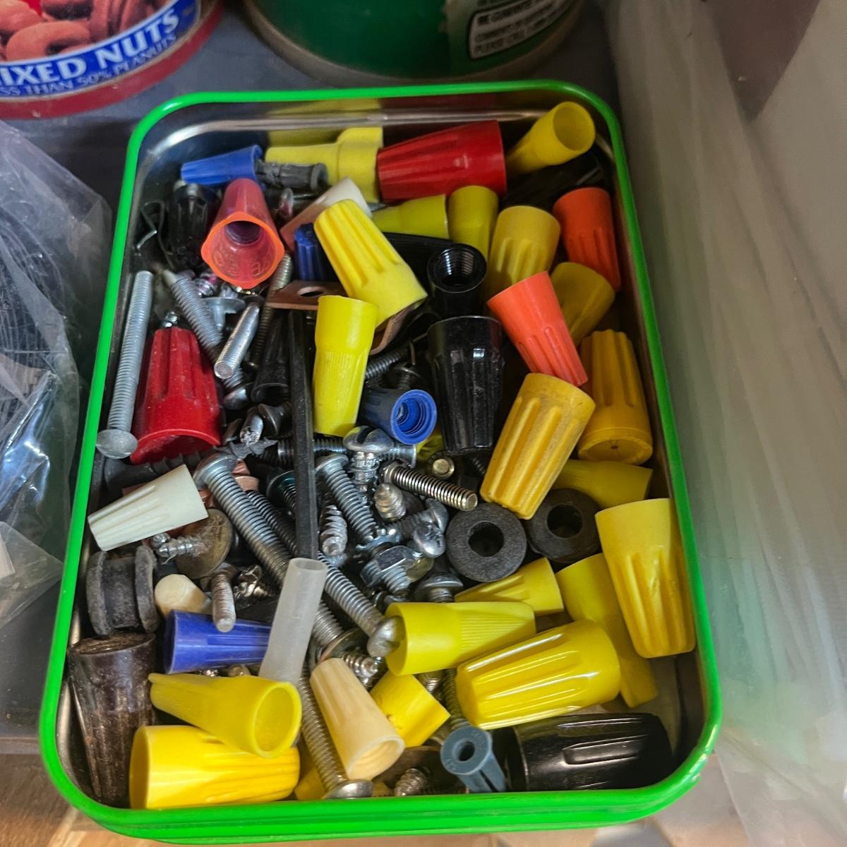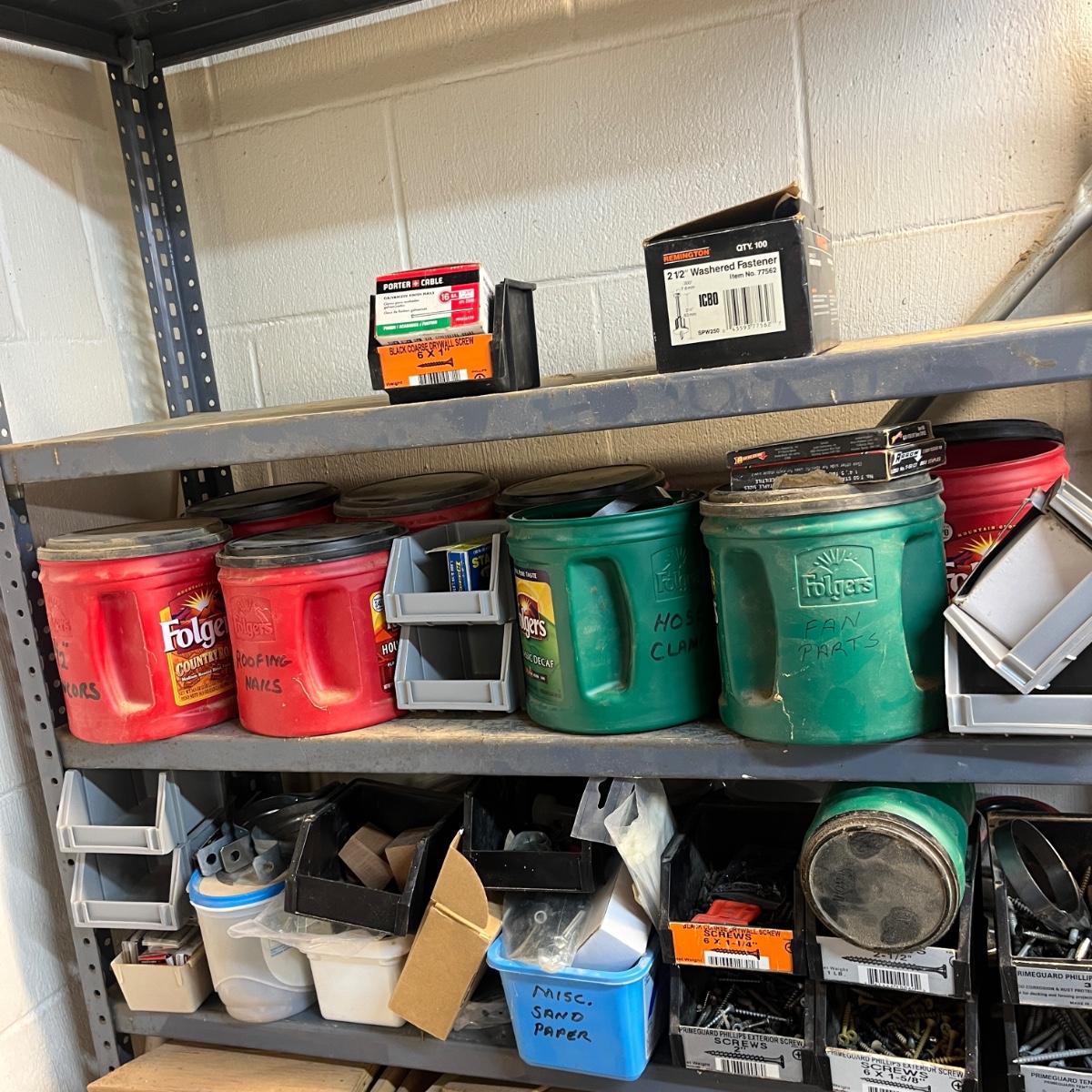 Lot includes a selection of nails, screws, wheels, hinges, screws, staples, clamps and more. Shelf unit in images is not included.