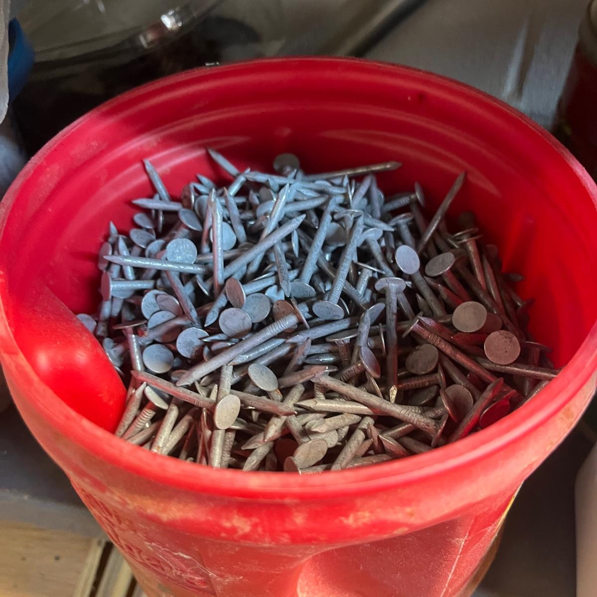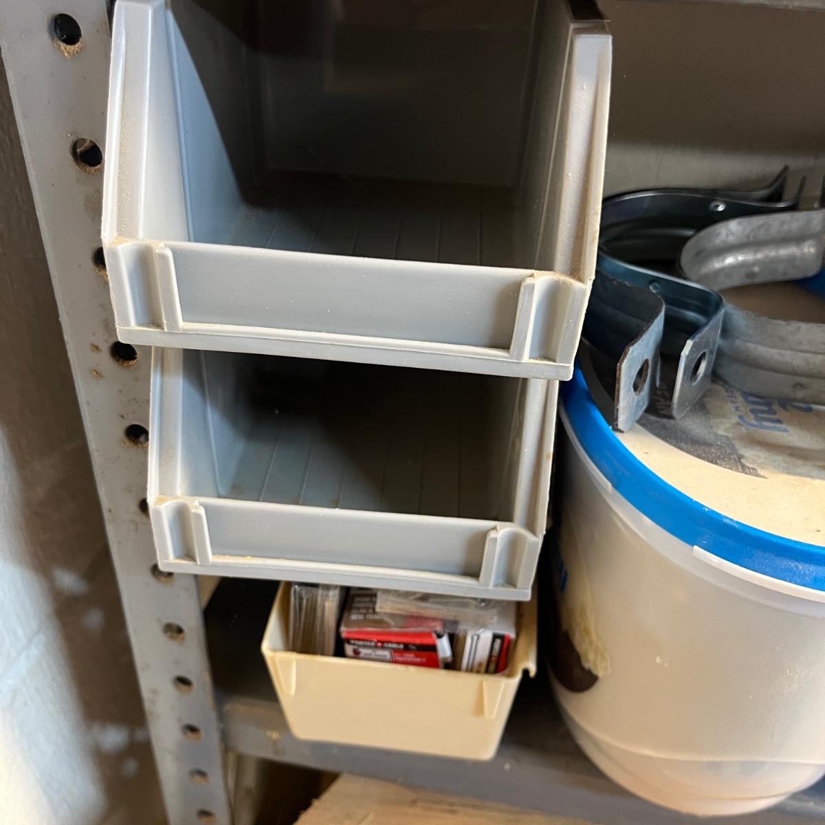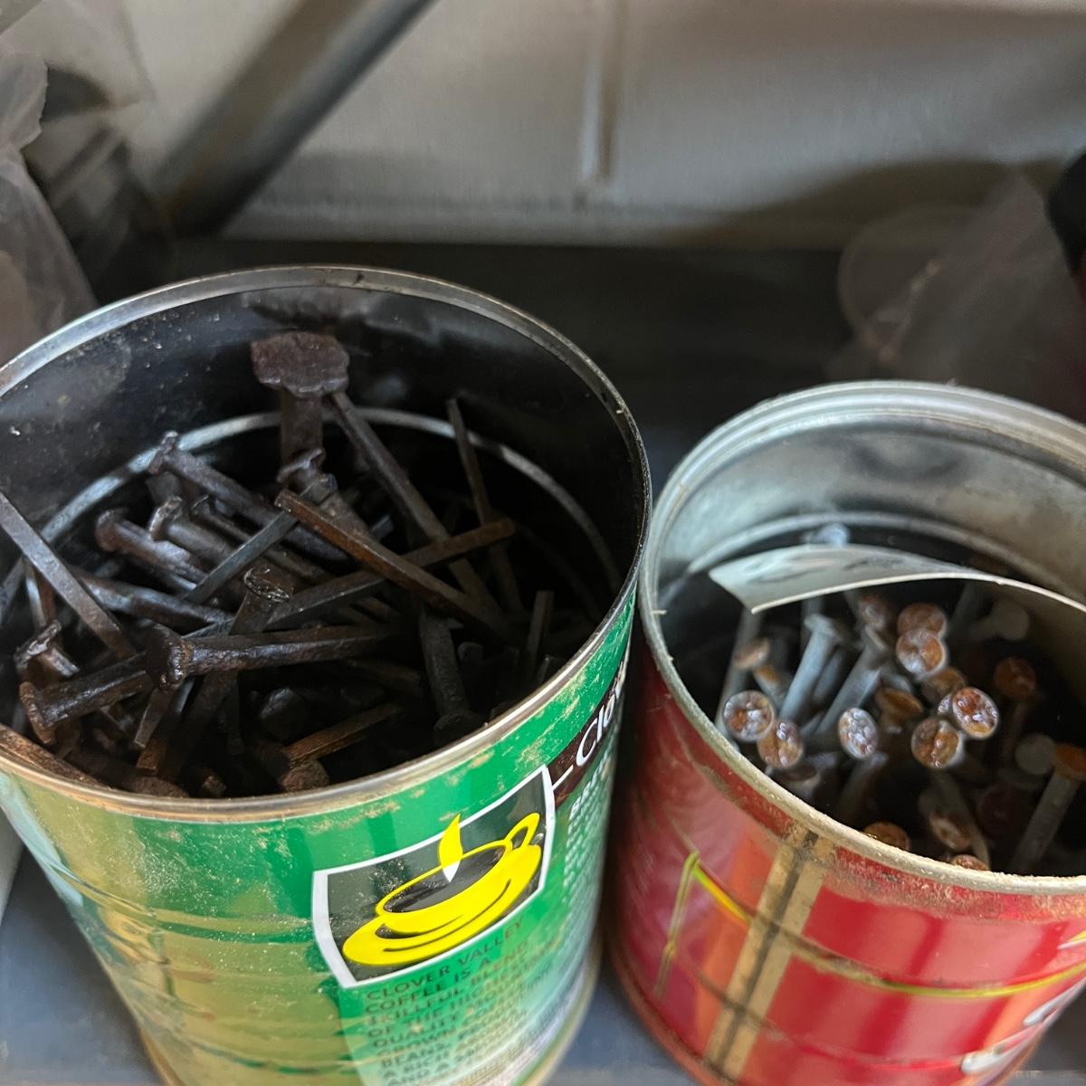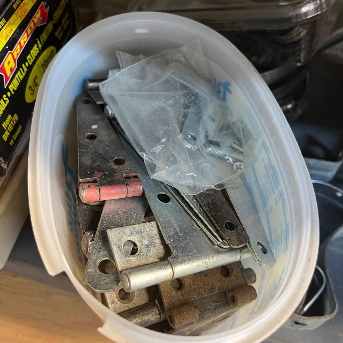 Lot includes a selection of nails, screws, wheels, hinges, screws, staples, clamps and more. Shelf unit in images is not included.