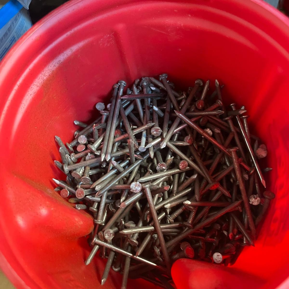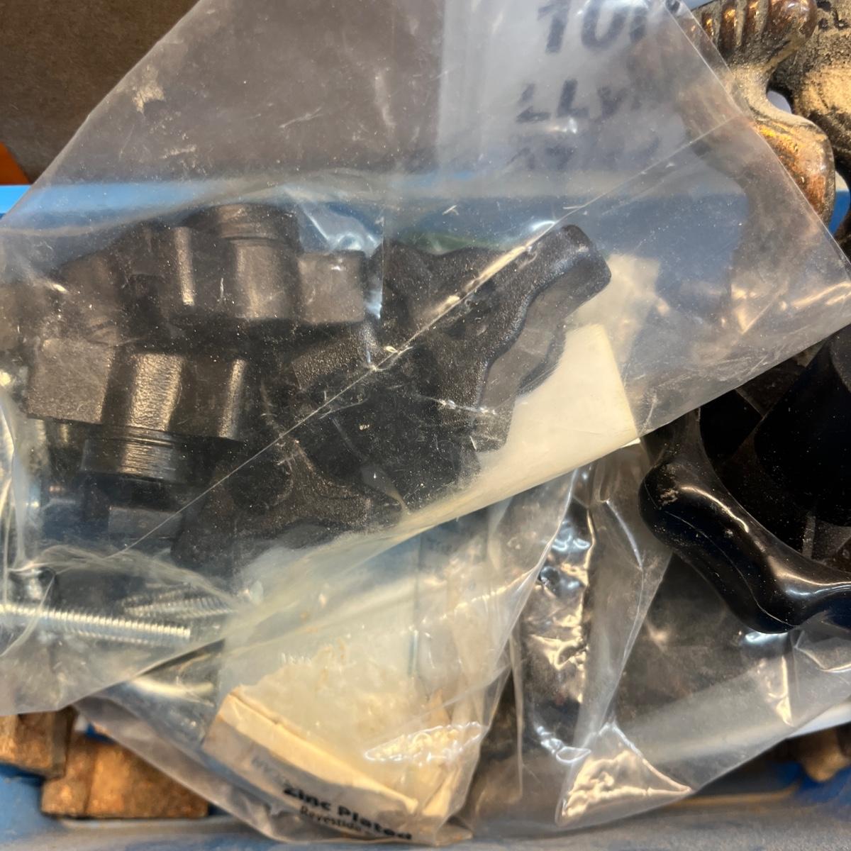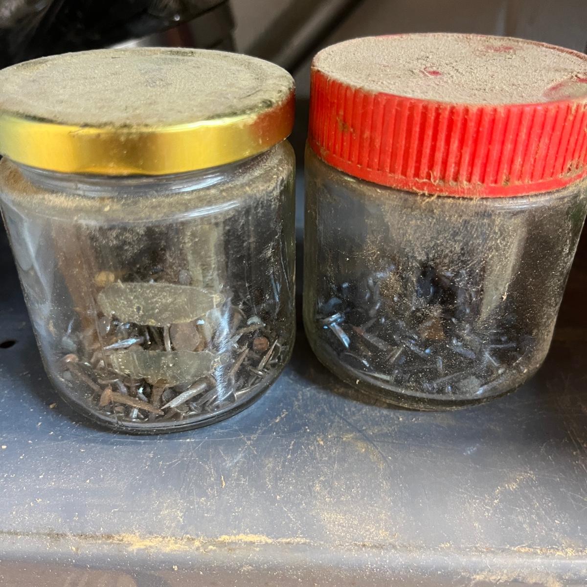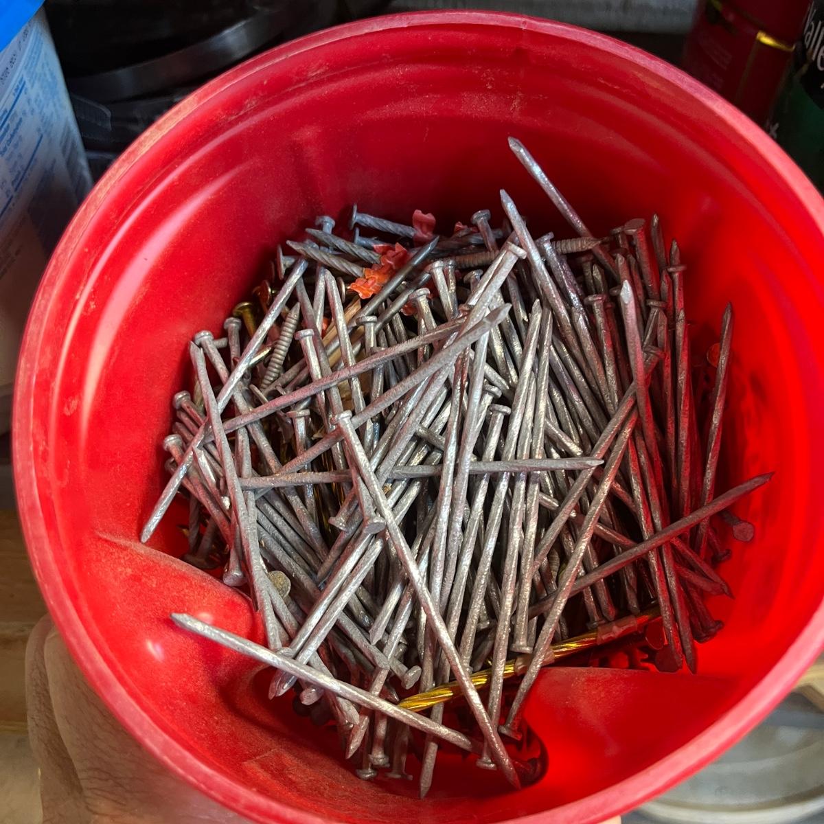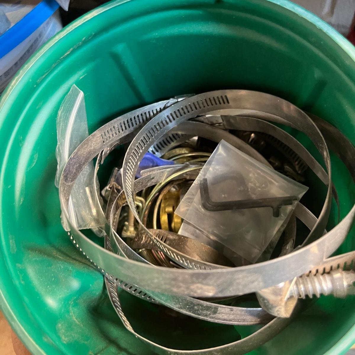 Lot includes a selection of nails, screws, wheels, hinges, screws, staples, clamps and more. Shelf unit in images is not included.