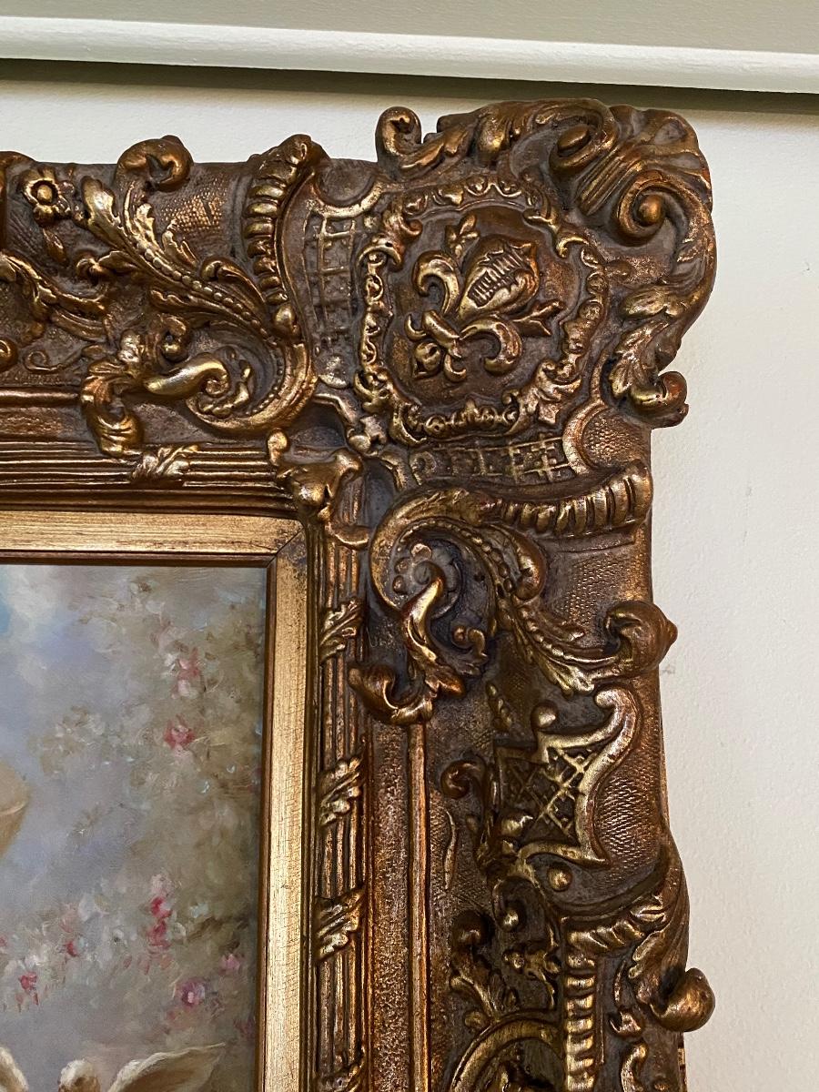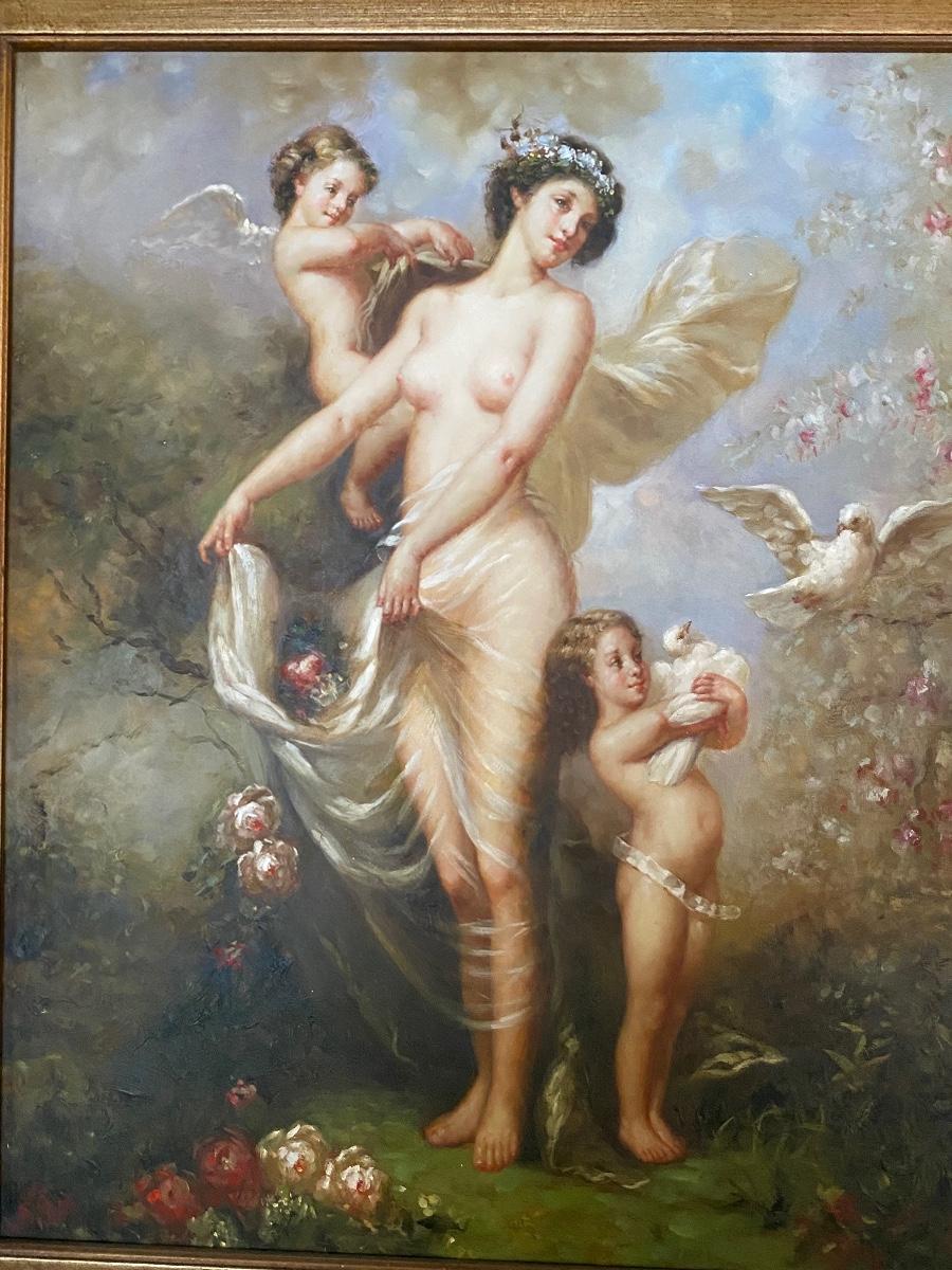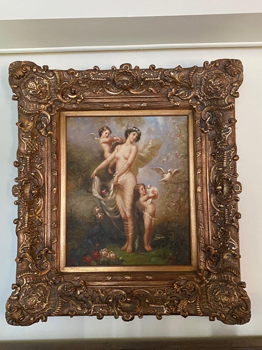 Ornately framed painting of a nymph with cherubs. No signature seen. Frame seems to be made of a resin, not wood or plaster. About 36x36.