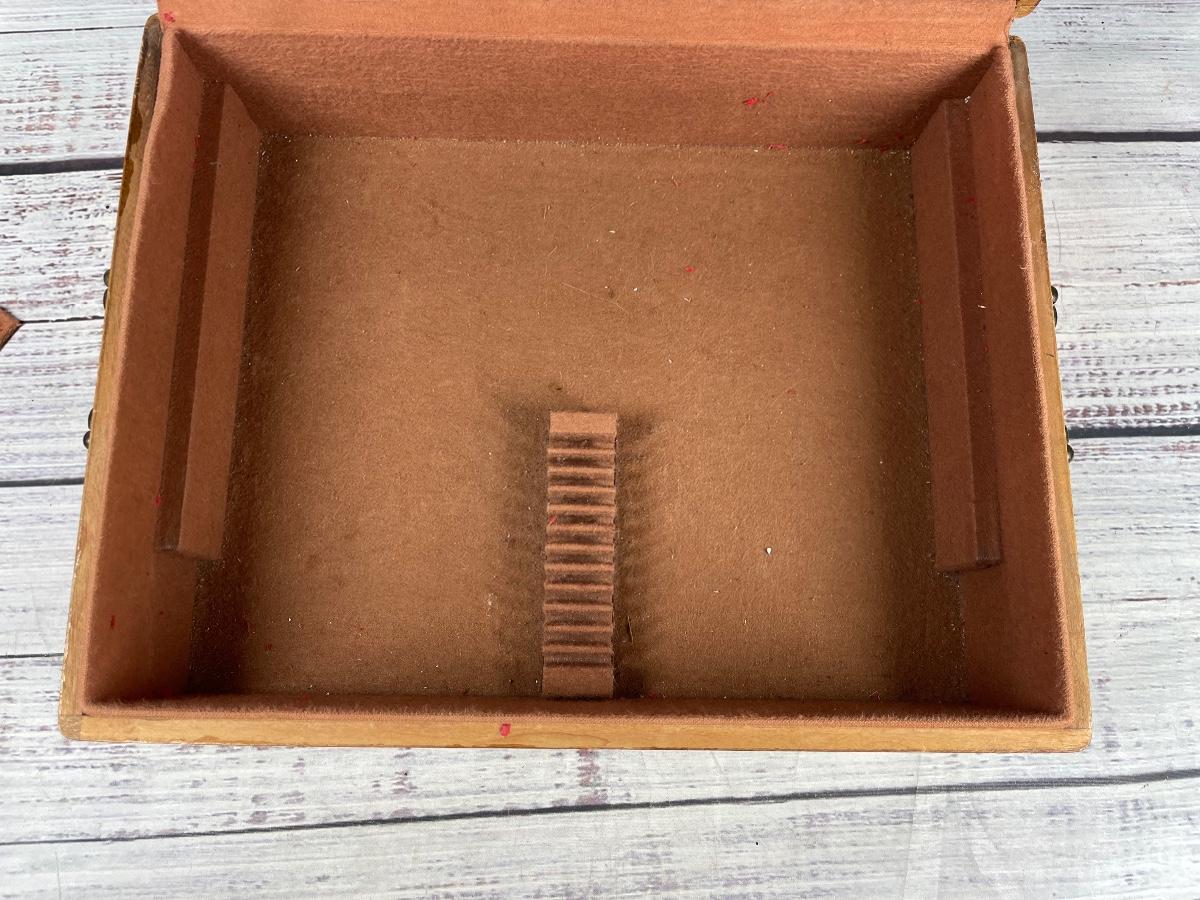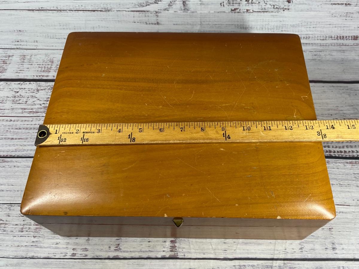 Item is in good condition. The outside is a bit scratched up and the inside is in a used condition. The box is approximately 13” wide.
