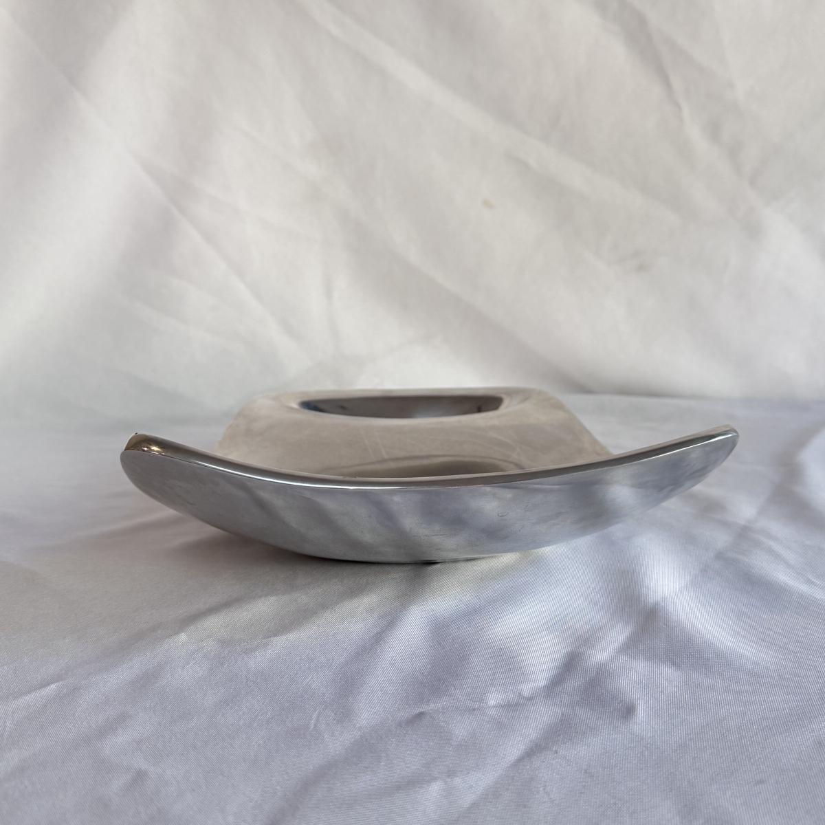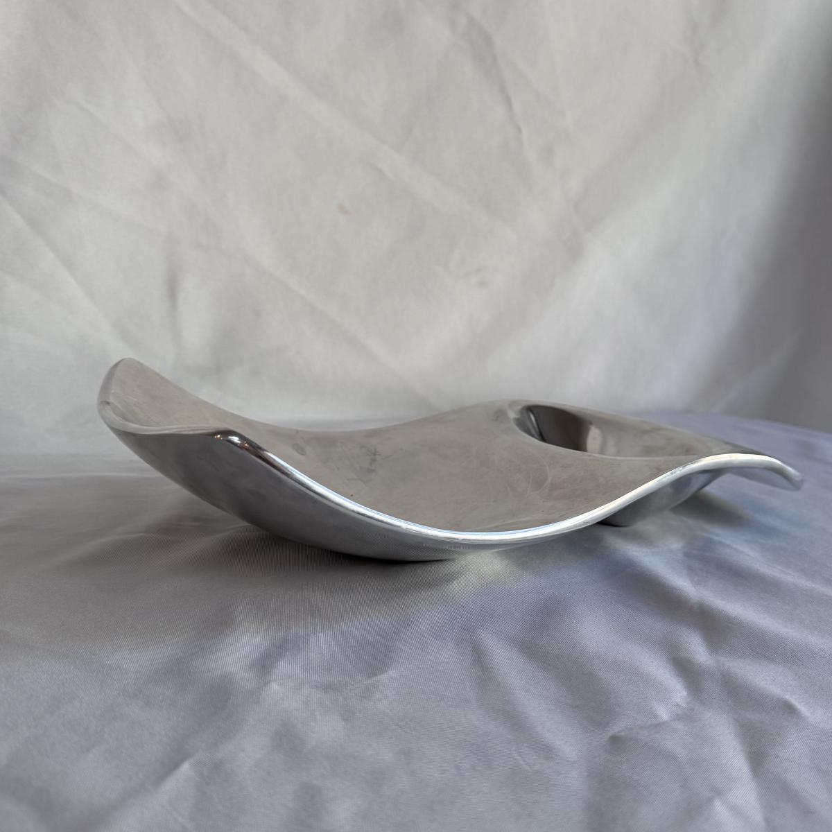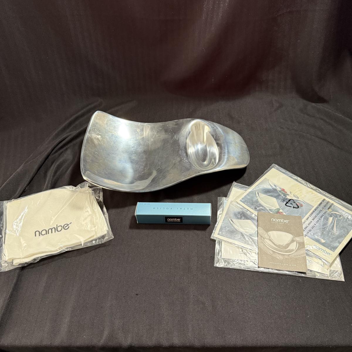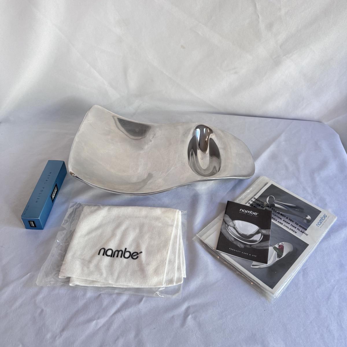 This lot includes one Nambé chip and dip server, along with a Nambé cleaning cloth, Nambé metal polish, and a few informative, unopened Nambé cards. The tray is made of thick aluminum and is stamped with Neil Cohen on the bottom. It measures 15” x 9.5” x 3.5”H. Shipping available.