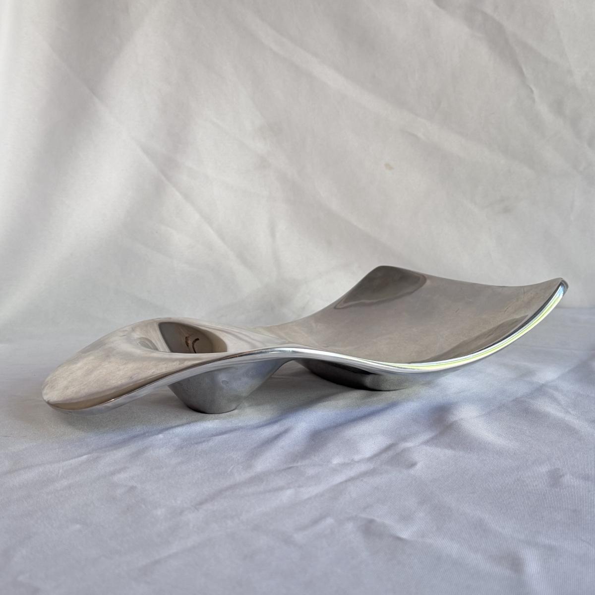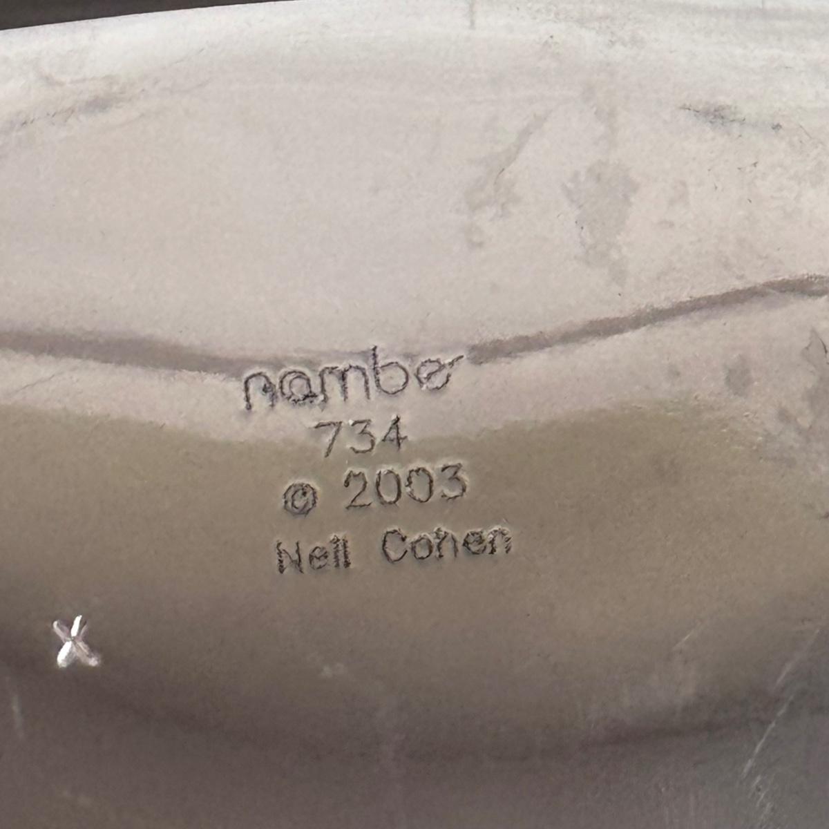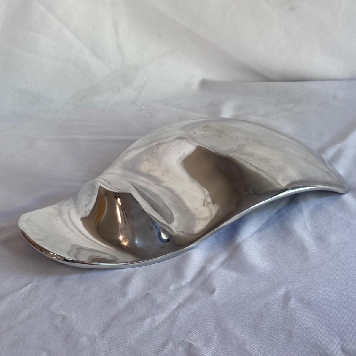 This lot includes one Nambé chip and dip server, along with a Nambé cleaning cloth, Nambé metal polish, and a few informative, unopened Nambé cards. The tray is made of thick aluminum and is stamped with Neil Cohen on the bottom. It measures 15” x 9.5” x 3.5”H. Shipping available.