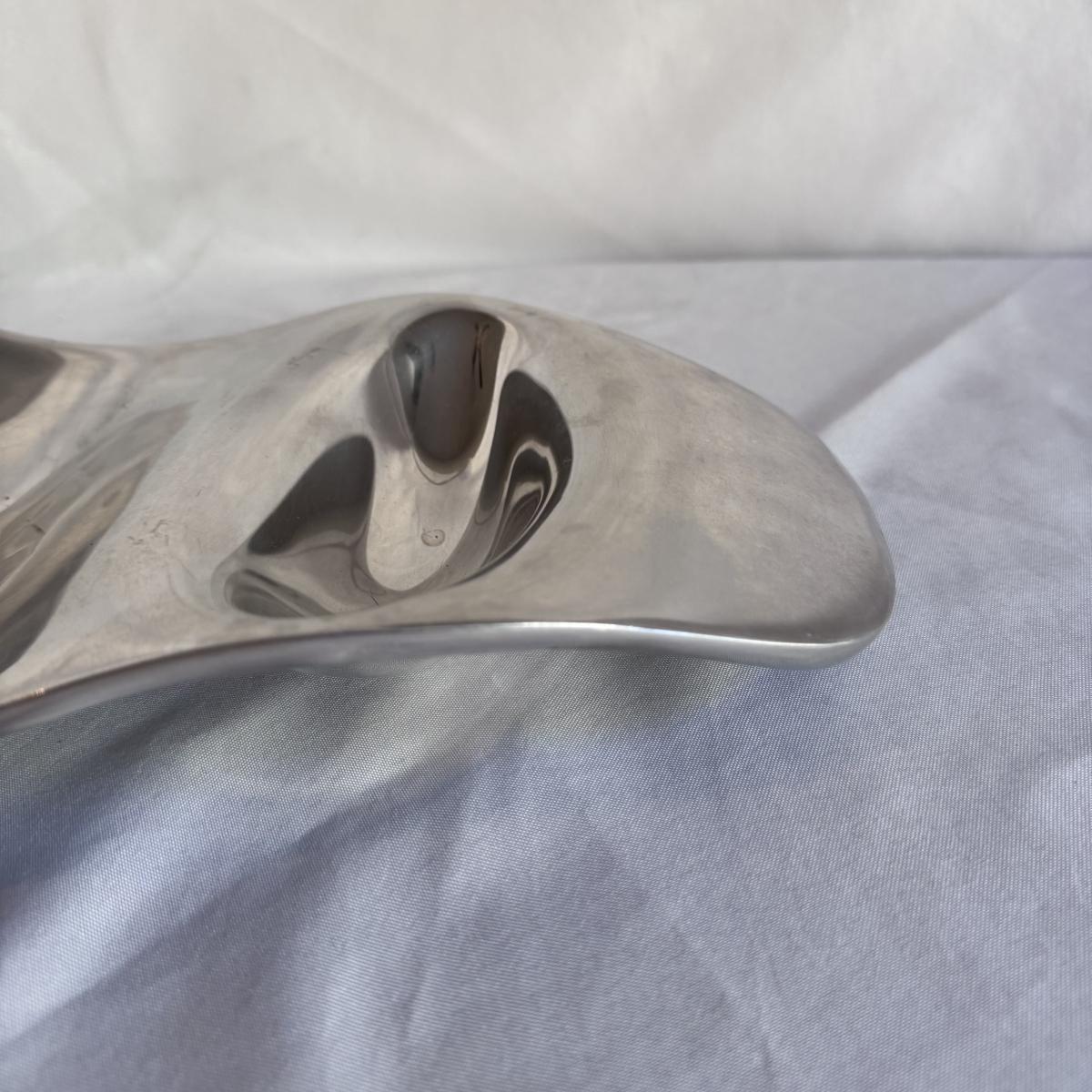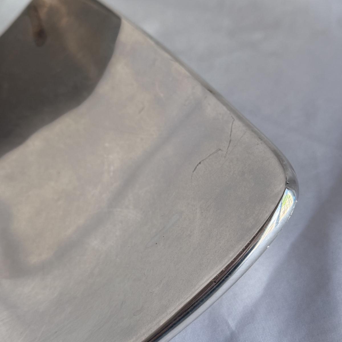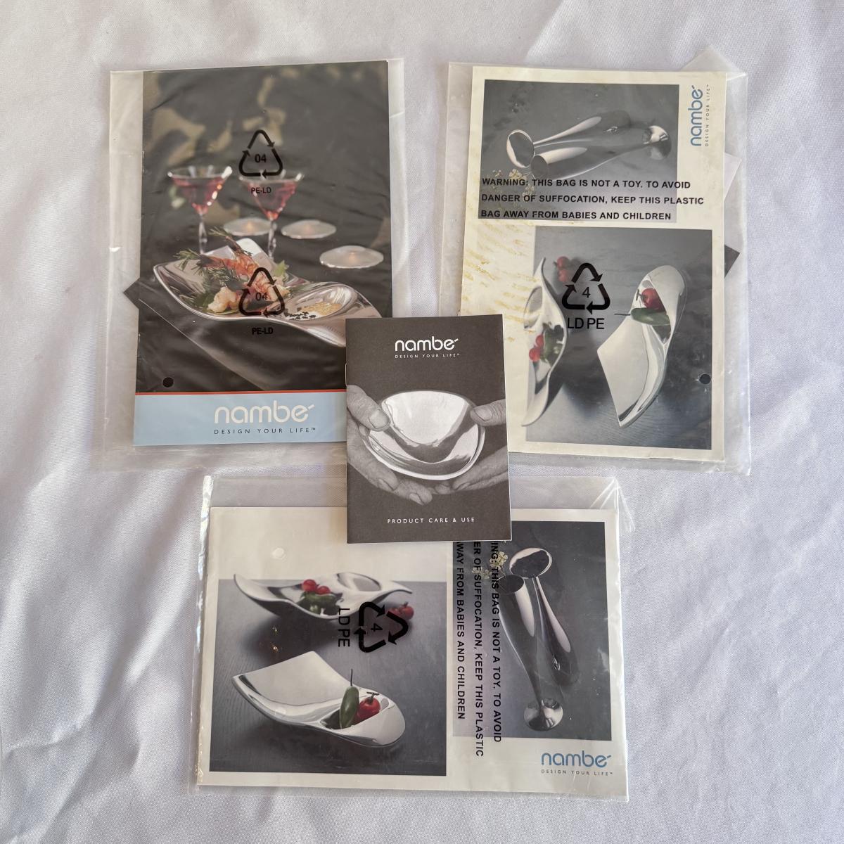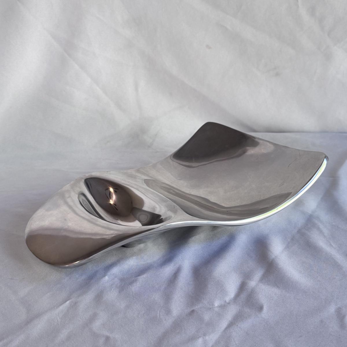 This lot includes one Nambé chip and dip server, along with a Nambé cleaning cloth, Nambé metal polish, and a few informative, unopened Nambé cards. The tray is made of thick aluminum and is stamped with Neil Cohen on the bottom. It measures 15” x 9.5” x 3.5”H. Shipping available.