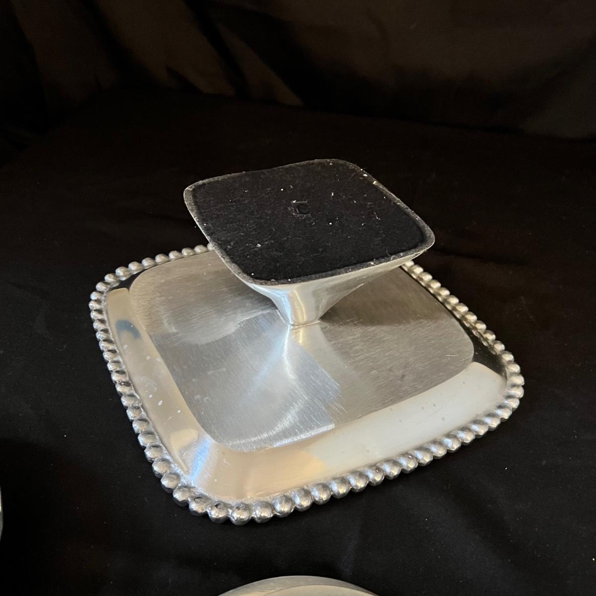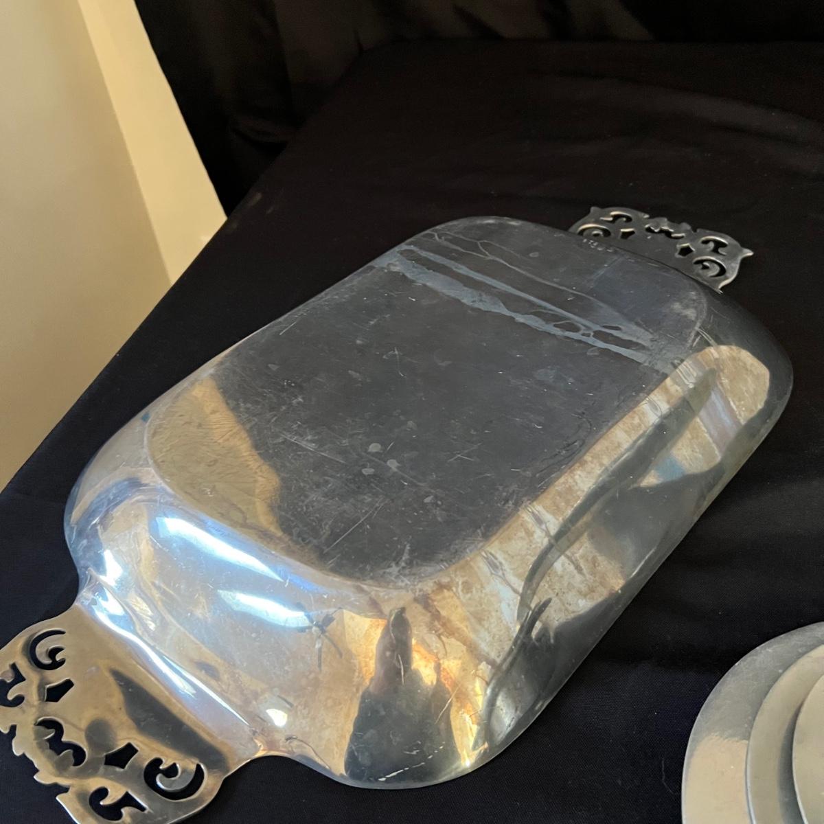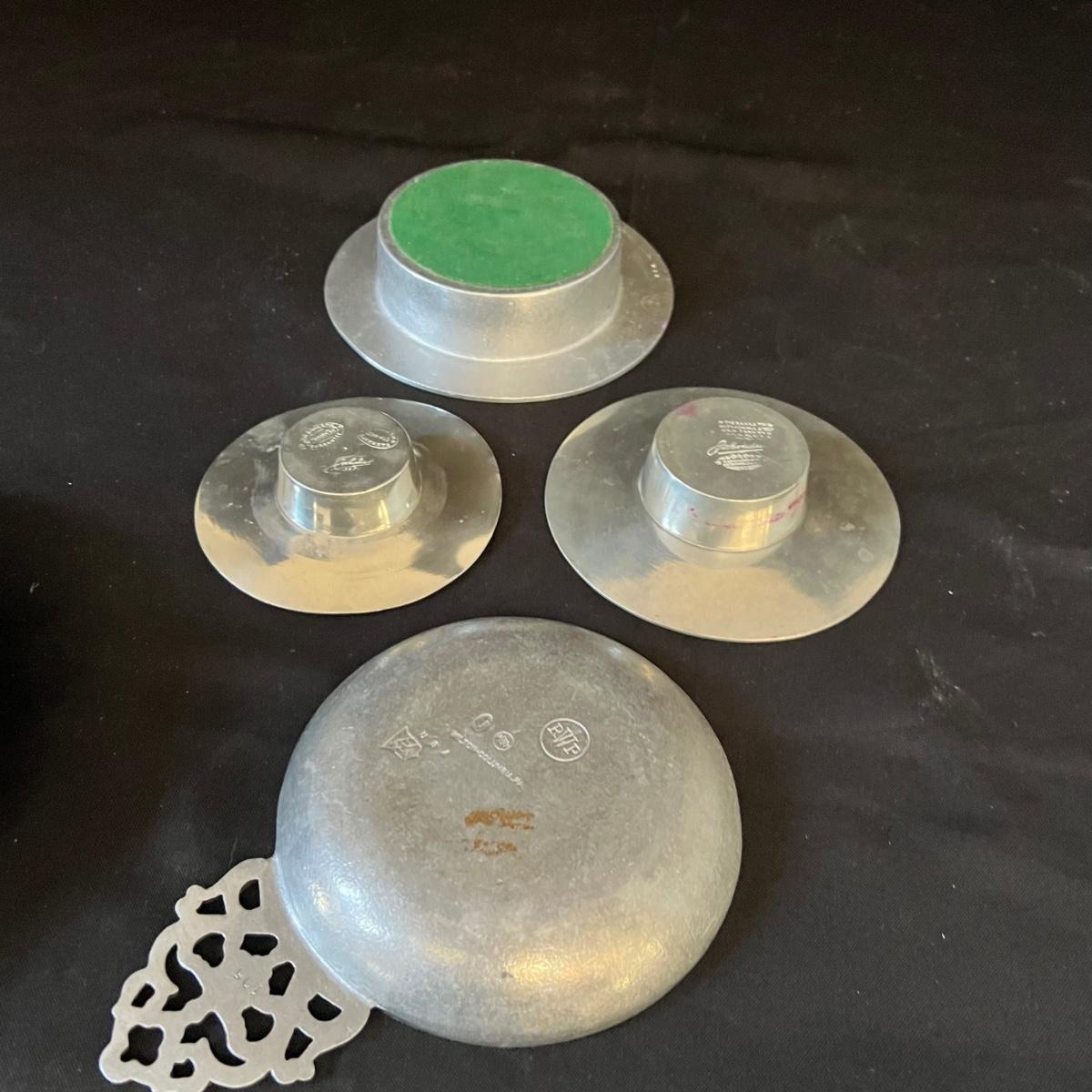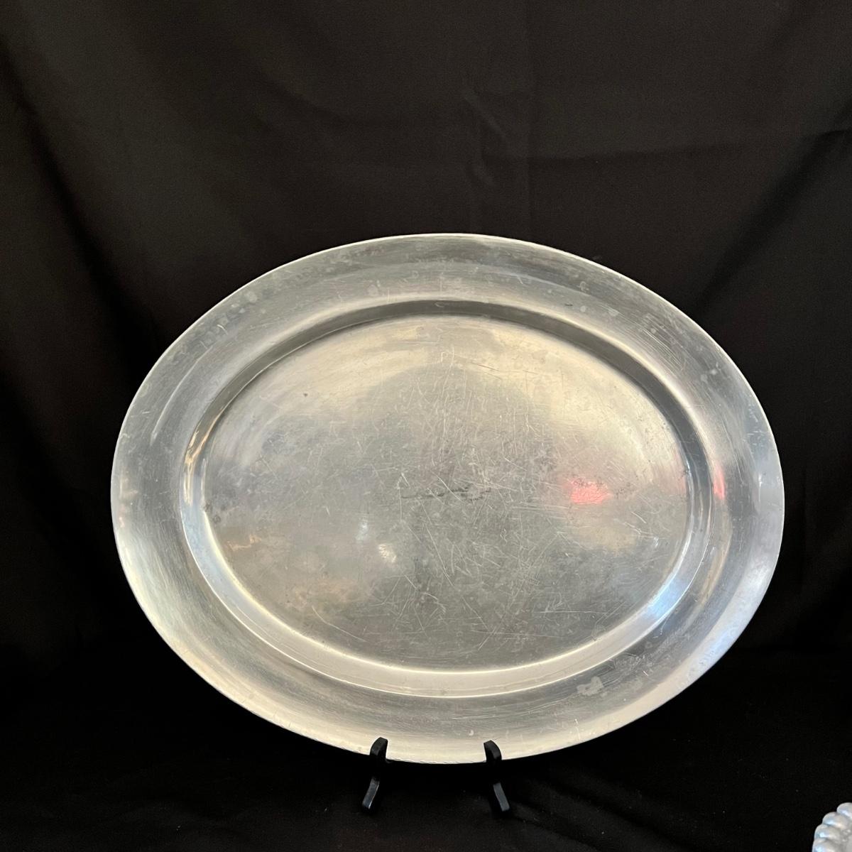 Two large platters, a cake stand and numerous small bowls make up this lot of mixed metals. Some items are RWP pewter, others appear to be heavy aluminum alloy, see images for more information. Please note the platters have some scratches.