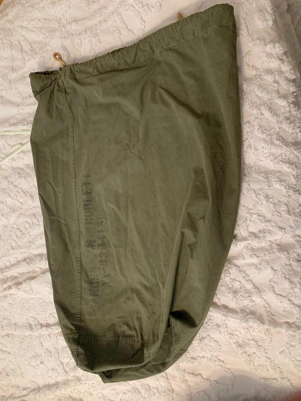 This duffle bag has an identified owner’s name stenciled “Frances Corlett”. Wear is consistent with age but there are no rips, holes or stains.
