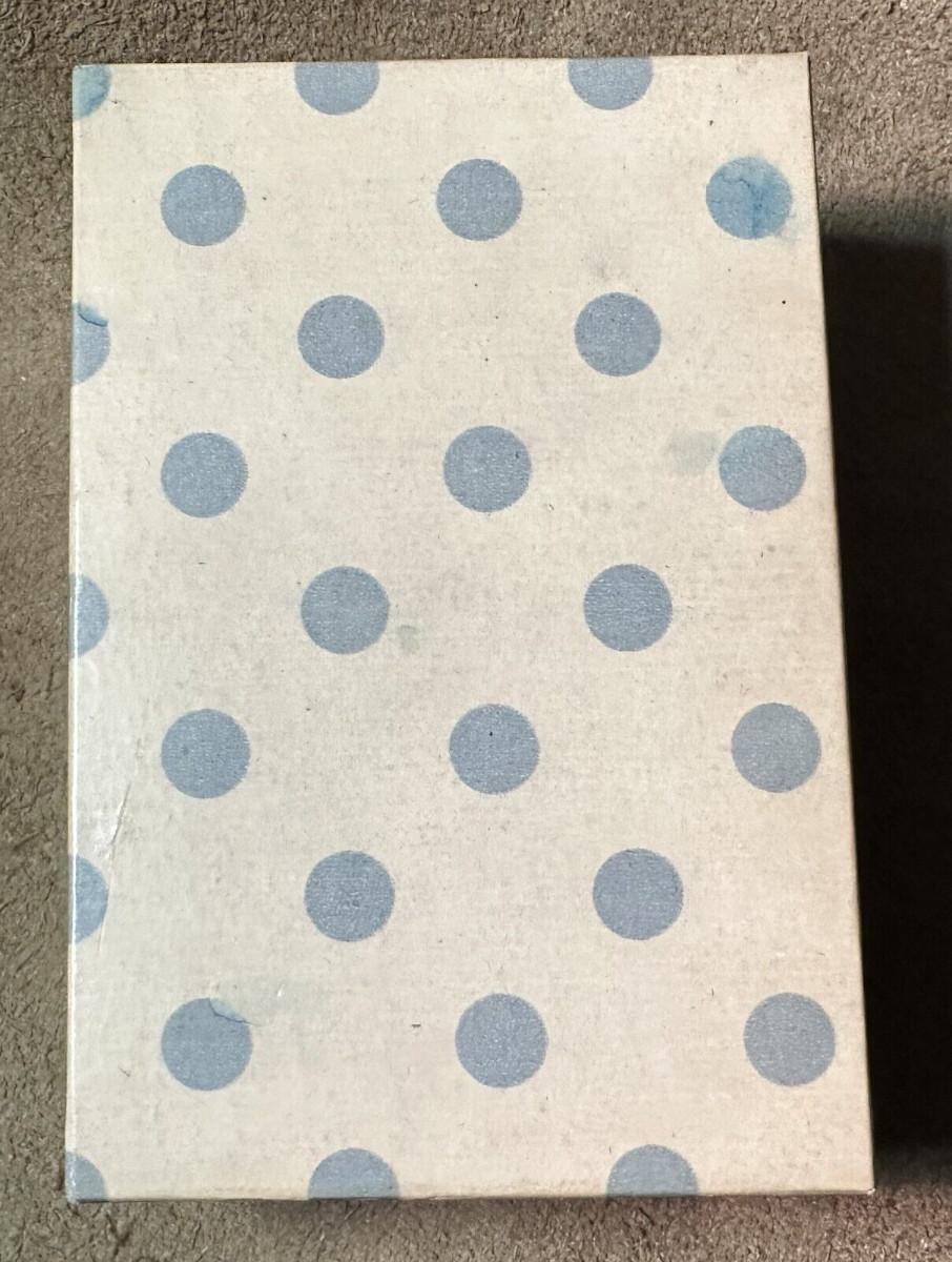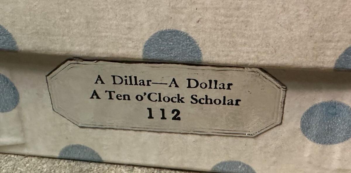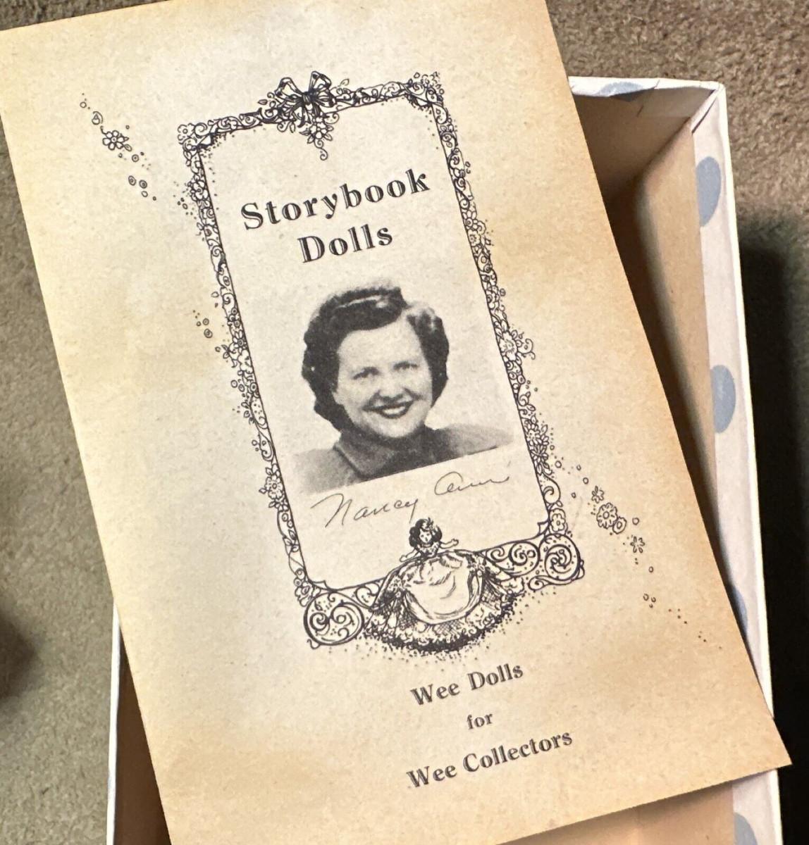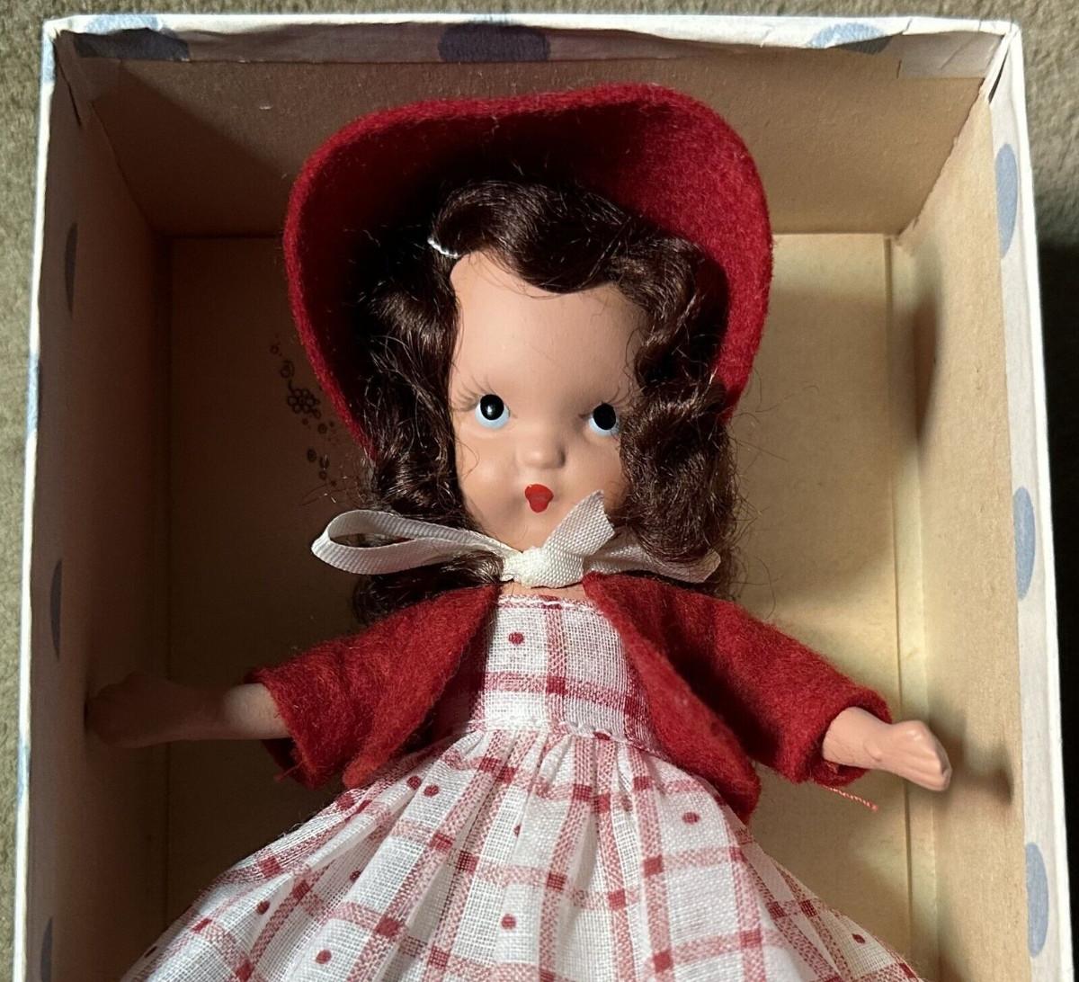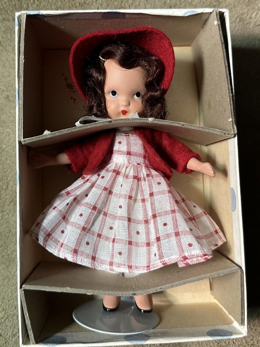 Found in her original box here is a vintage bisque Nancy Ann Storybook Doll...A Dillar A Dollar A Ten o'Clock Scholar...#112...5.5" jointed doll...Brunette hair..Red print dress and red felt jacket with hood...wrist tag..stand and catalog...as shown...Slight soiling on exterior of box with age.