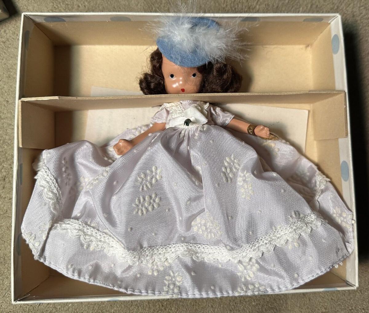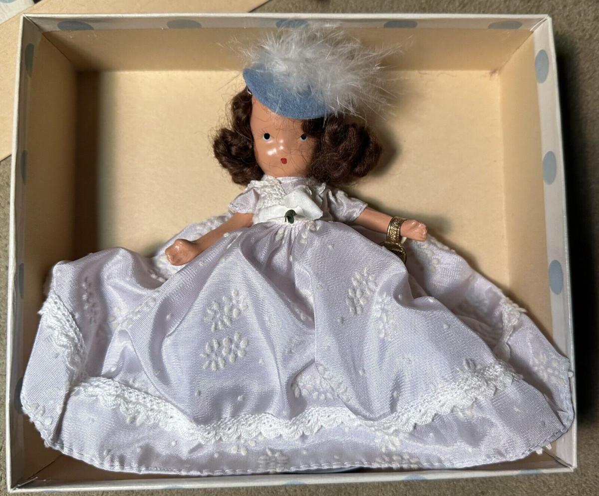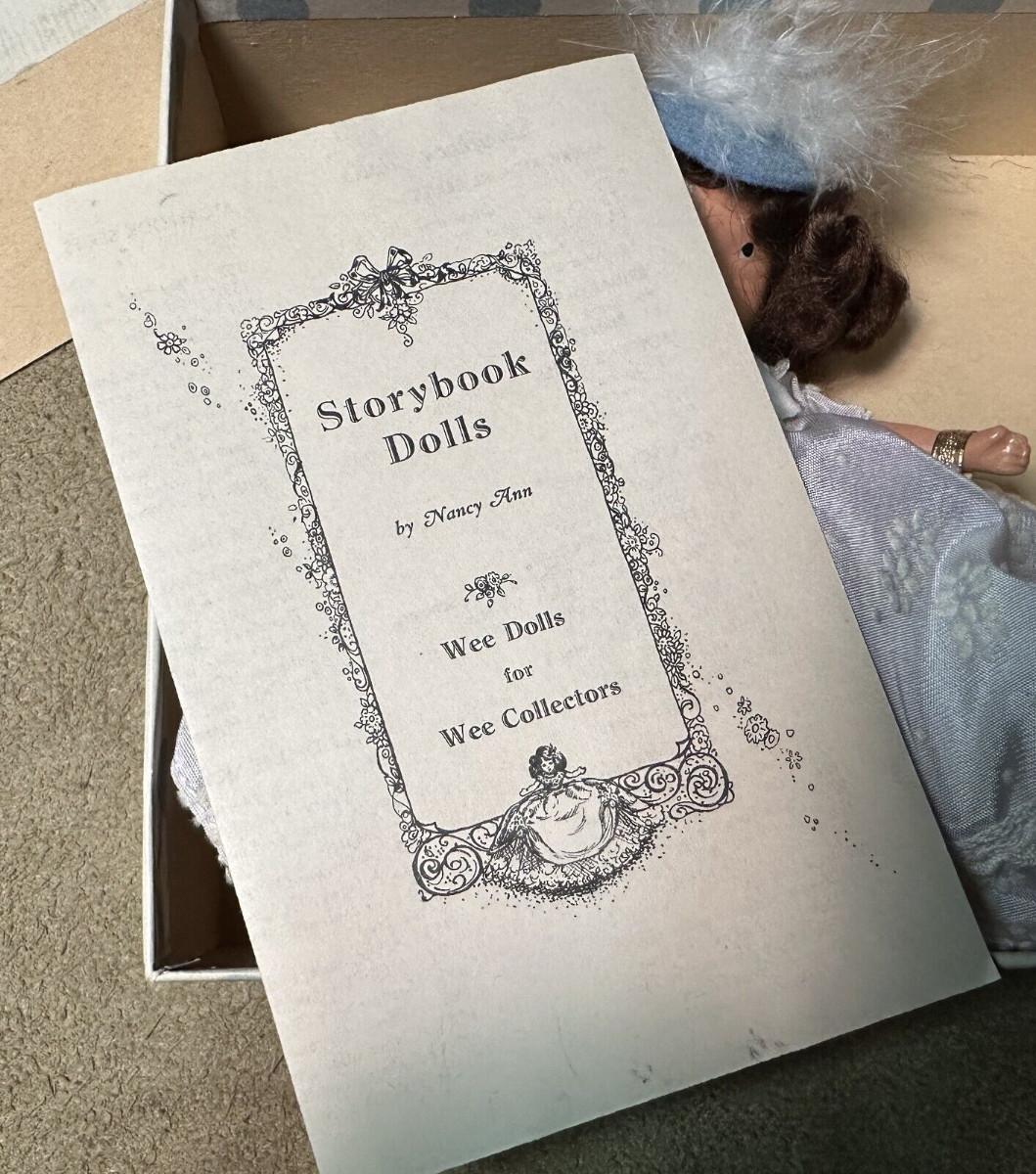 Found in her original box here is a vintage bisque Nancy Ann Storybook Doll...Beauty (from Beauty and the Beast)...#156...5" jointed doll...Brunette hair..White dress and blue felt hat...with wrist tag and stand and catalog...as shown...Slight soiling on exterior of box with age.