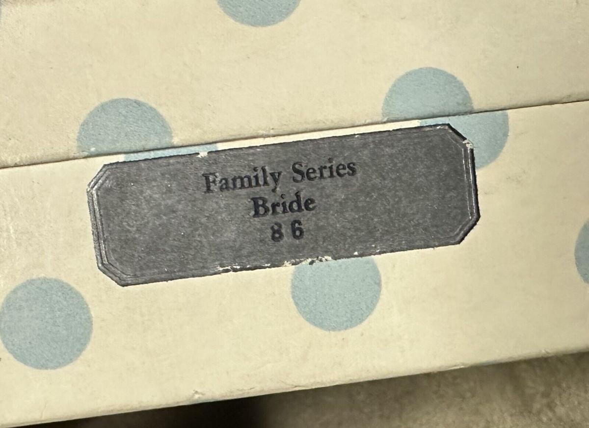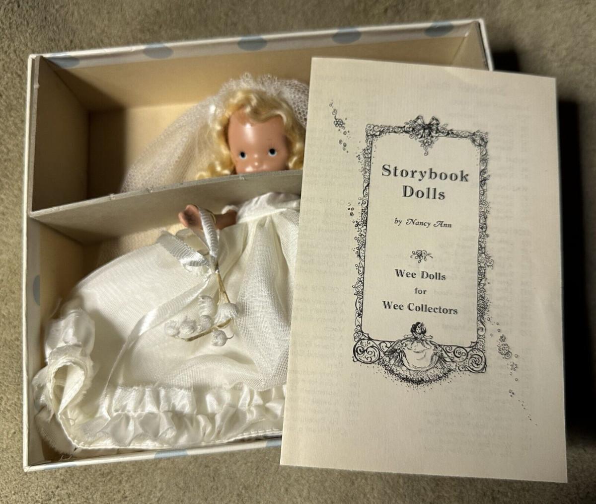 Found in her original box here is a vintage bisque Nancy Ann Storybook Doll...the Bride...#86...Just 5.25" tall..jointed doll...Blonde hair...Satin bridal gown...with wrist tag and stand...as shown...Slightest soiling on exterior of box with age.