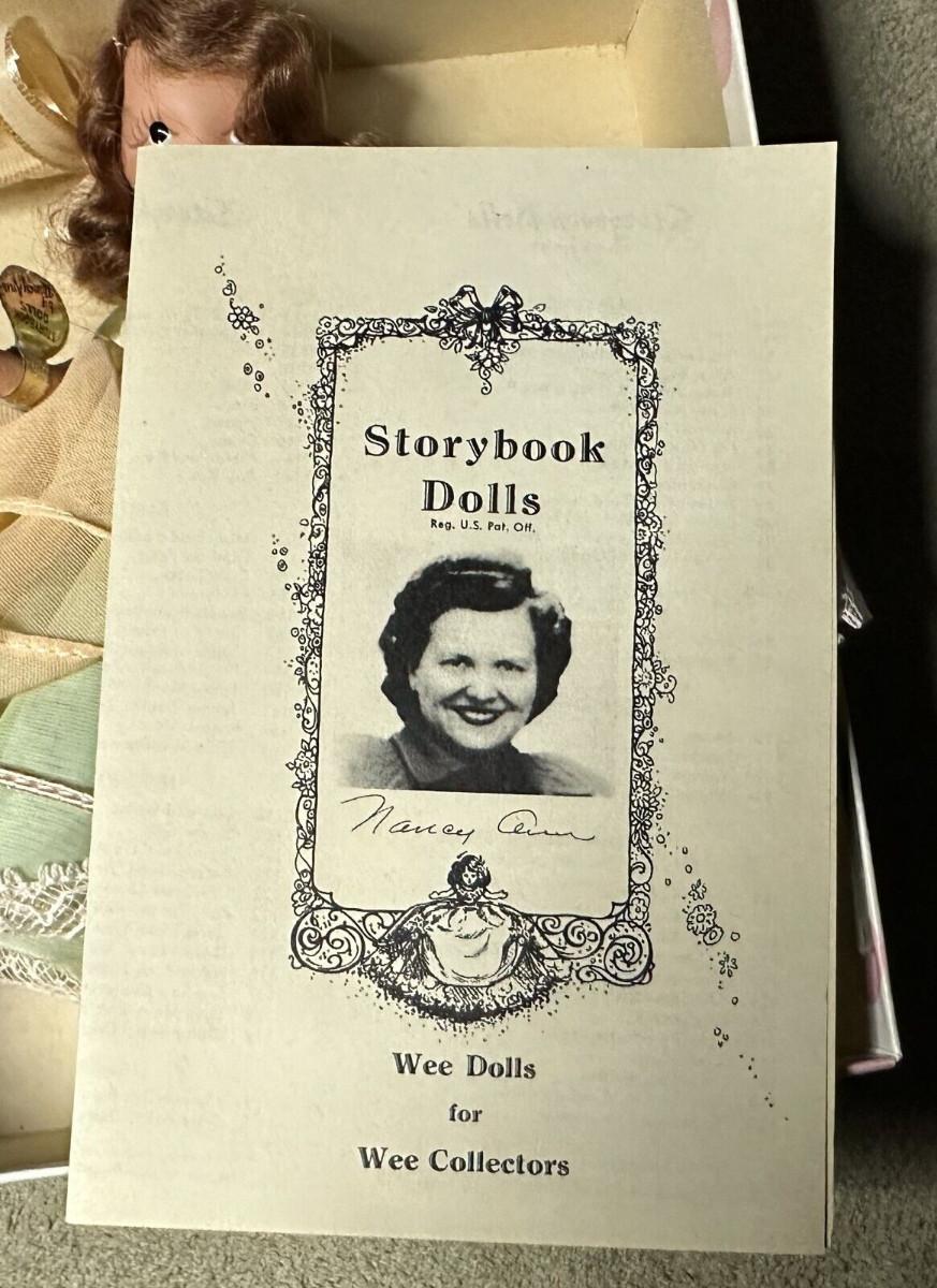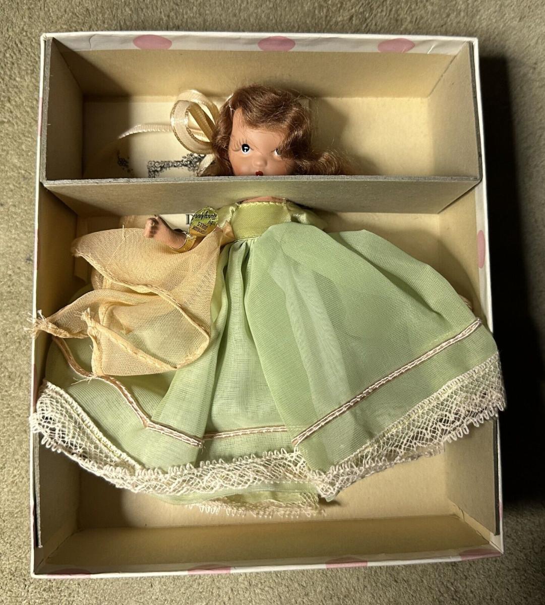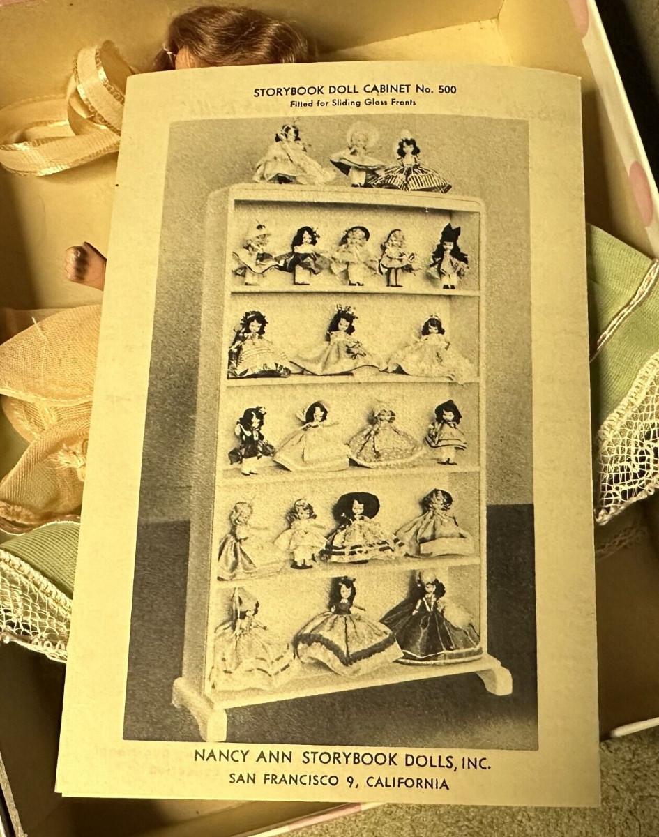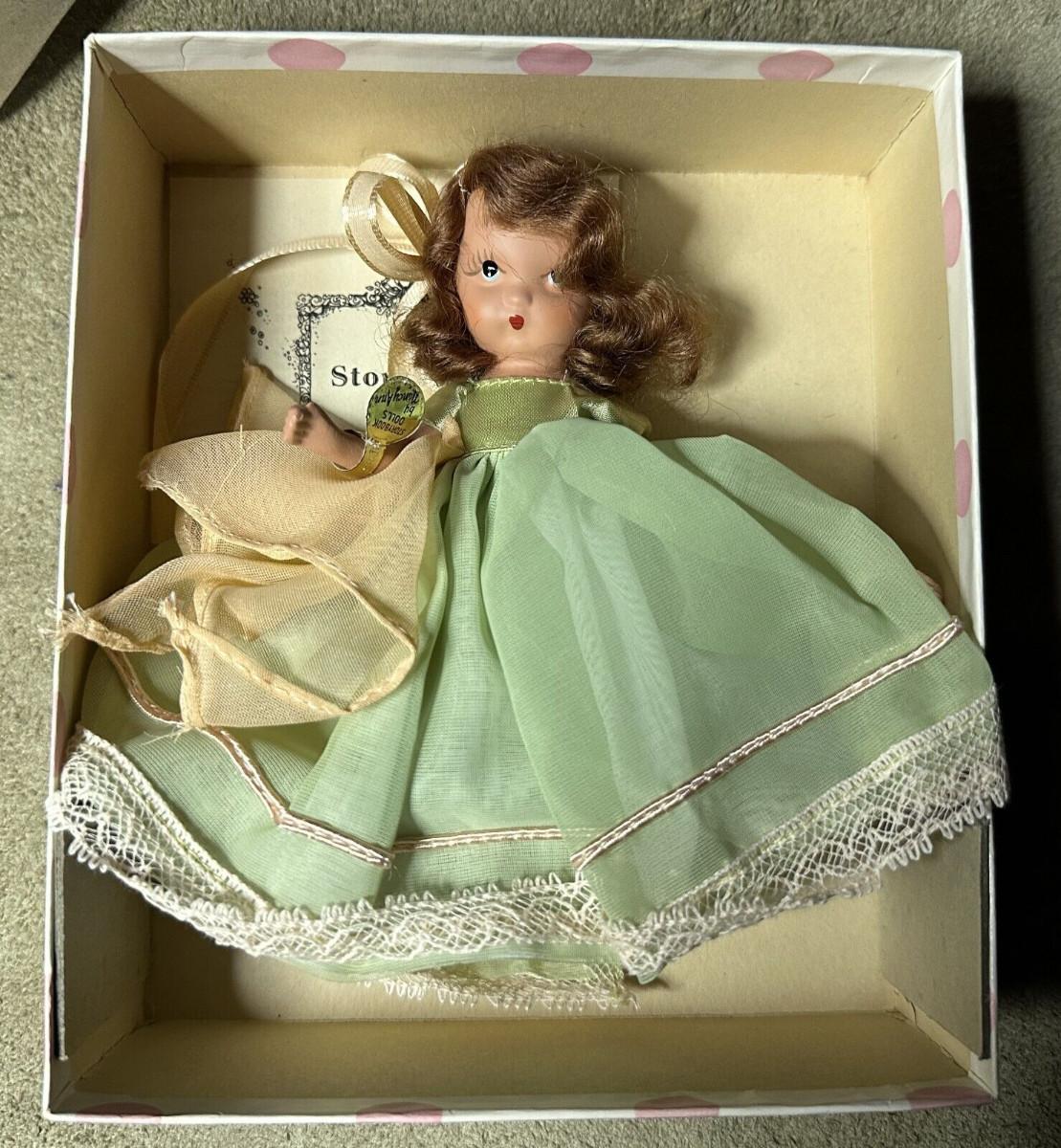 Found in her original box here is a vintage bisque Nancy Ann Storybook Doll...Wednesday's Child is Full of Woe 182...5.5" jointed doll...Auburn hair..Green foil skirt with peach hankie and peach hair ribbon...wrist tag and stand...as shown...Slightest soiling on exterior of box with age.