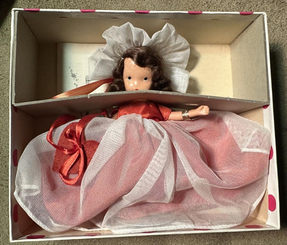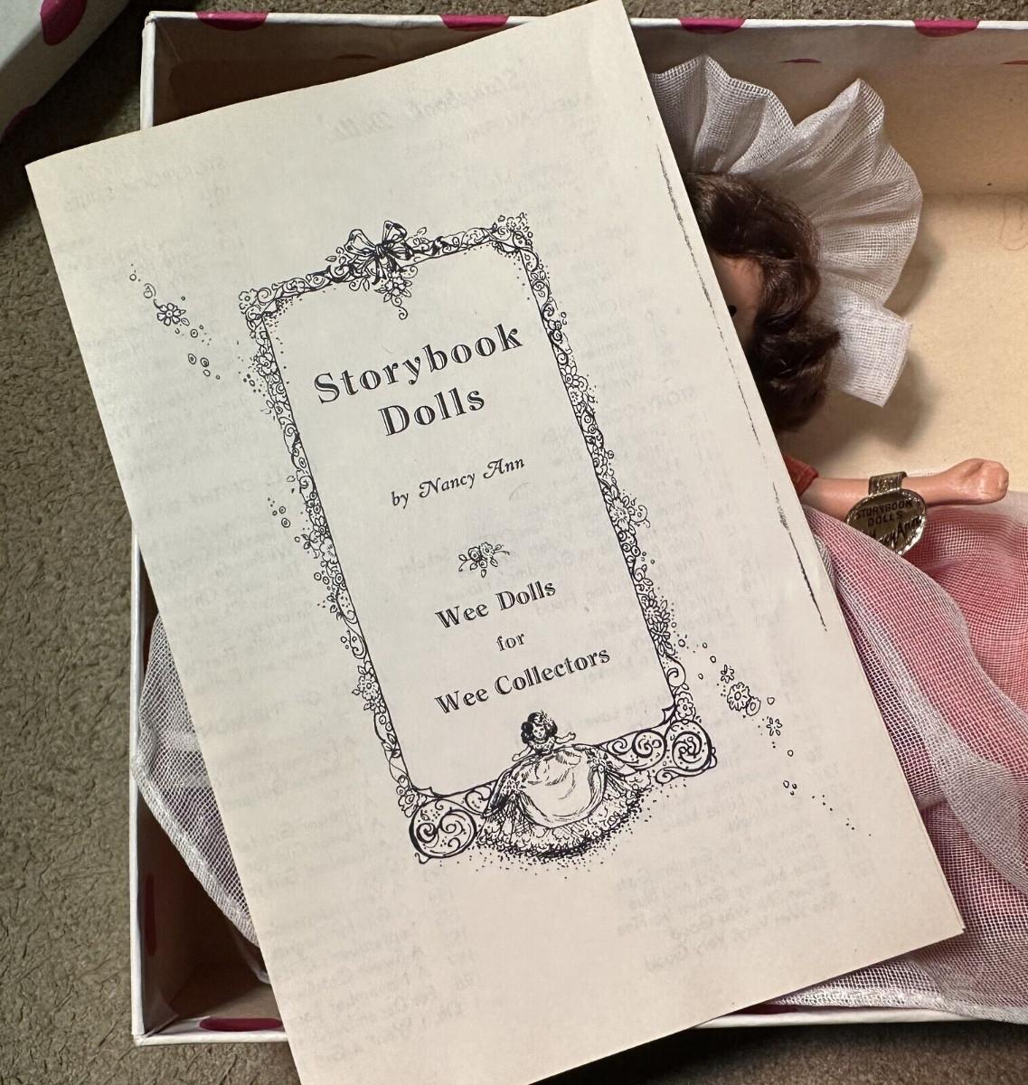 Found in her original box here is a vintage bisque Nancy Ann Storybook Doll...Queen of Hearts...Seasons series #157...5" jointed doll...Dark brown hair..Red dress with white lace overlay with a satin heart...wrist tag..stand and catalog...as shown...Slight soiling on exterior of box with age
