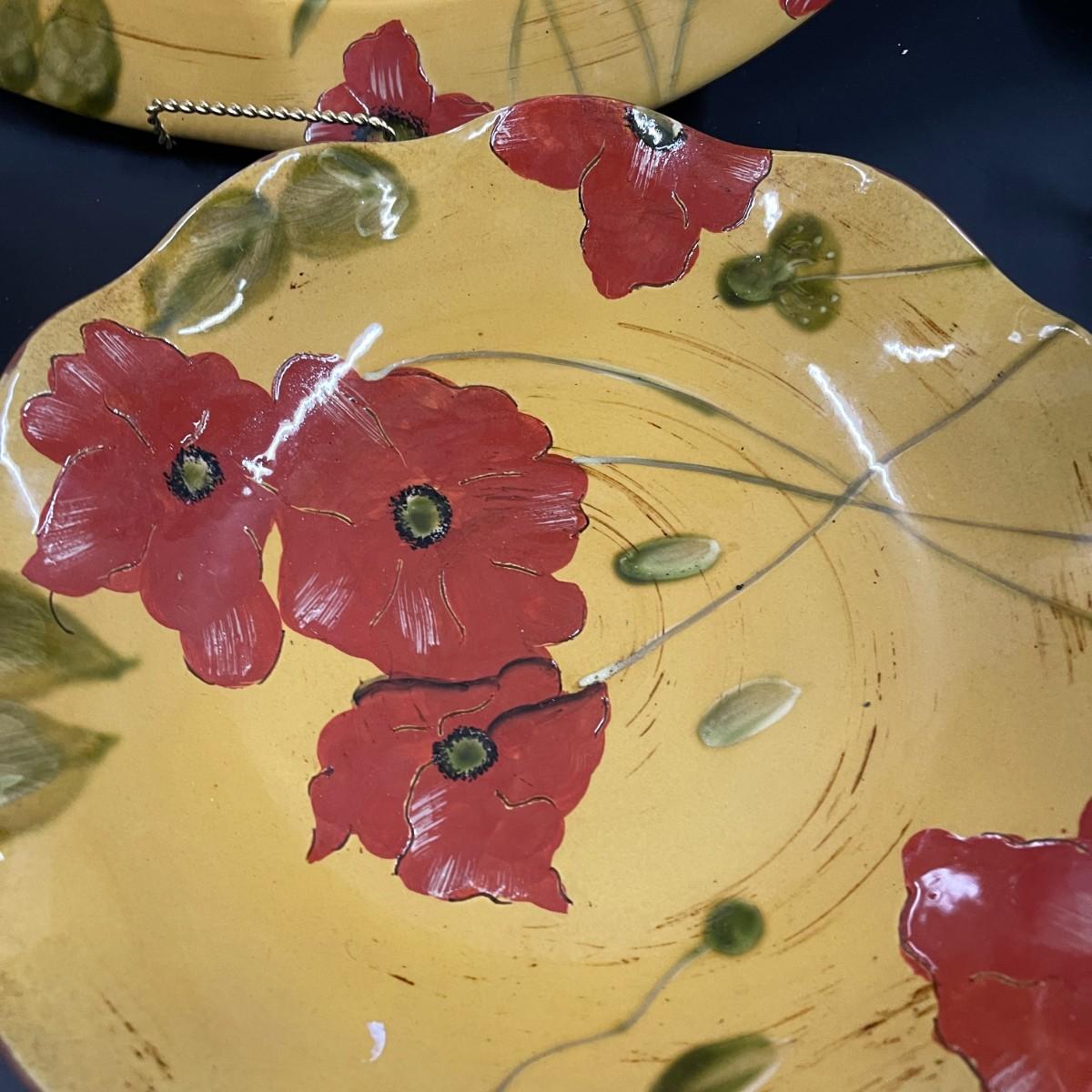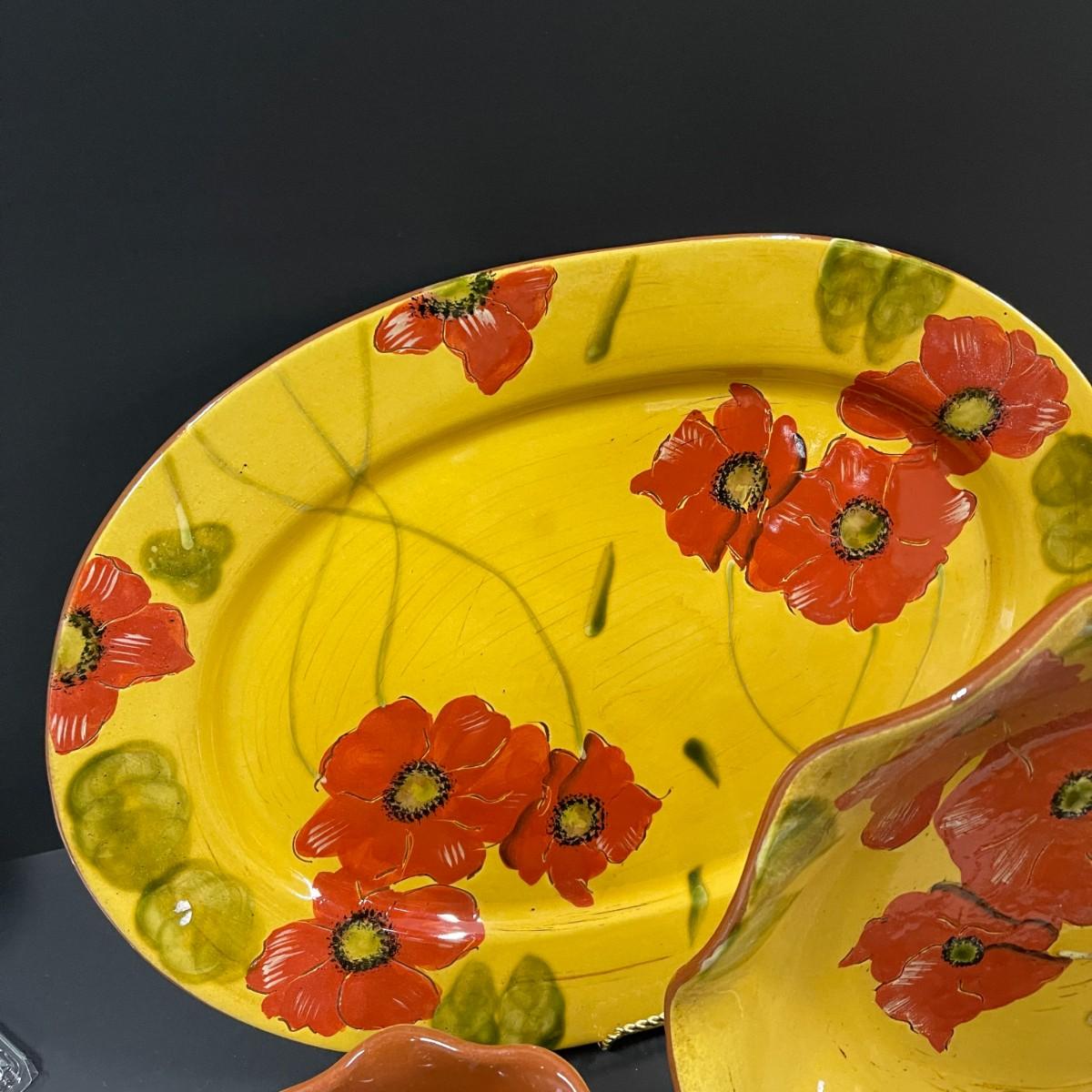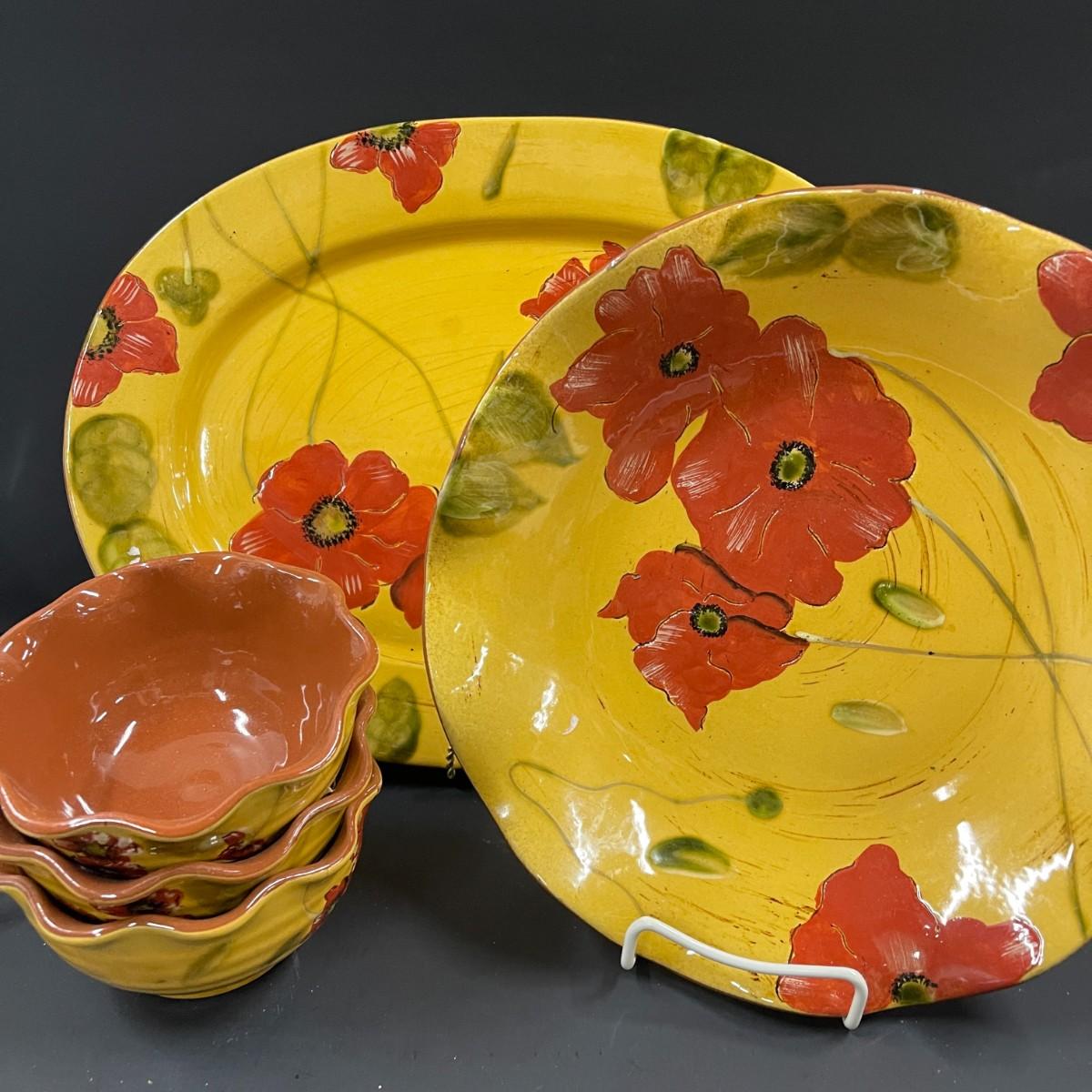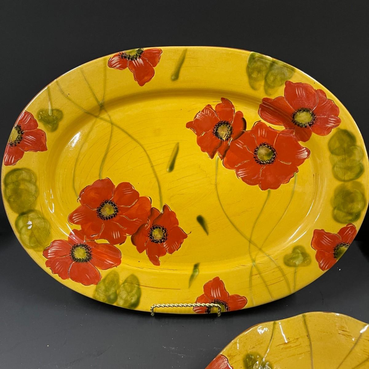 Nanette Vacher for Ambiance Collection, Fleur Rouge Dishes. Includes large oval platter, round platter and 3 small round bowls. Very good condition.