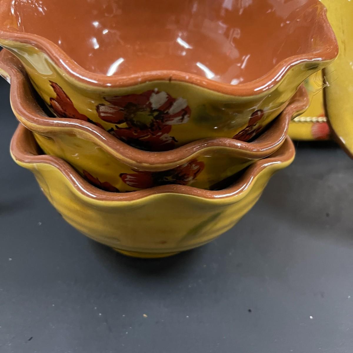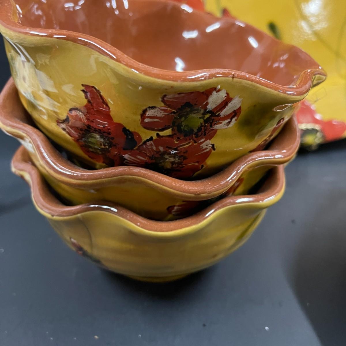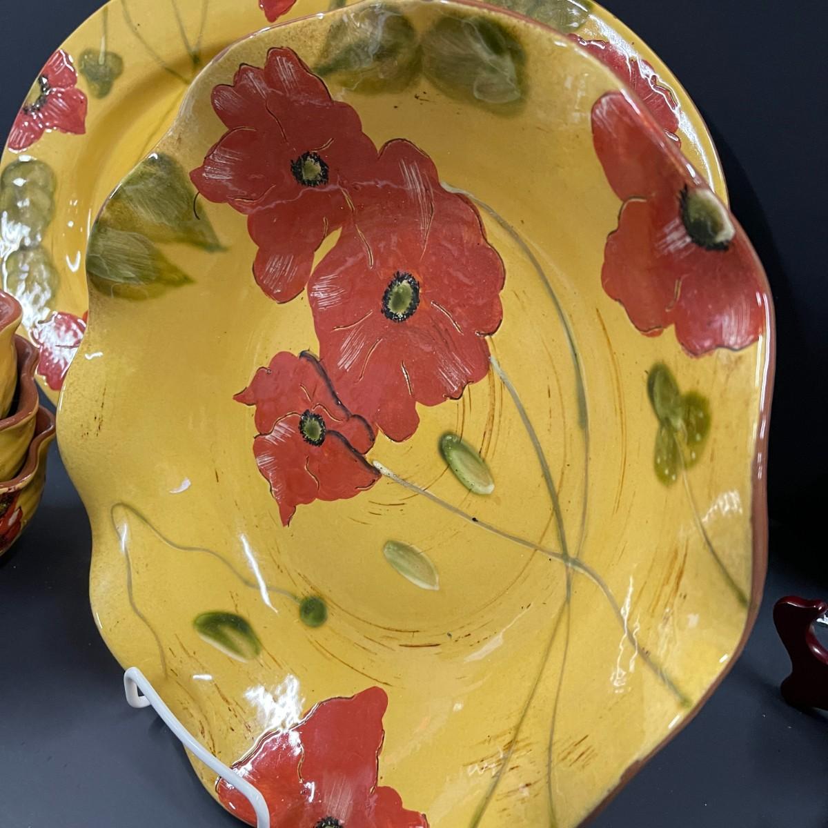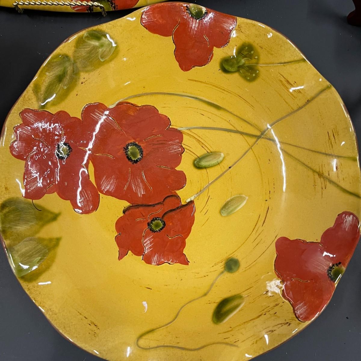 Nanette Vacher for Ambiance Collection, Fleur Rouge Dishes. Includes large oval platter, round platter and 3 small round bowls. Very good condition.