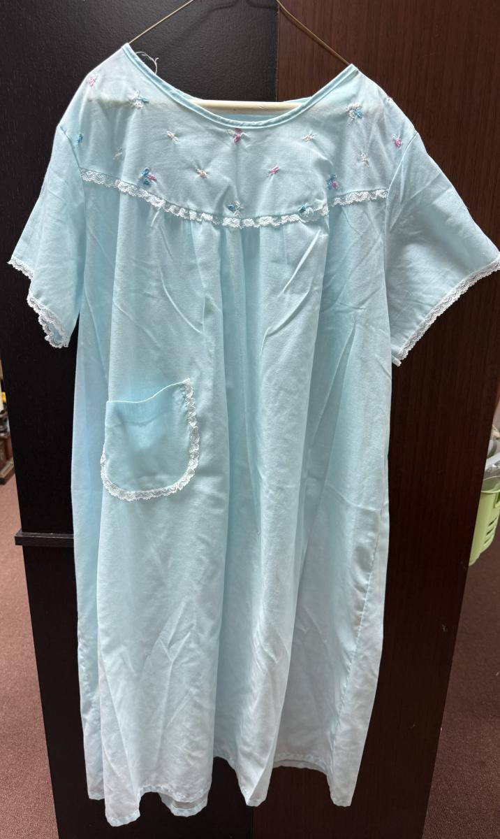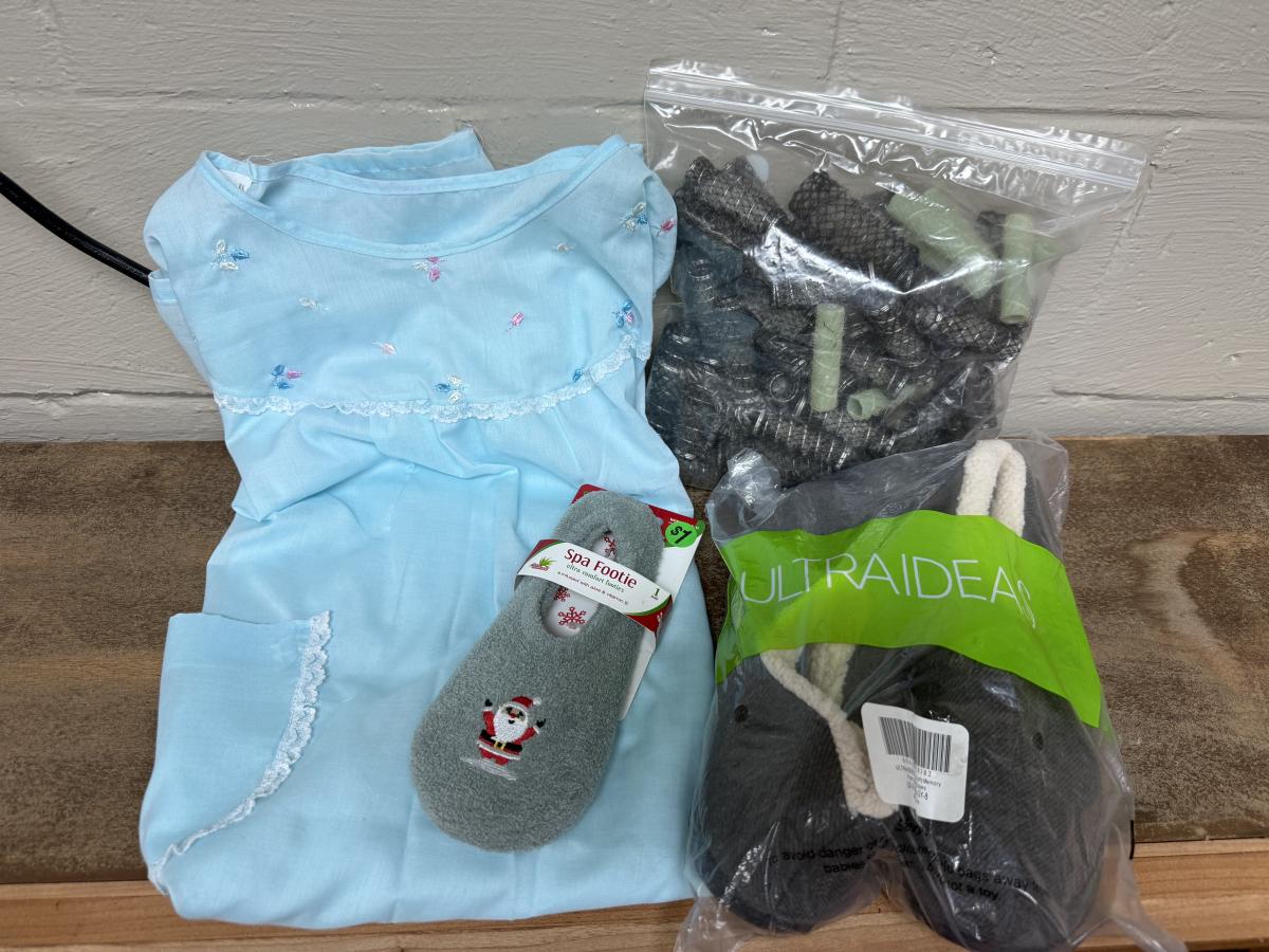 Fashionable hospital gown sz lg, slippers sz 8, vintage curlers