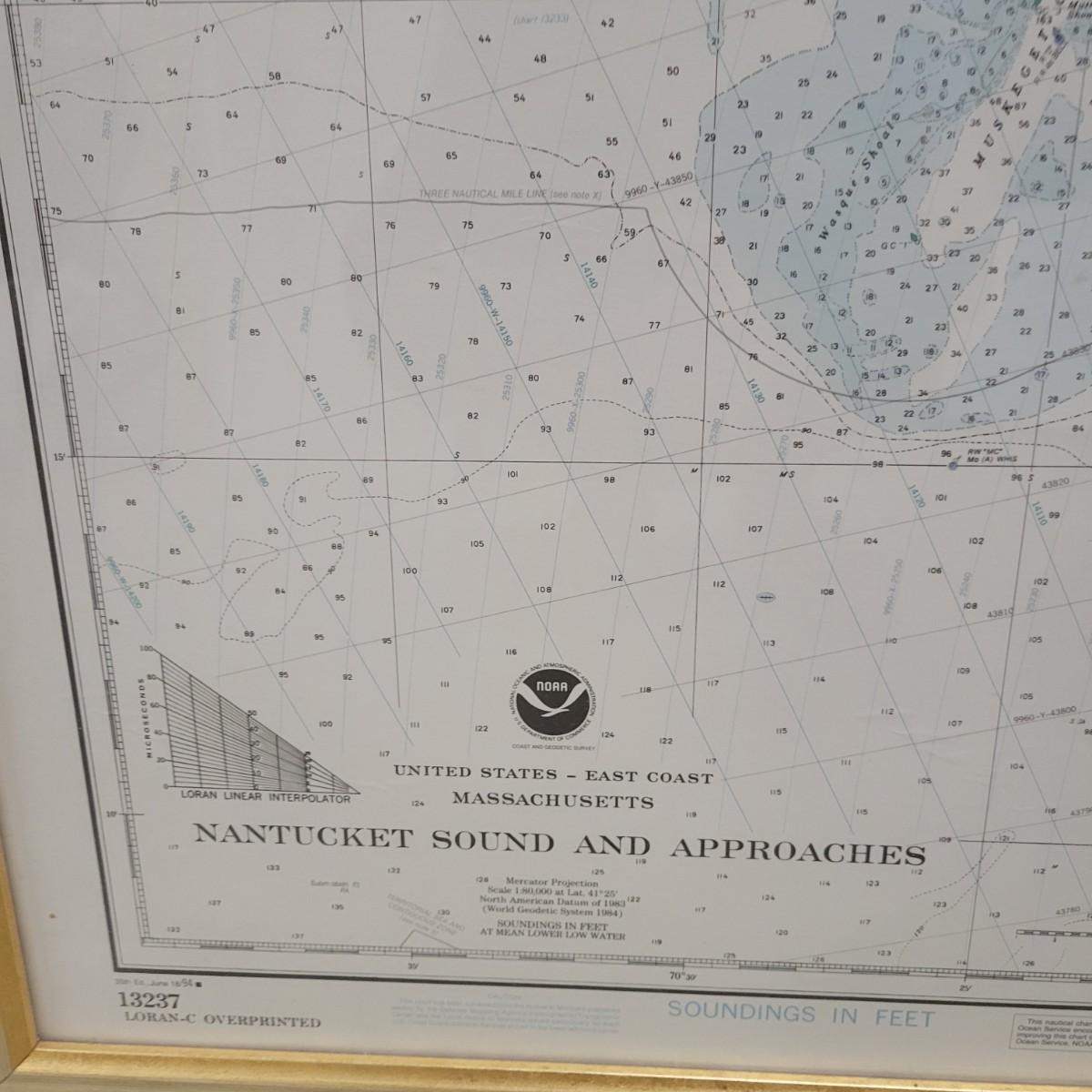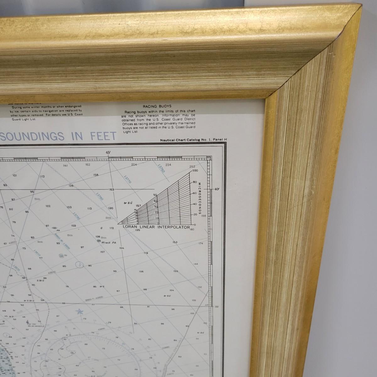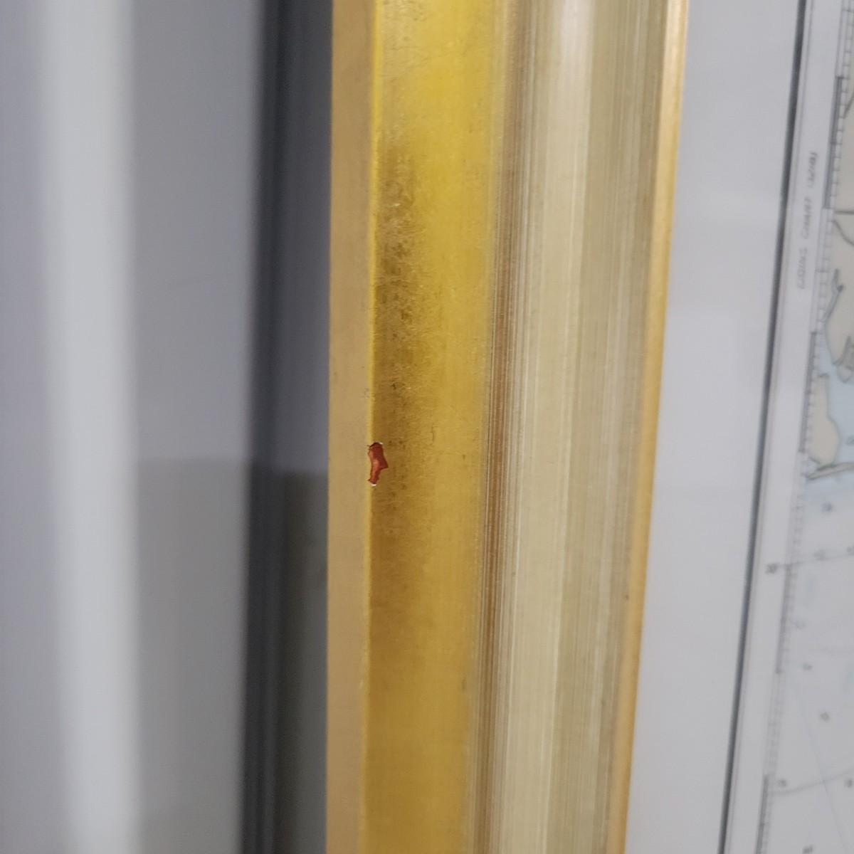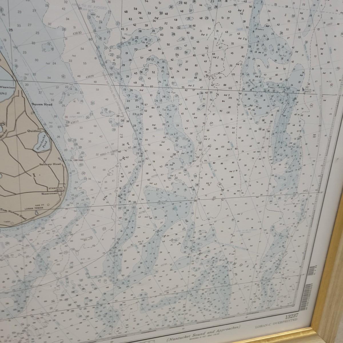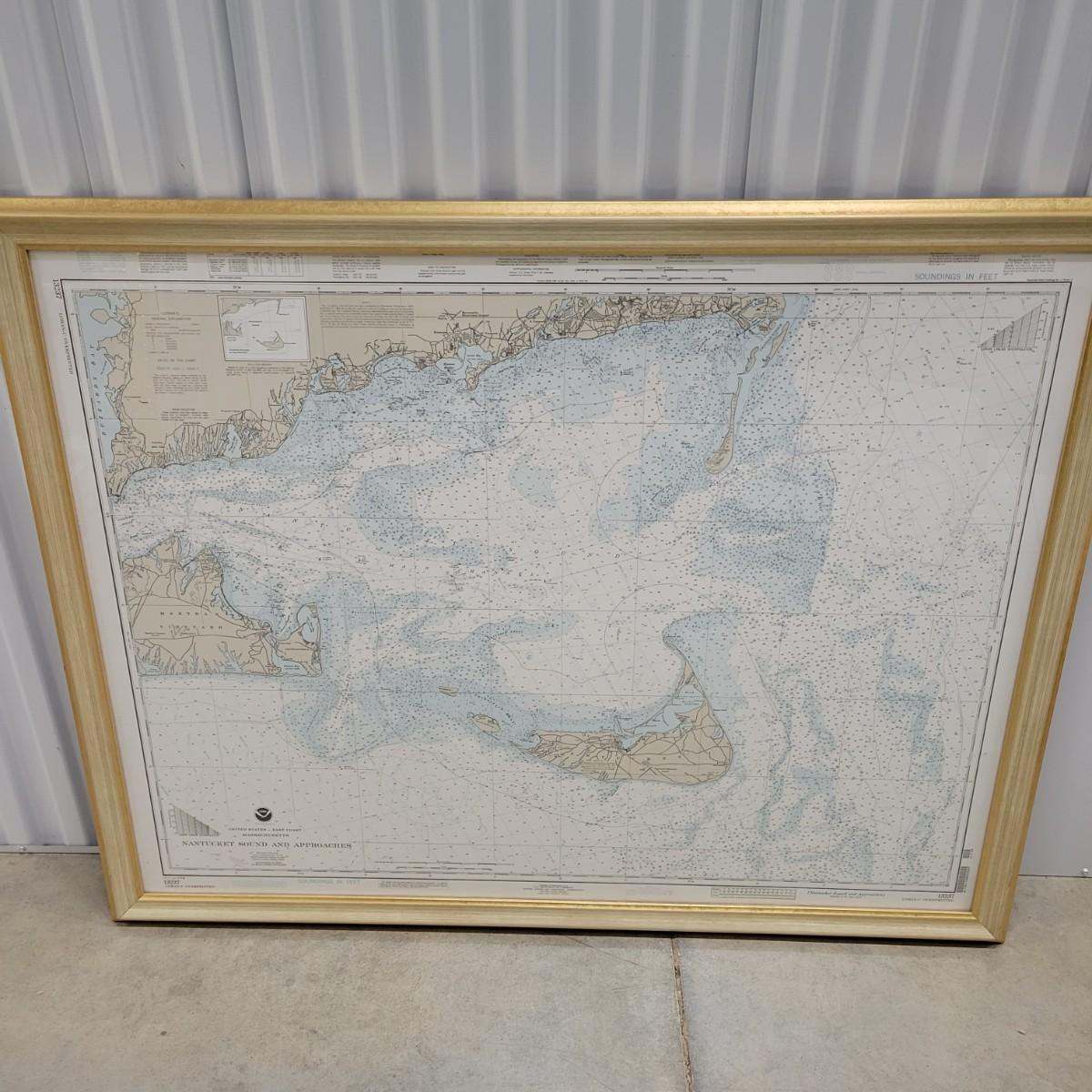 A large nautical map of Nantucket Sound and its approaches in a distressed gold frame. In good condition with a few minor blemishes on the frame. Backing paper is a little torn and hanging wire will need to be attached to hang. See attached pictures. Measures approximately 48" x 38" x 1.5"