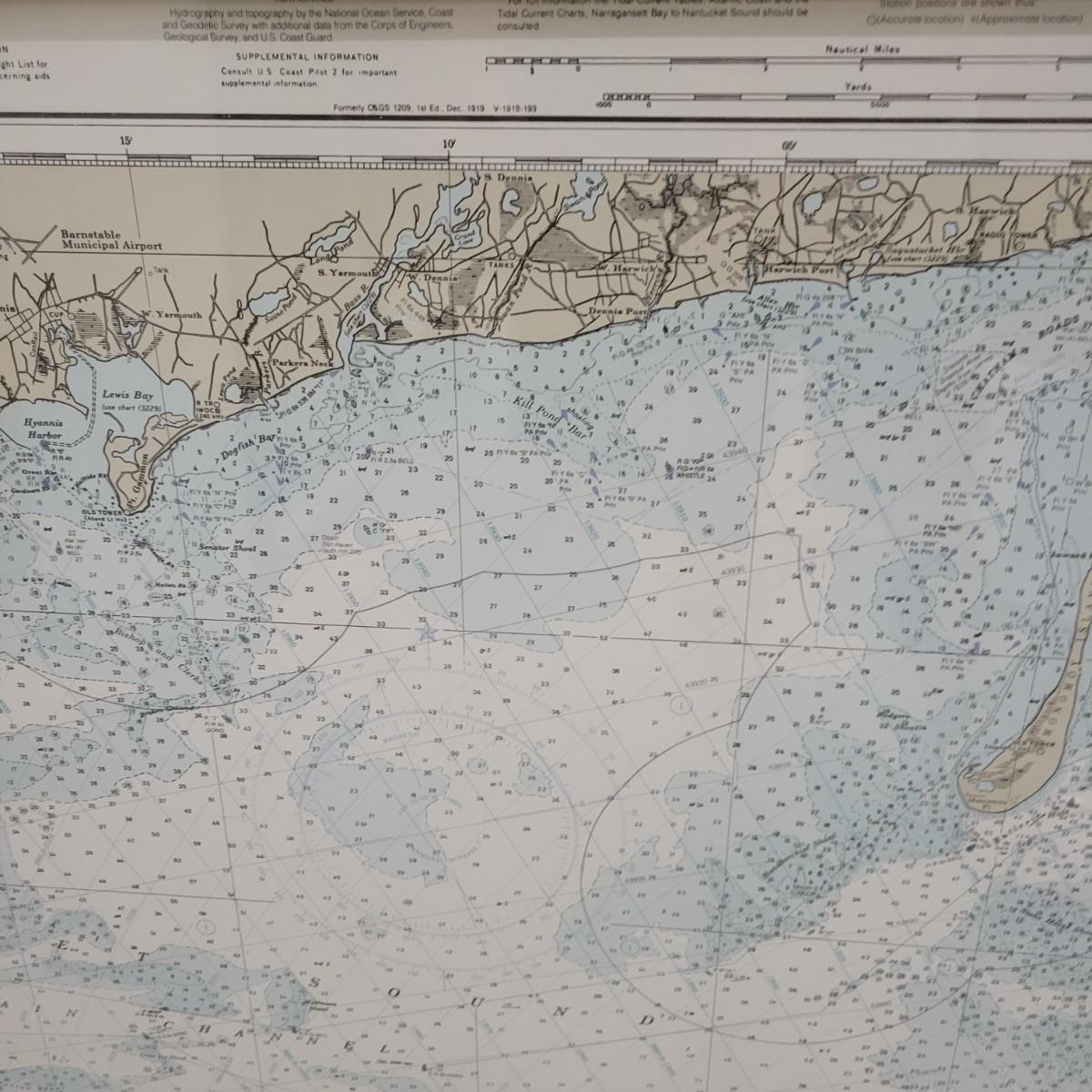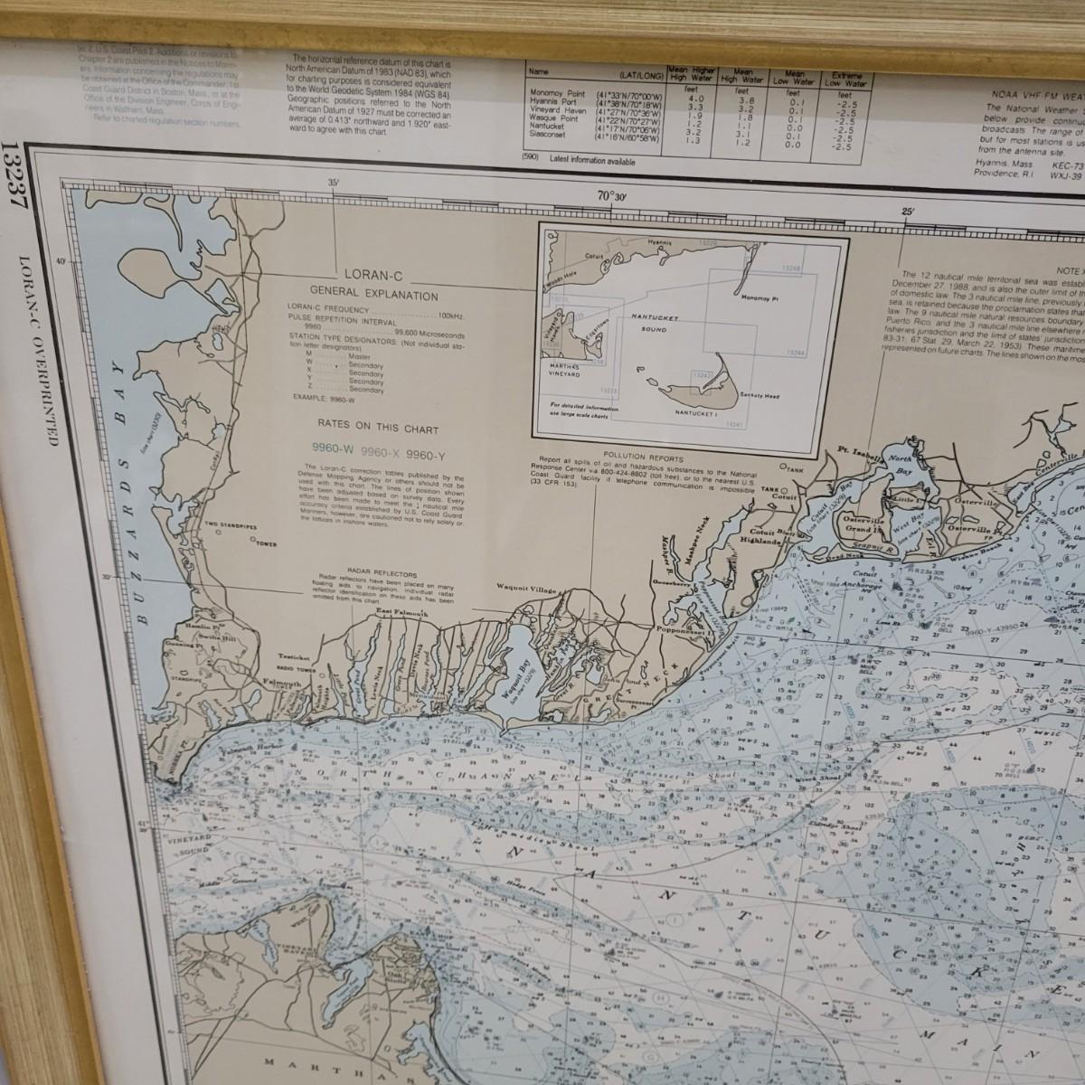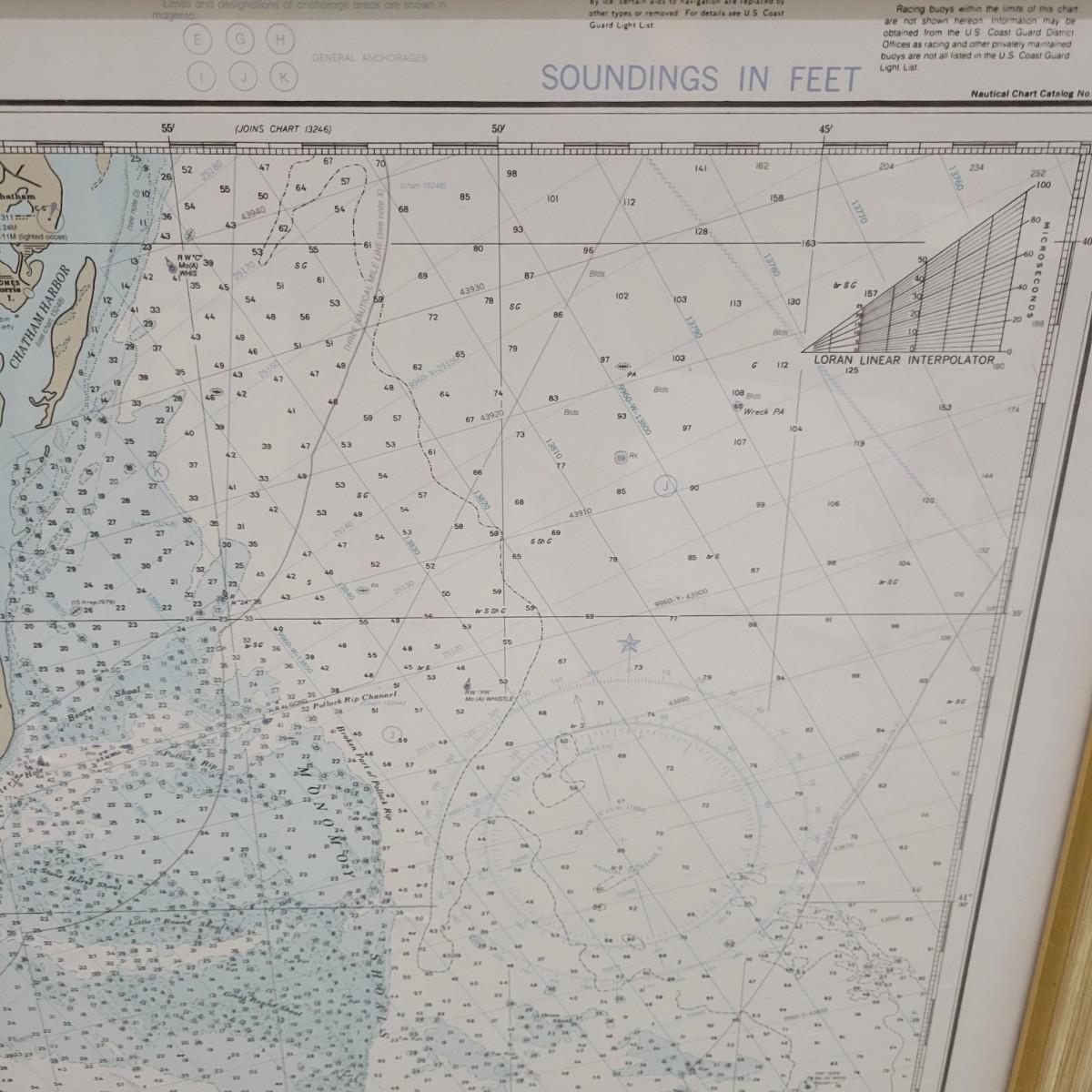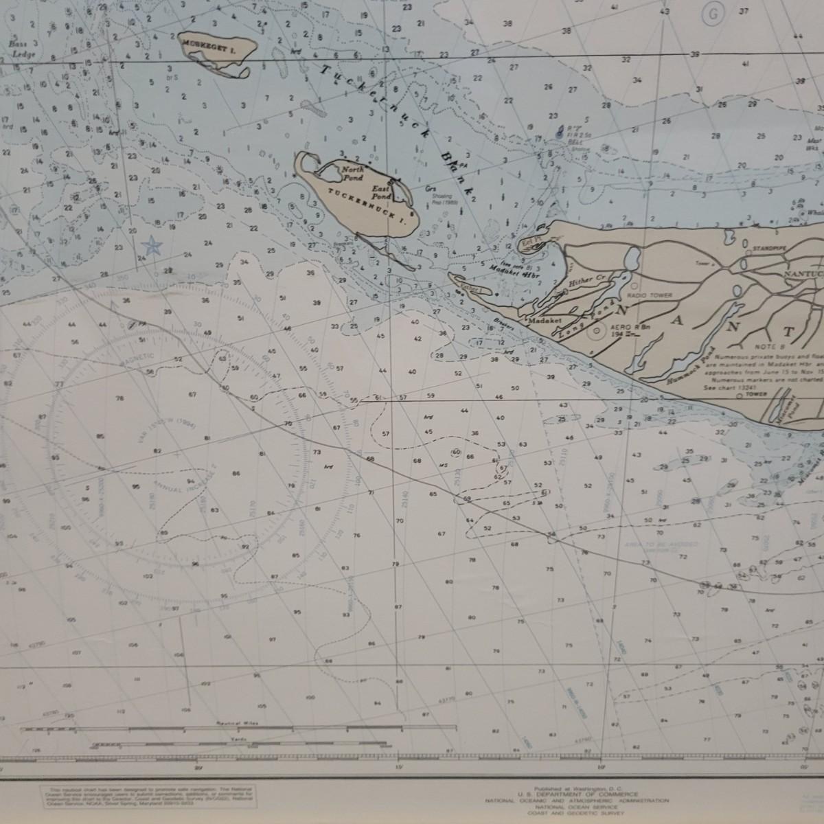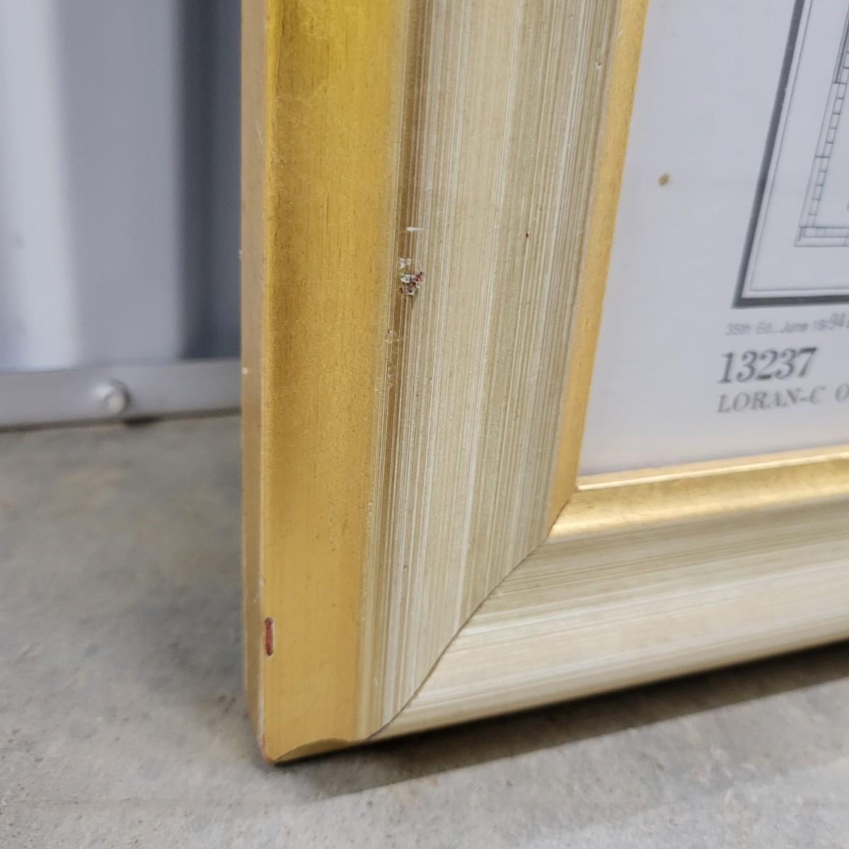 A large nautical map of Nantucket Sound and its approaches in a distressed gold frame. In good condition with a few minor blemishes on the frame. Backing paper is a little torn and hanging wire will need to be attached to hang. See attached pictures. Measures approximately 48" x 38" x 1.5"