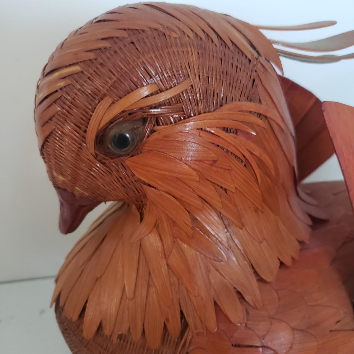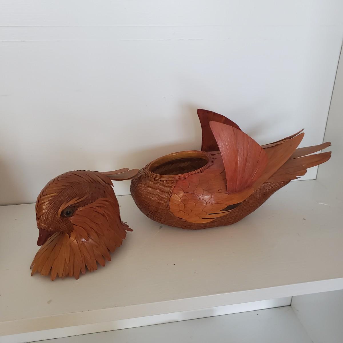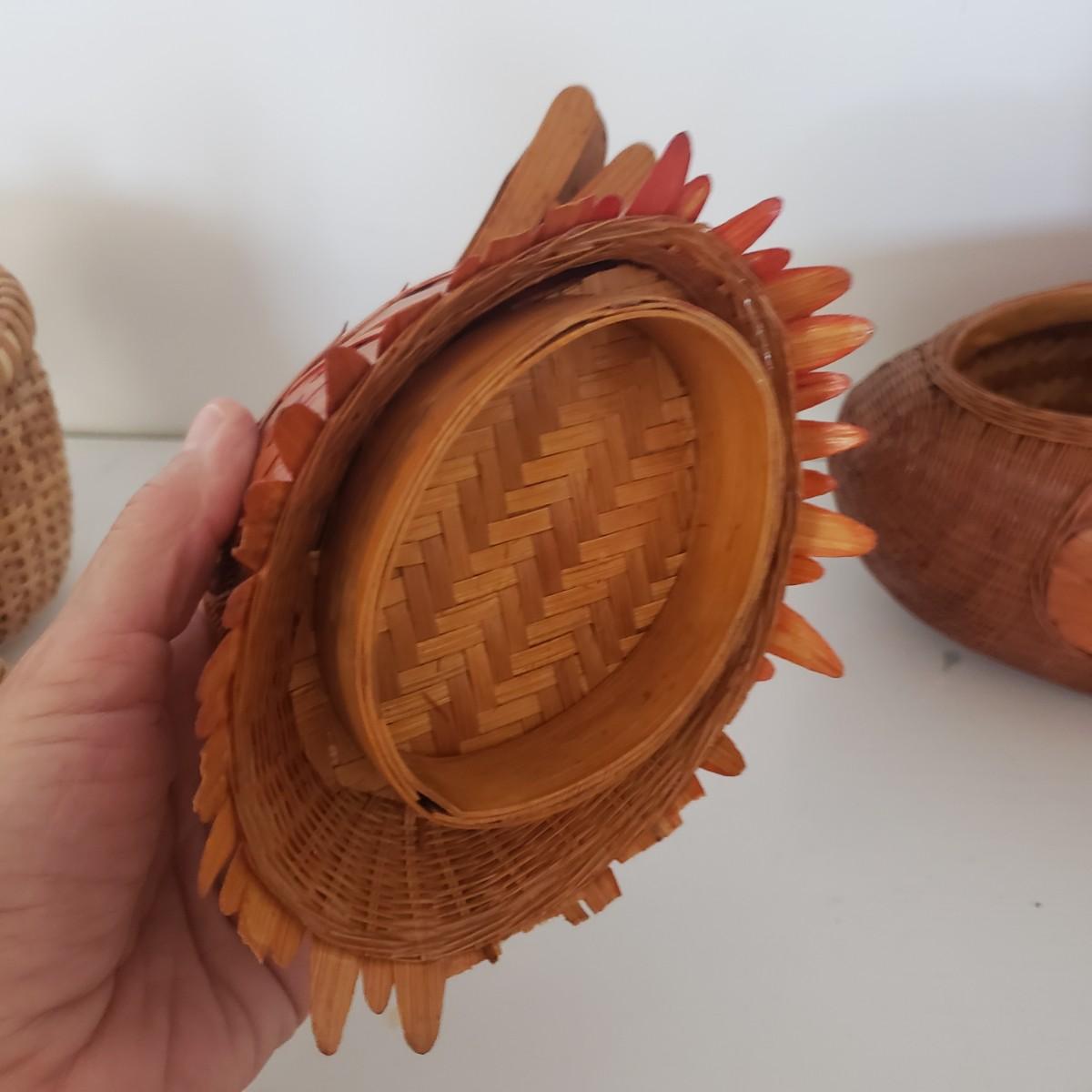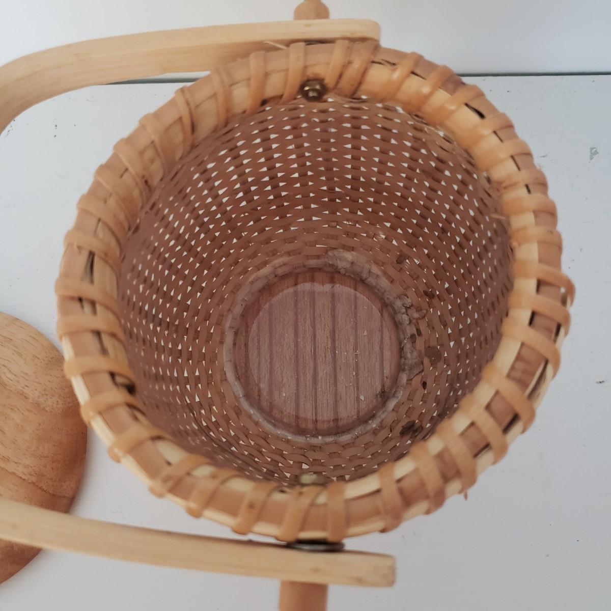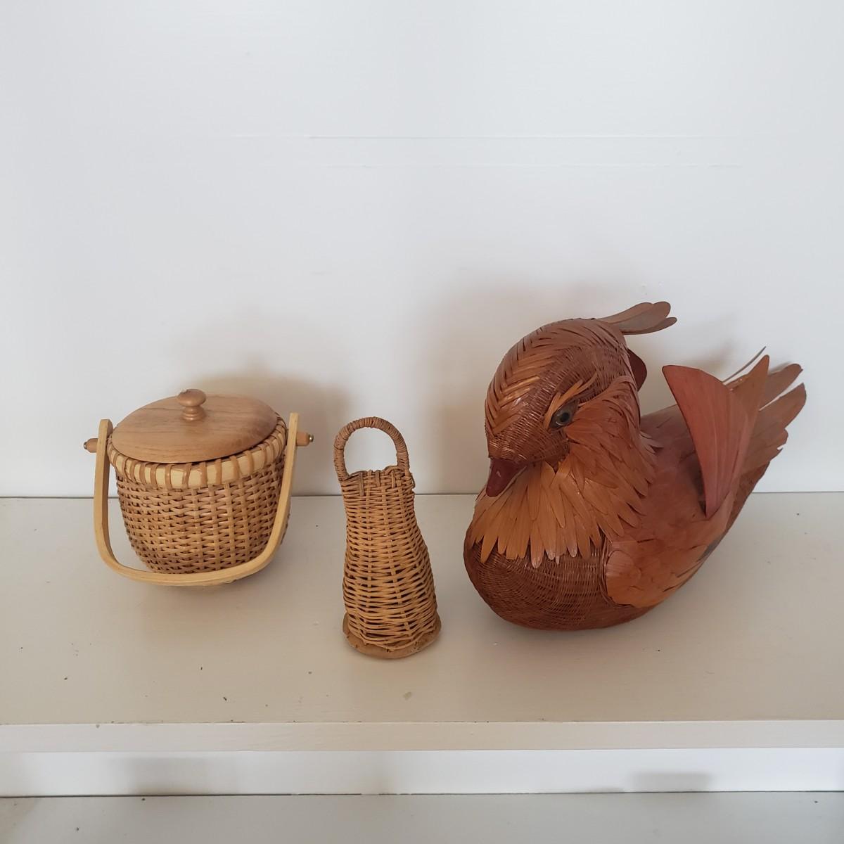 This lot features three woven baskets. The wooden handle and lid Nantucket style woven basket measures 4" x 5"H. This basket has a plastic insert in the bottom inside, which is hard to see in the picture. We didn't take it out for the pictures, as to not break the plastic. The exquisite hand made bird basket has such detail on the feathers and head. The head comes off and on the inside is a different weave than the outside. The bird measures 12" x 5" x 8"H. The handled wicker rattle has what appears to be a gourd bottom. The rattle measures 2" x 6"H.