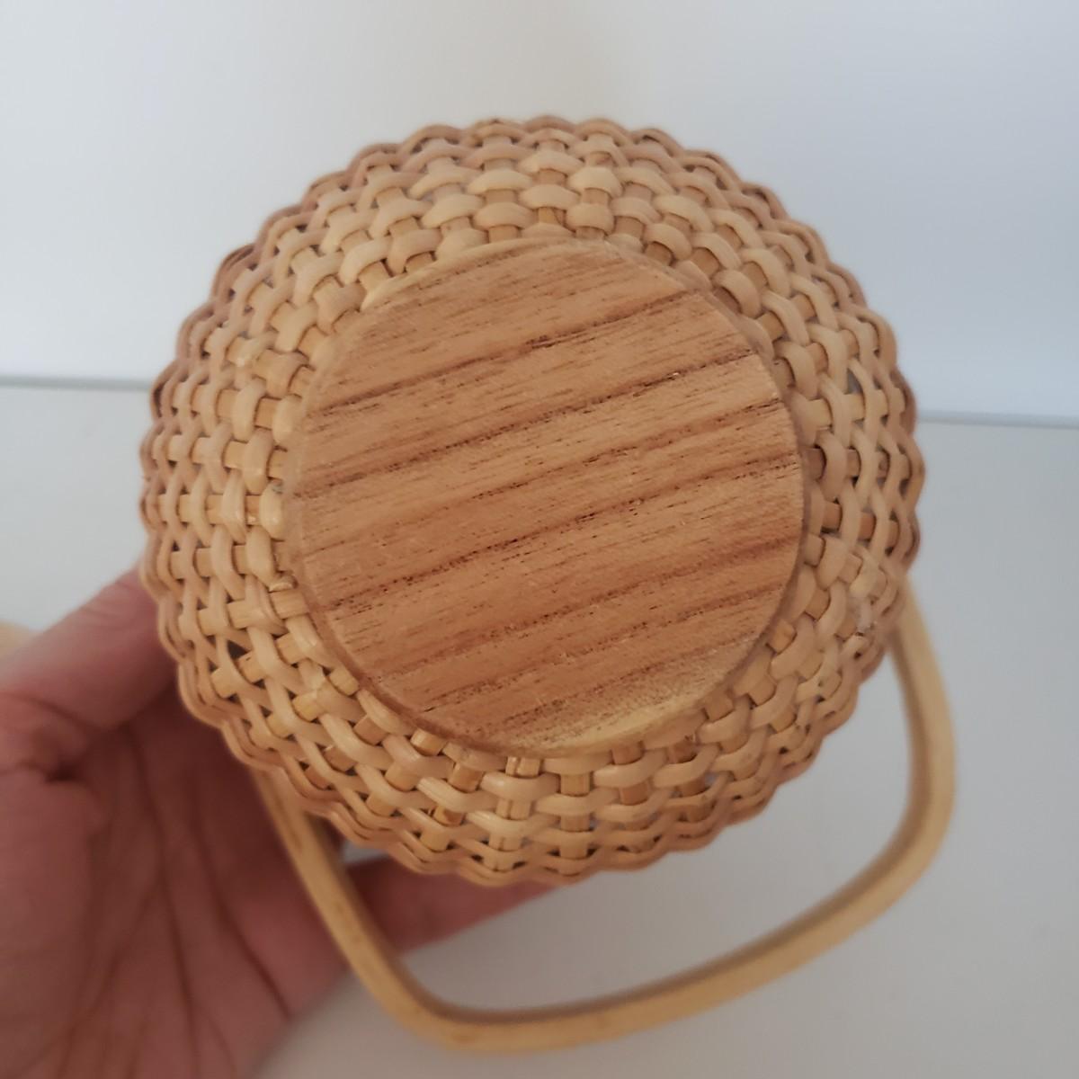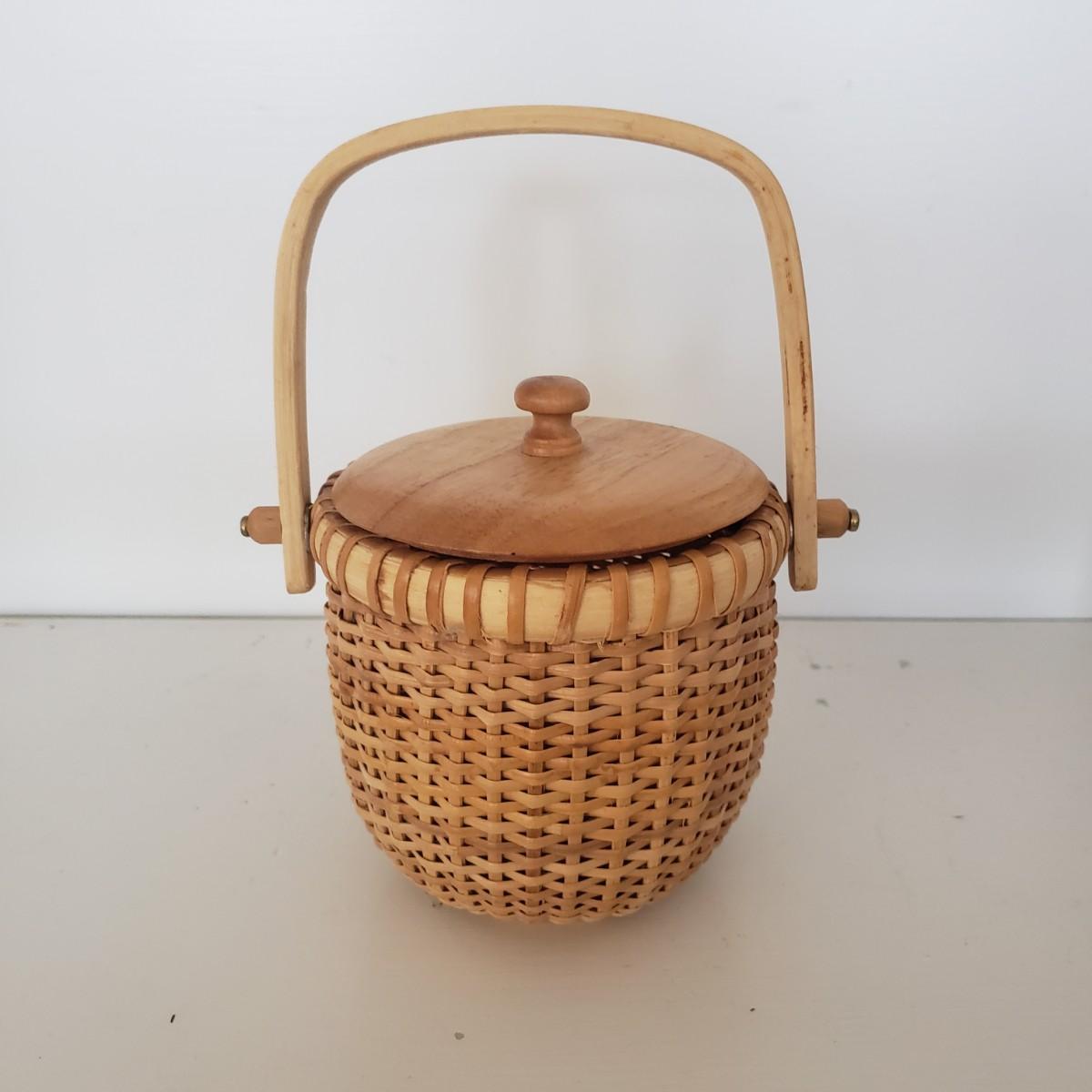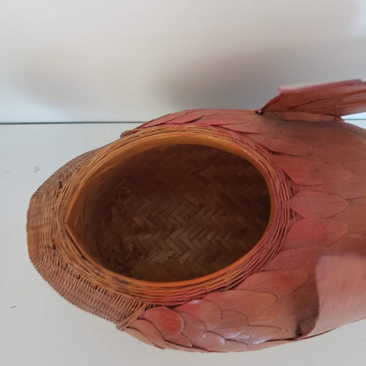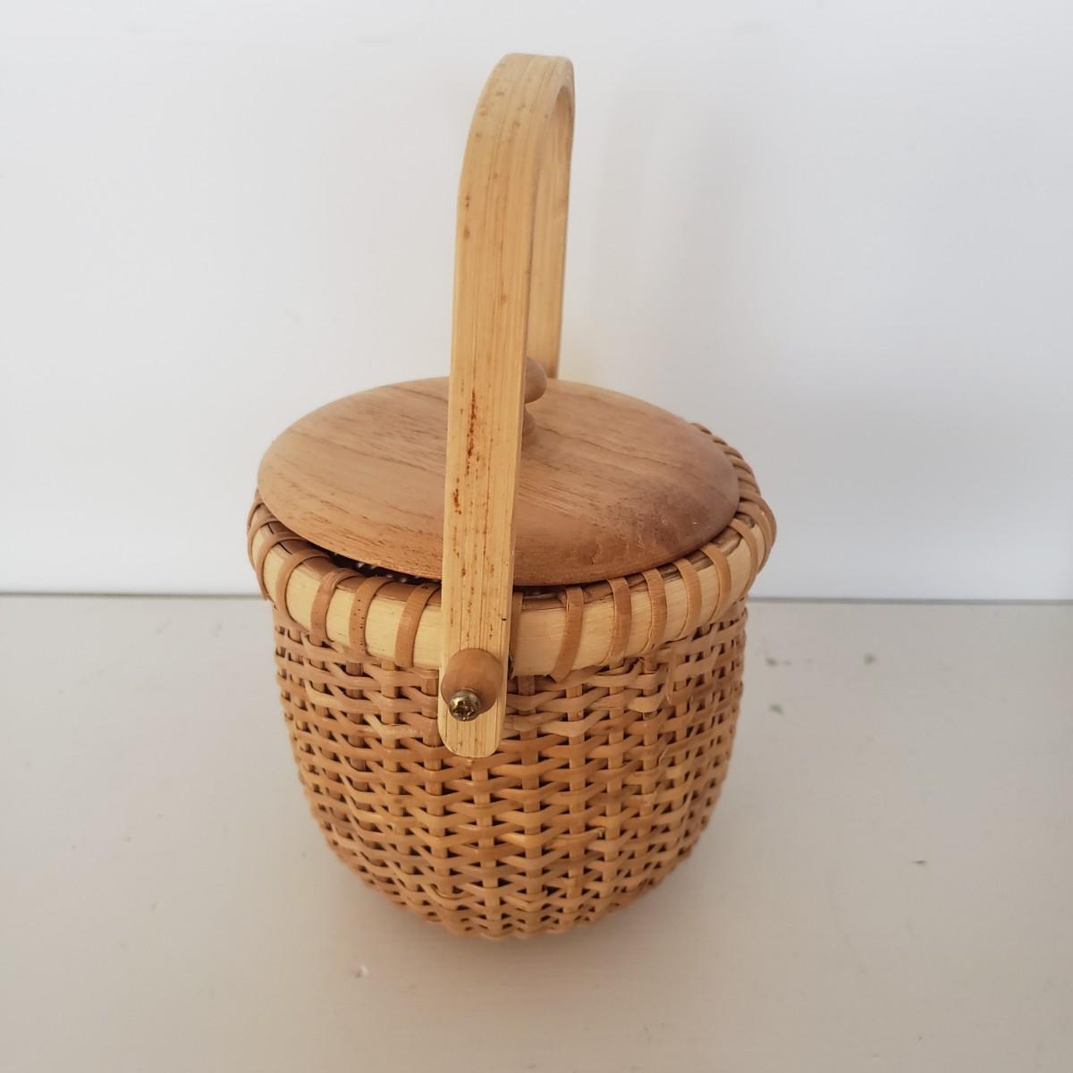 This lot features three woven baskets. The wooden handle and lid Nantucket style woven basket measures 4" x 5"H. This basket has a plastic insert in the bottom inside, which is hard to see in the picture. We didn't take it out for the pictures, as to not break the plastic. The exquisite hand made bird basket has such detail on the feathers and head. The head comes off and on the inside is a different weave than the outside. The bird measures 12" x 5" x 8"H. The handled wicker rattle has what appears to be a gourd bottom. The rattle measures 2" x 6"H.