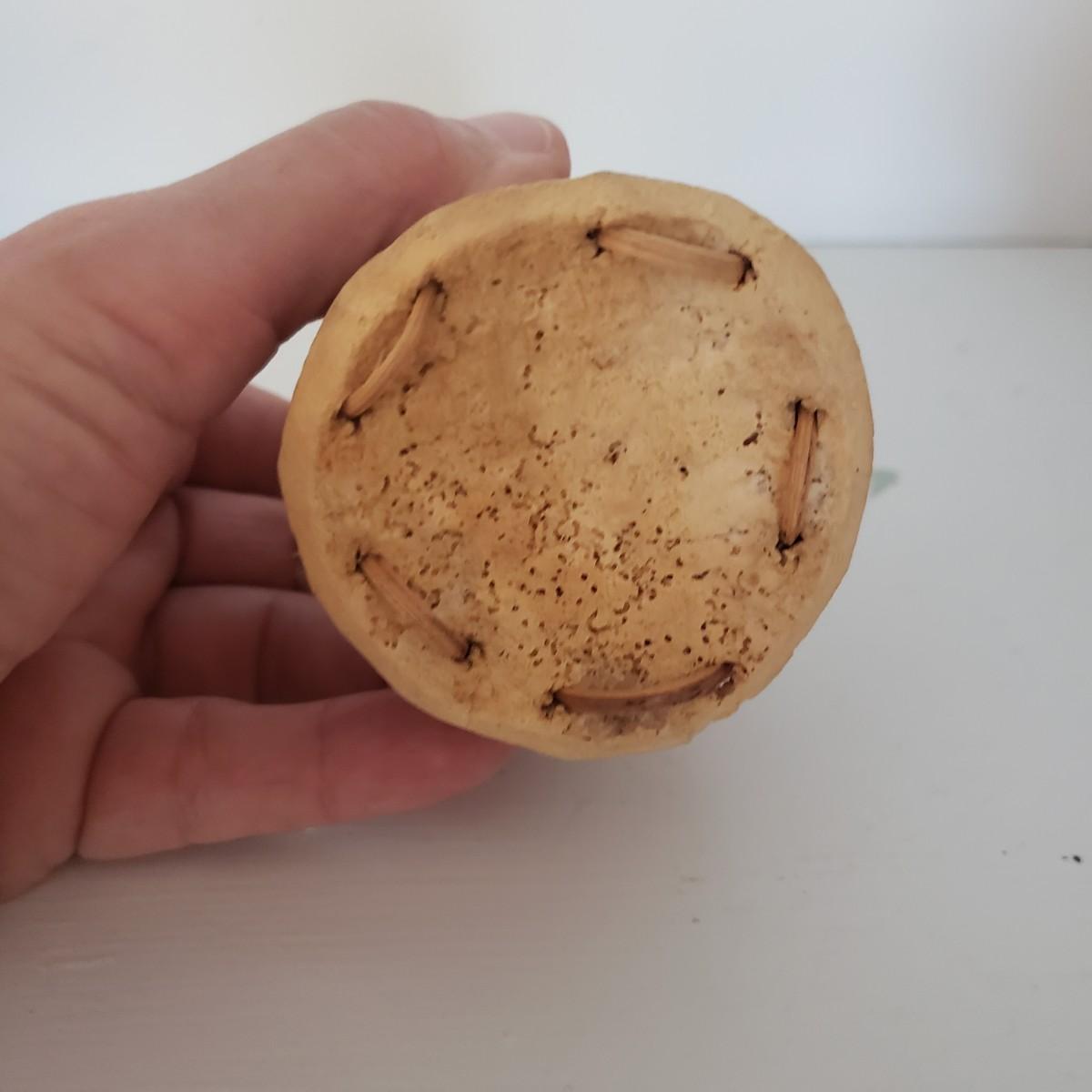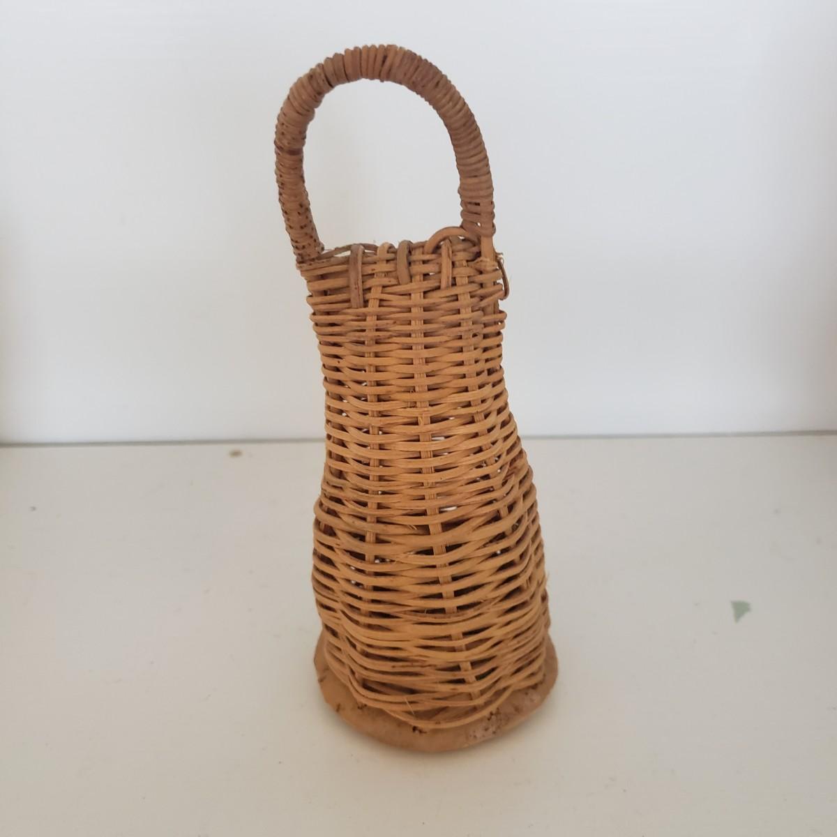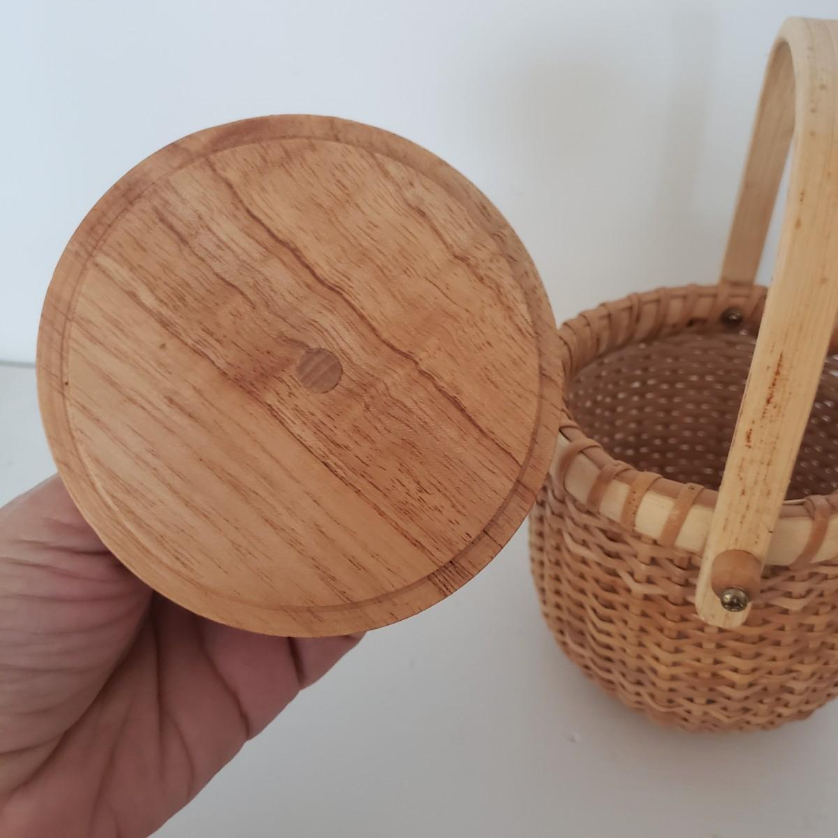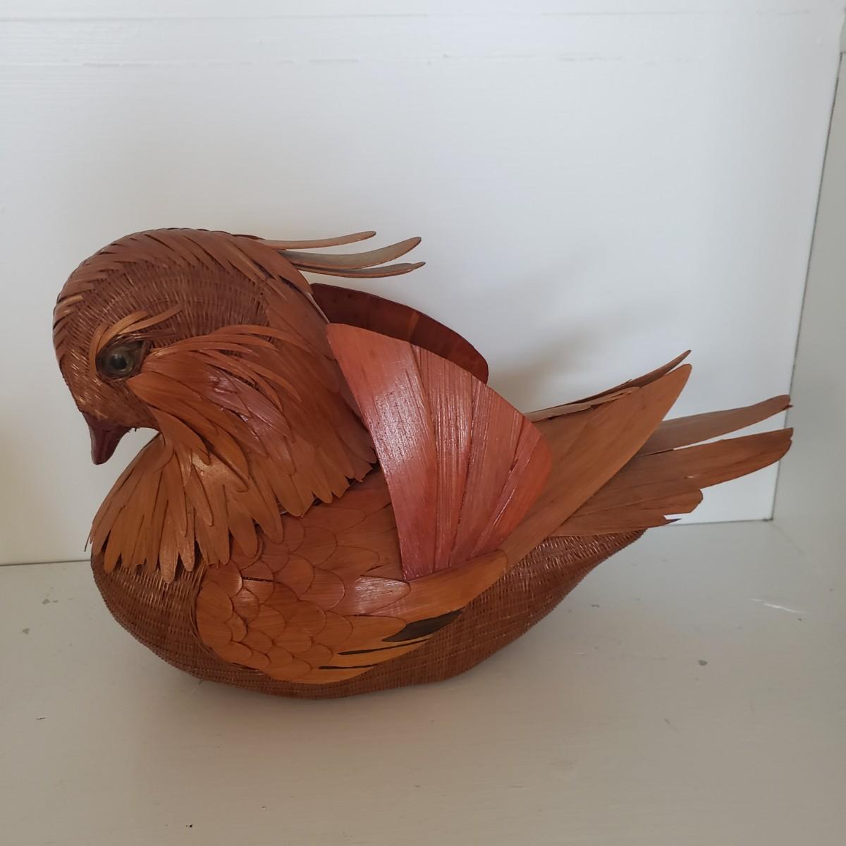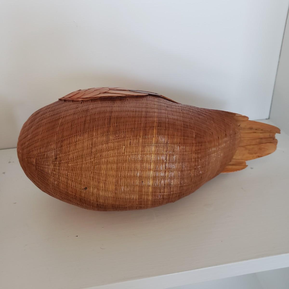 This lot features three woven baskets. The wooden handle and lid Nantucket style woven basket measures 4" x 5"H. This basket has a plastic insert in the bottom inside, which is hard to see in the picture. We didn't take it out for the pictures, as to not break the plastic. The exquisite hand made bird basket has such detail on the feathers and head. The head comes off and on the inside is a different weave than the outside. The bird measures 12" x 5" x 8"H. The handled wicker rattle has what appears to be a gourd bottom. The rattle measures 2" x 6"H.