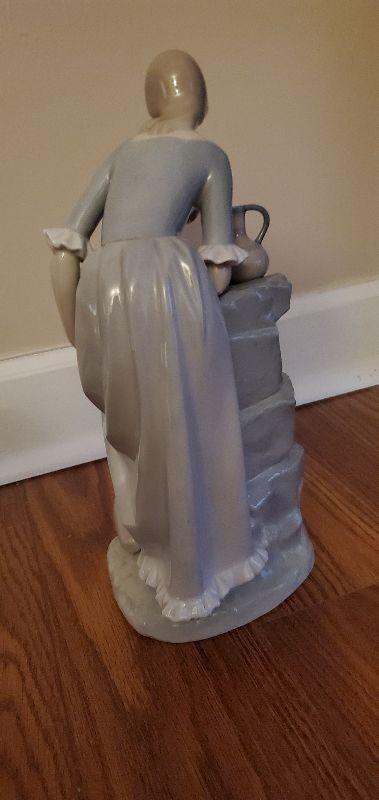 a young woman dipping her feet at a spout and filling water jugs.  Piece is 13 inches tall.  No chips, scratches or damage on piece.  No original packaging.
