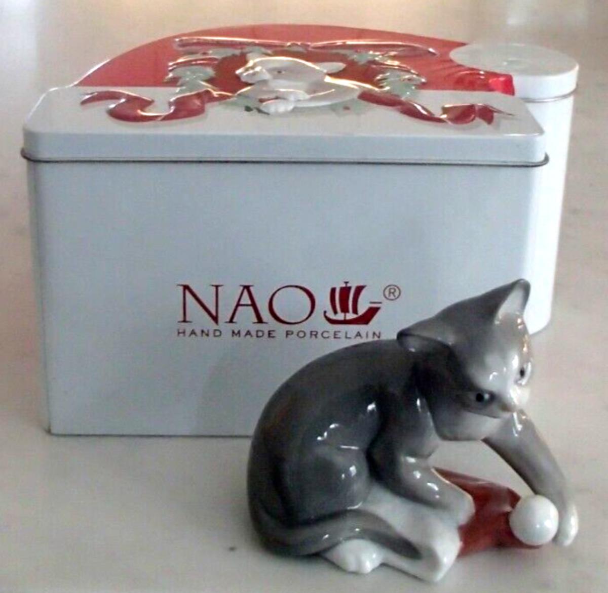 NAO Retired by Lladro 7428 "Kitty's Christmas" Cat Claying w Santa's Hat -NIB/Santa Hat Tin.