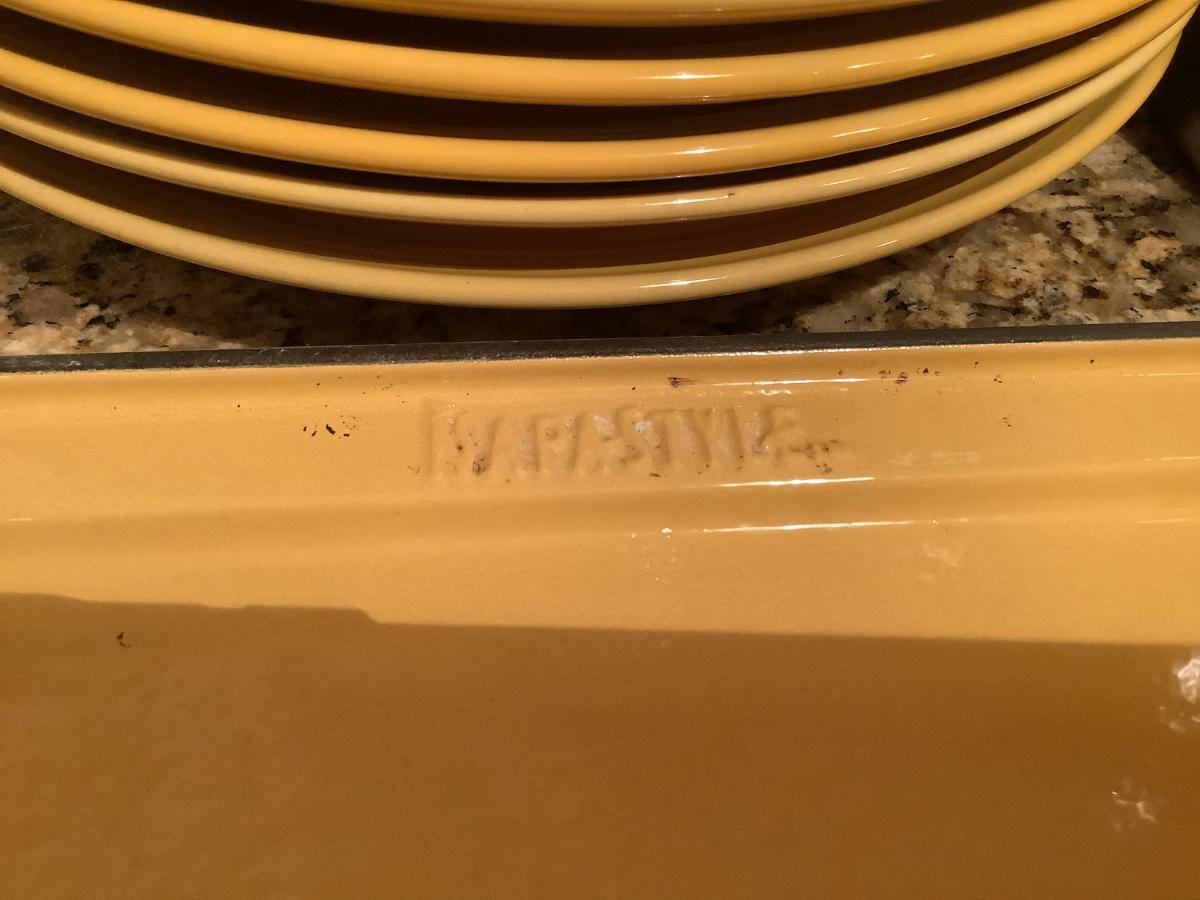 Napa style enamel cast iron pan, plates, canister, S&P/oil/vinegar