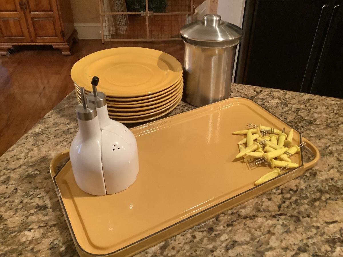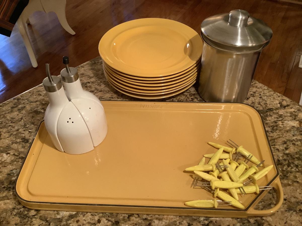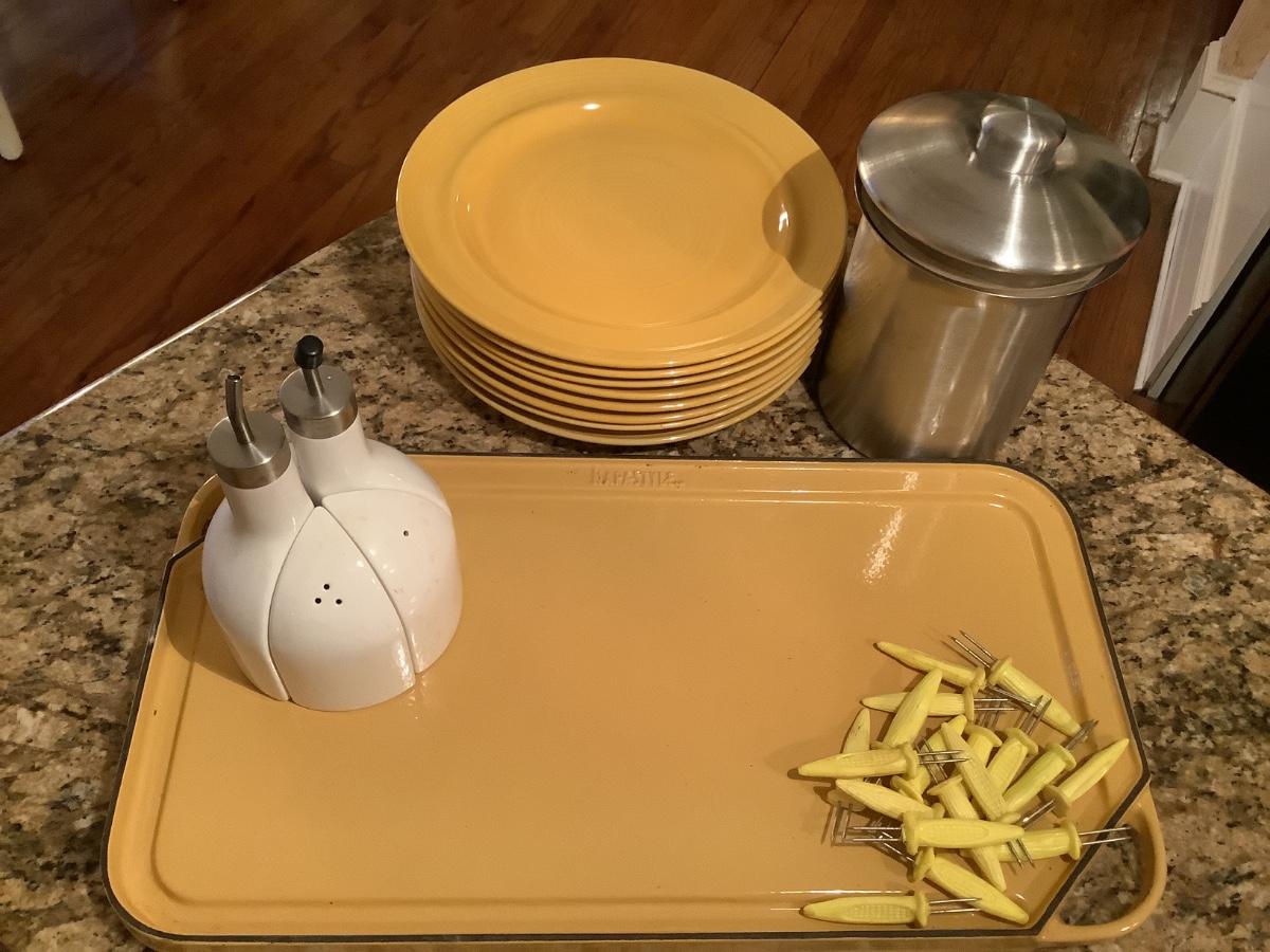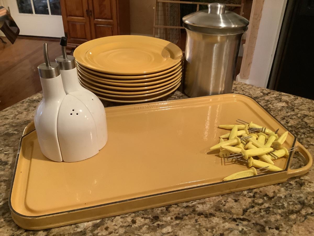 Napa style enamel cast iron griddle and grill pan, plates, canister, S&P with oil/vinegar dispenser