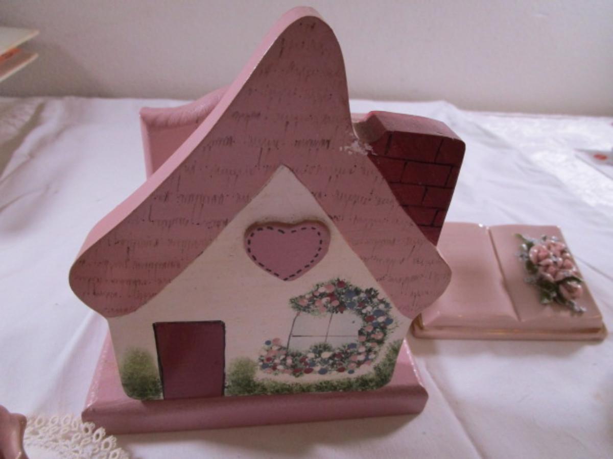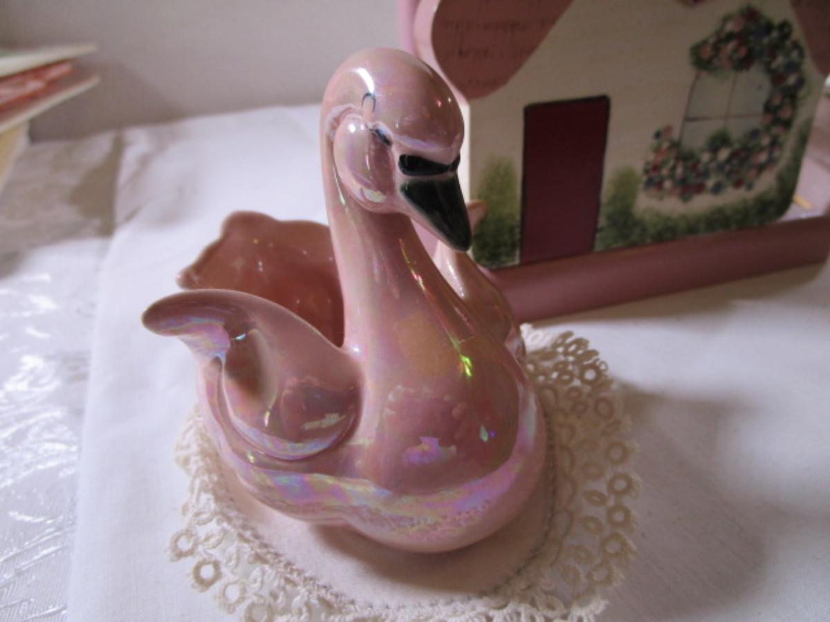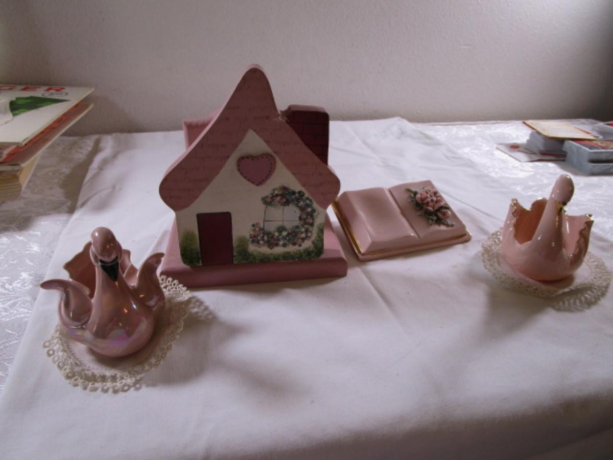 Napkin holder is house shape,1 Lenox swan is pink with gold trim4-3/4" long x 3-3/4" tall, 1 Kay Finch iridescent swan 3-7/8" long x 3-1/2" tall, both swans have doilies with them, book figurine has roses