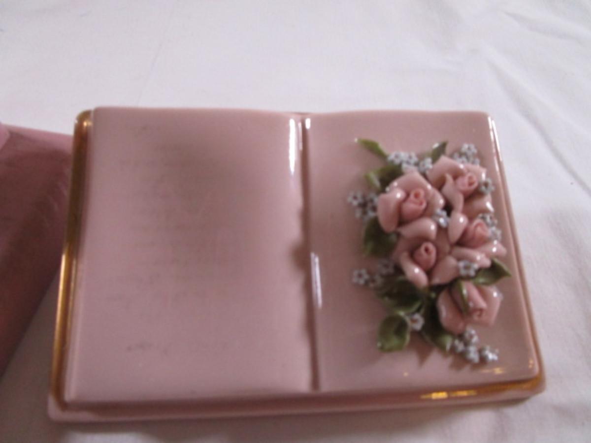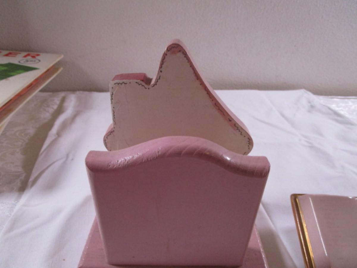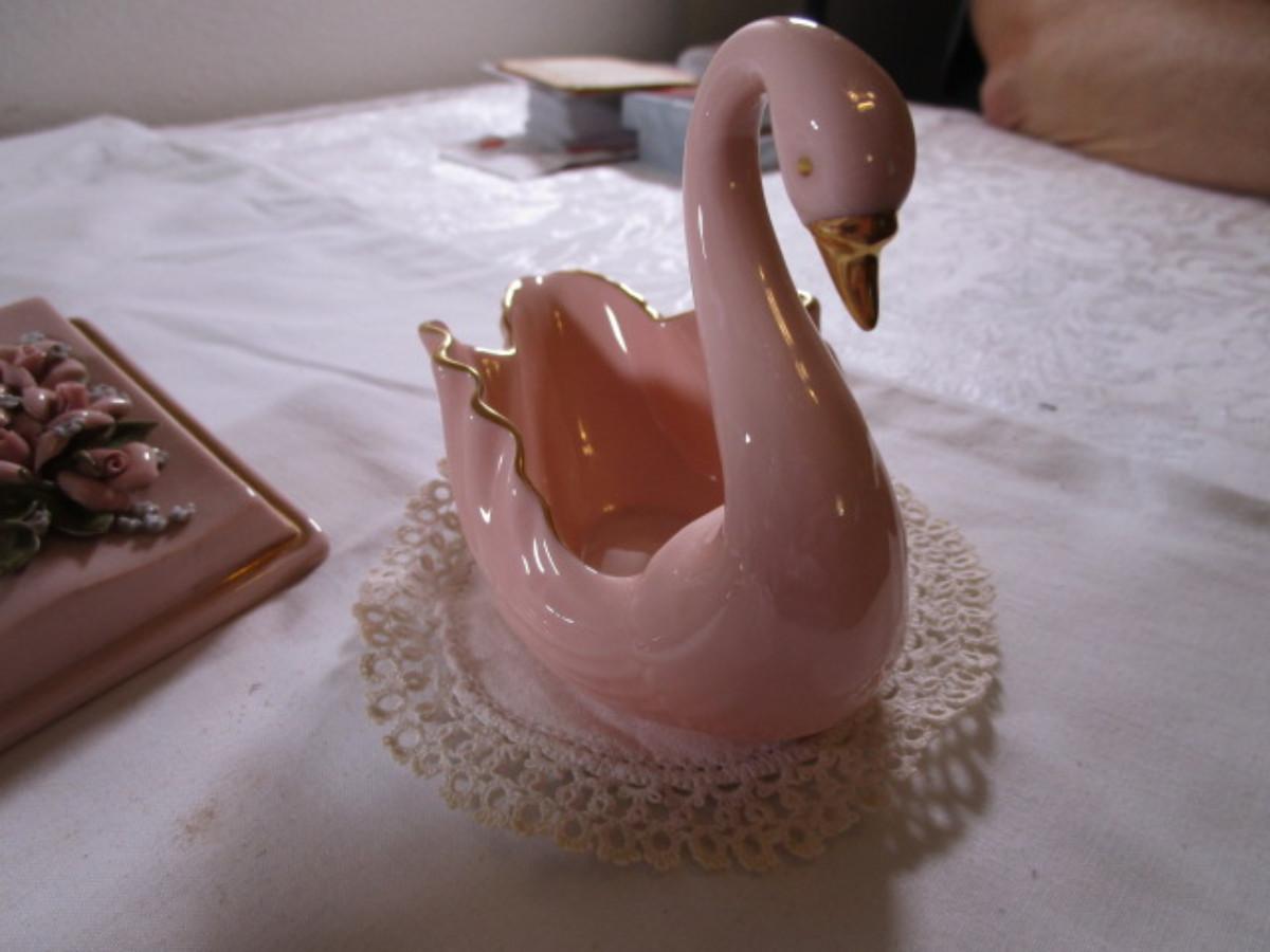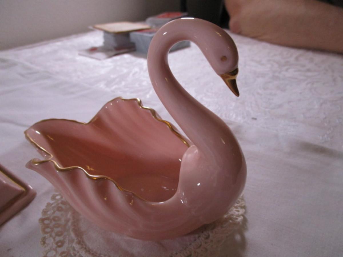 Napkin holder is house shape,1 Lenox swan is pink with gold trim4-3/4" long x 3-3/4" tall, 1 Kay Finch iridescent swan 3-7/8" long x 3-1/2" tall, both swans have doilies with them, book figurine has roses