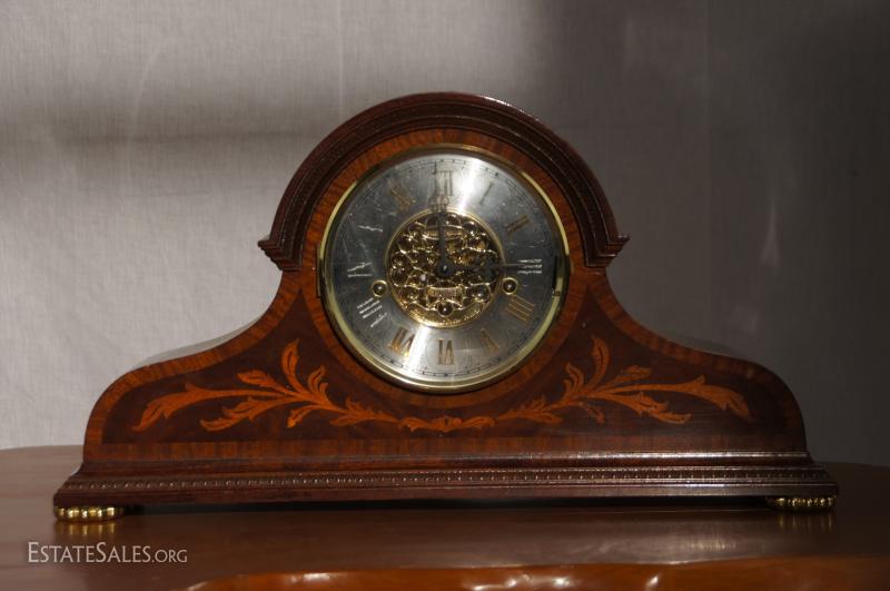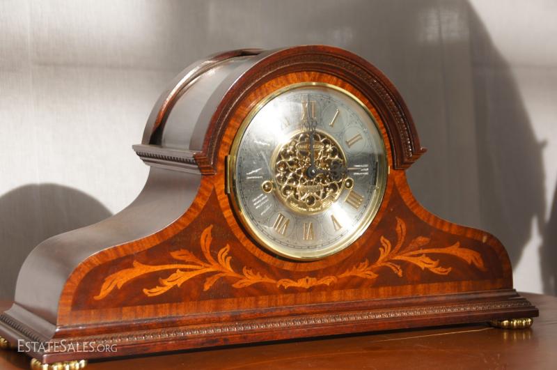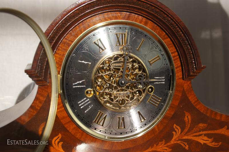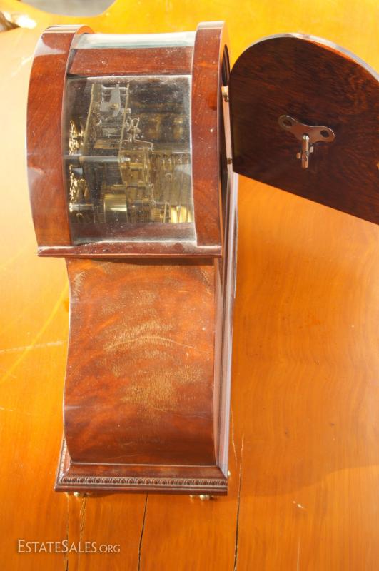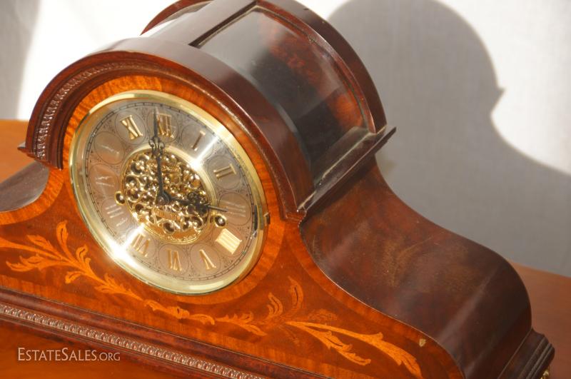 Napoleon III style faux marquetry Howard Miller mantel clock, running, with key, but some numbers are missing