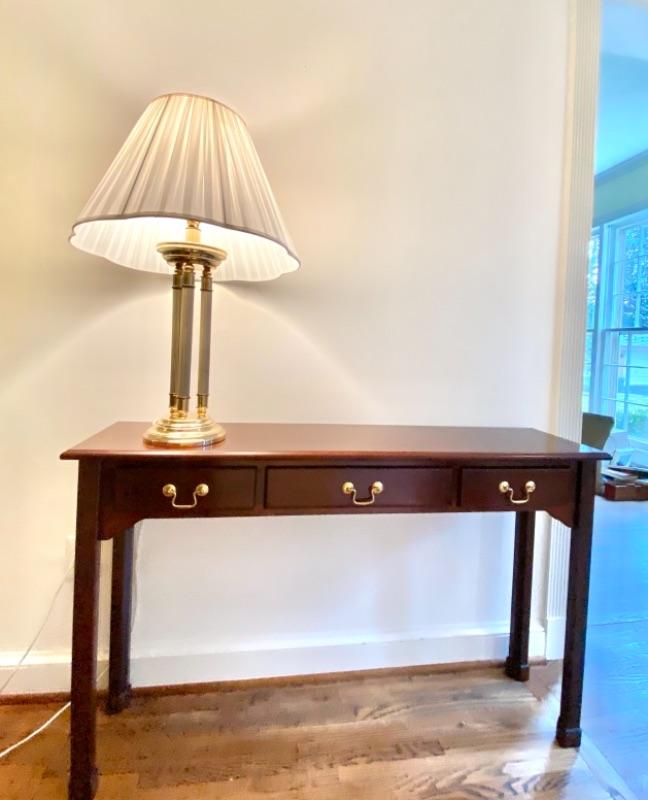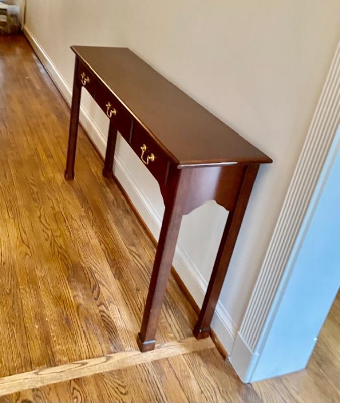 Classic dark wood newer console table - perfect for entry or small space. Three drawers, classic pulls, straight simple legs with squared feet.