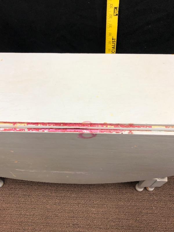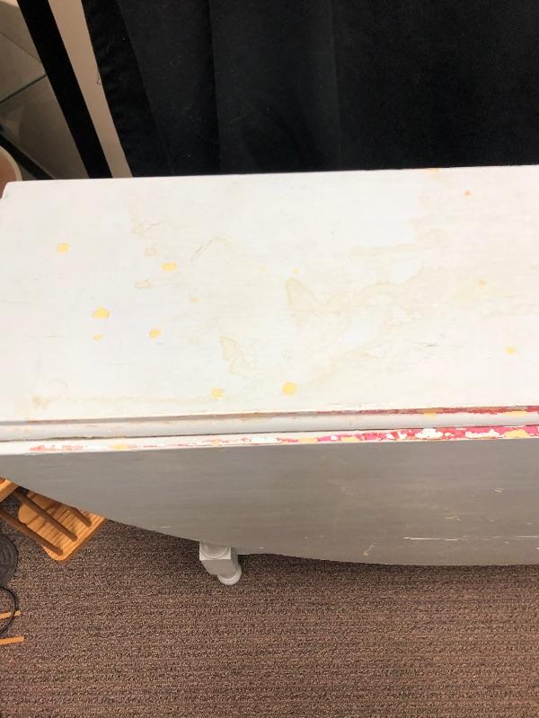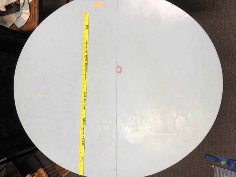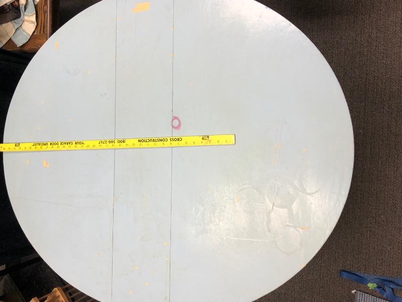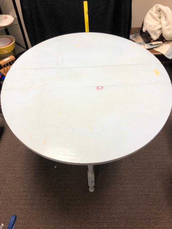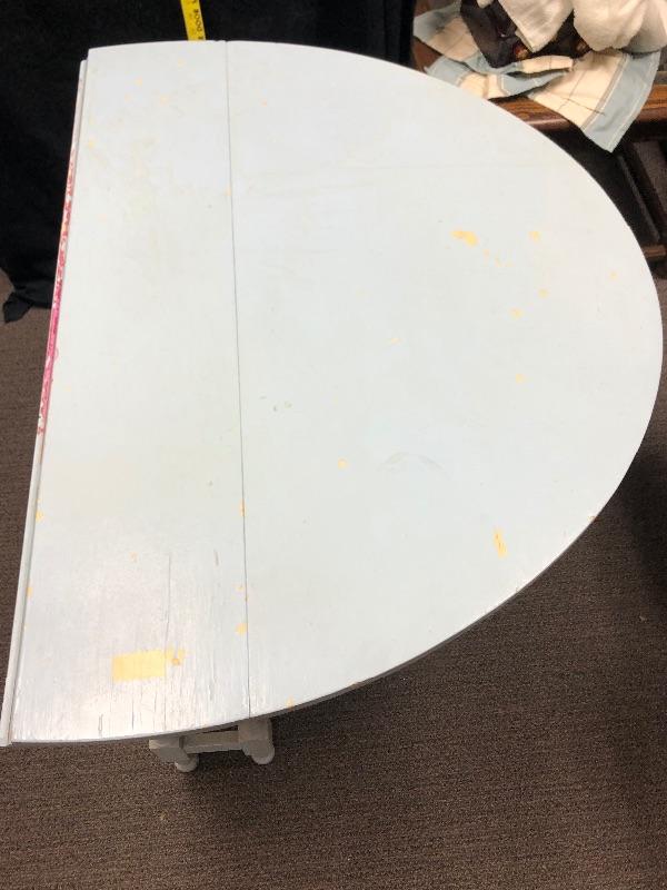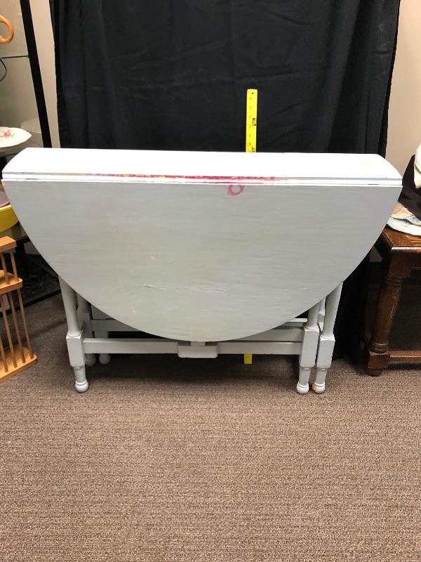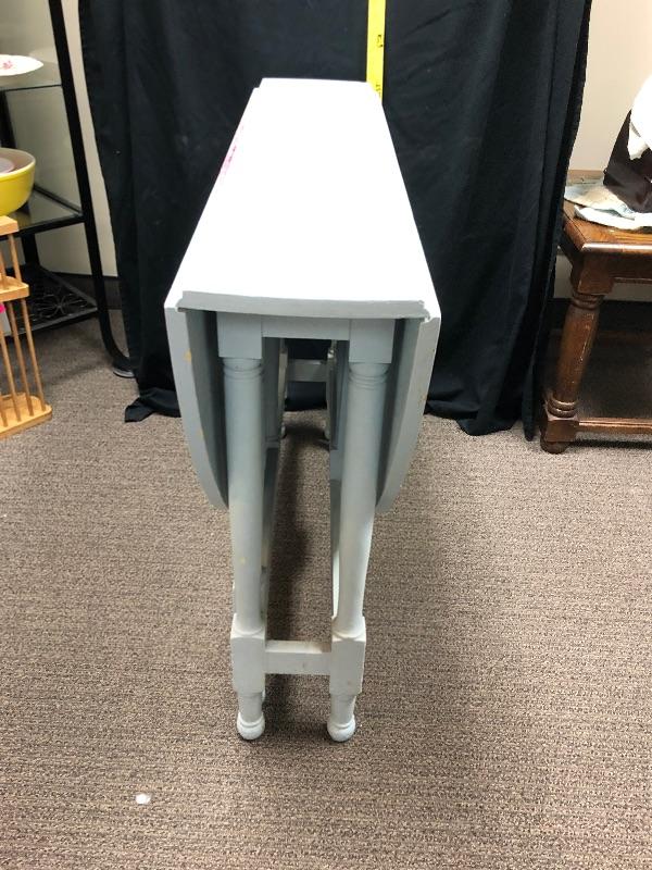 Wonderful drop leaf table. Currently it is a very pale blue color. It is very narrow when sides are down, about 10", making it great for small spaces. Sides are 20" wide. Legs fold out for support. Paint is not perfect and shows signs of age and use.