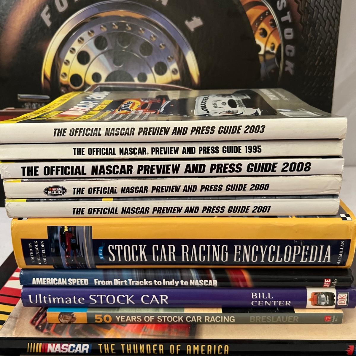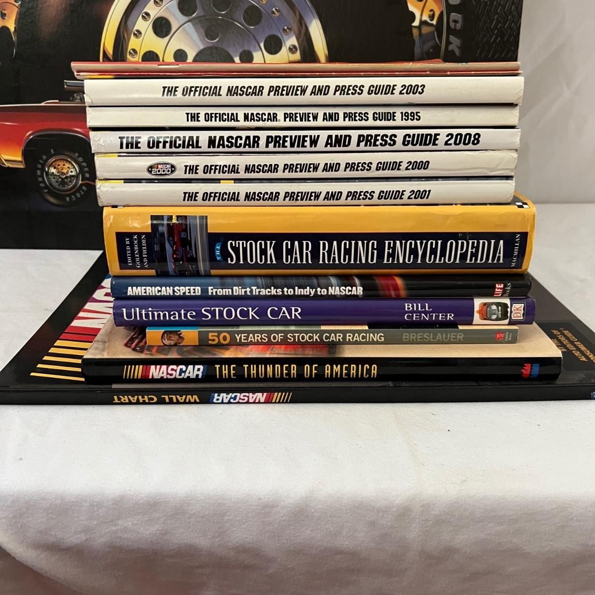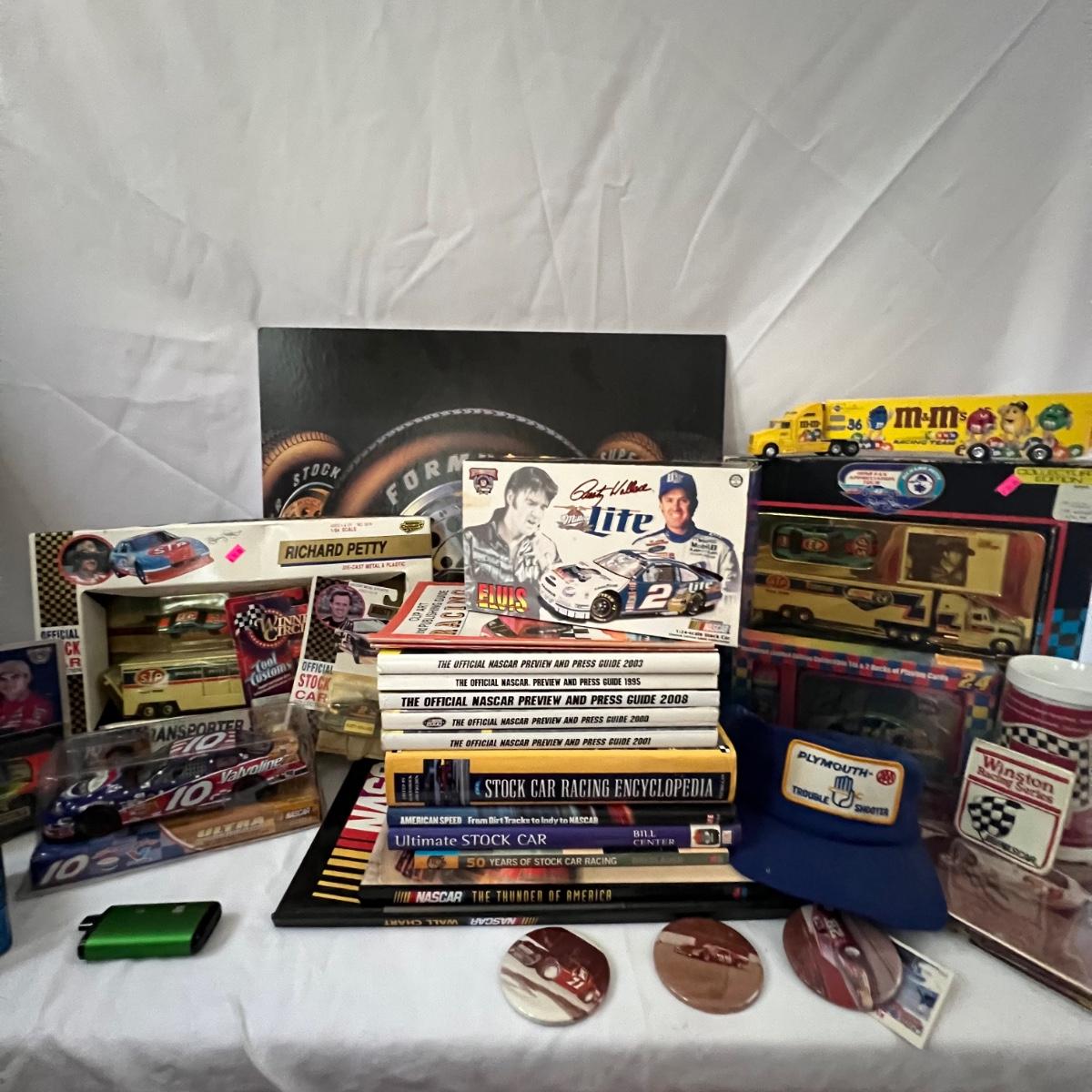 A huge lot of collectibles for NASCAR/Stock Car fans. Lot includes a stack of books, model cars, poster and more.