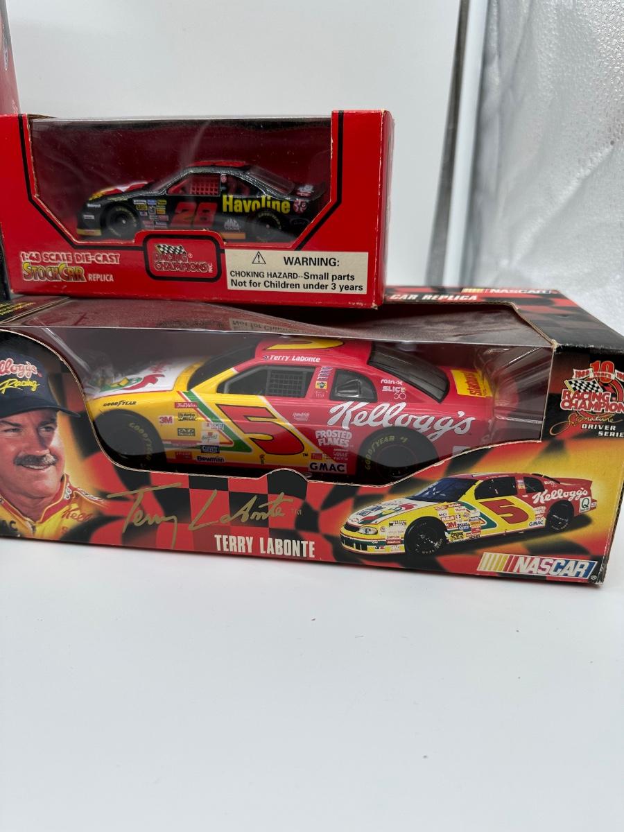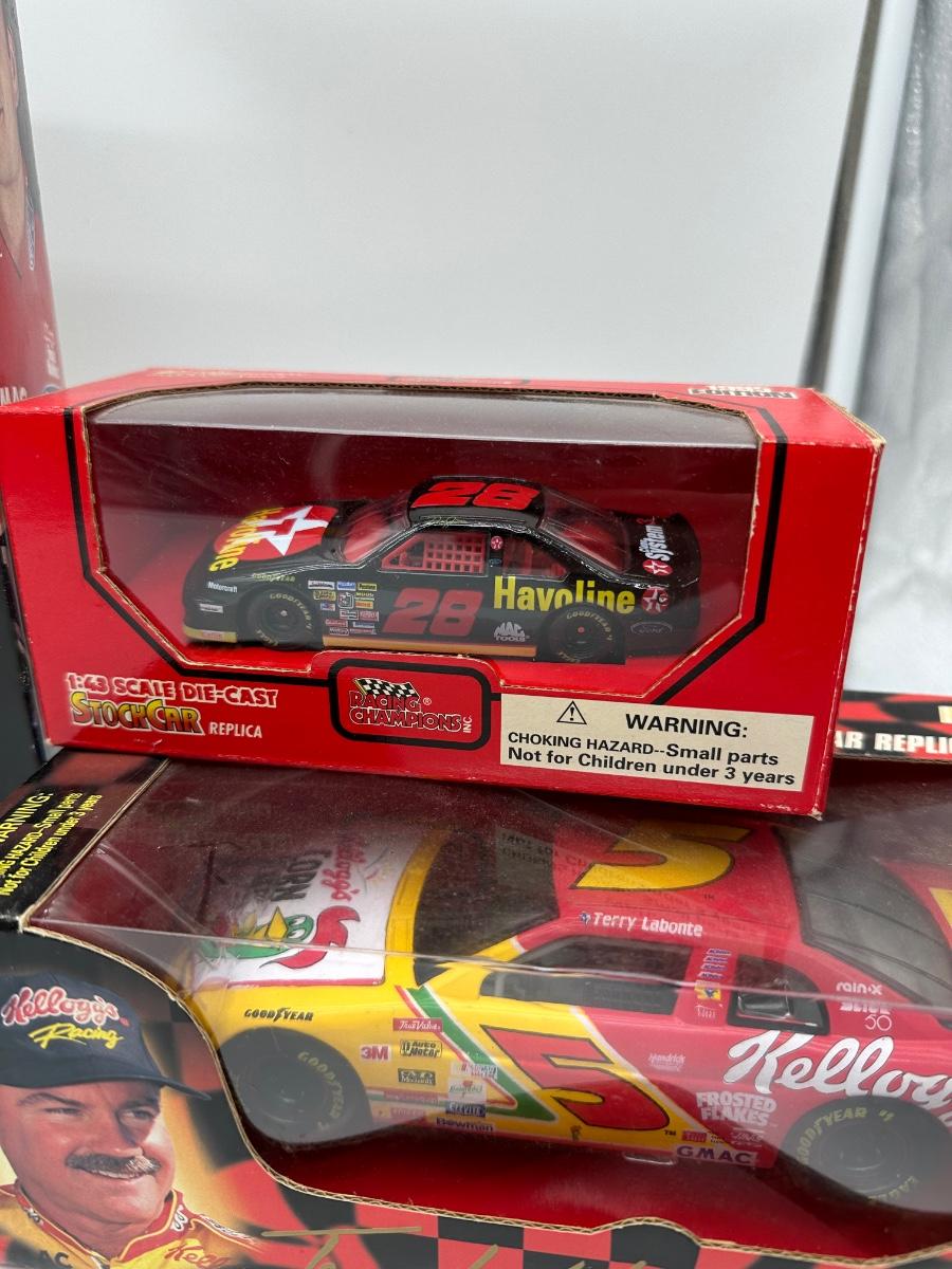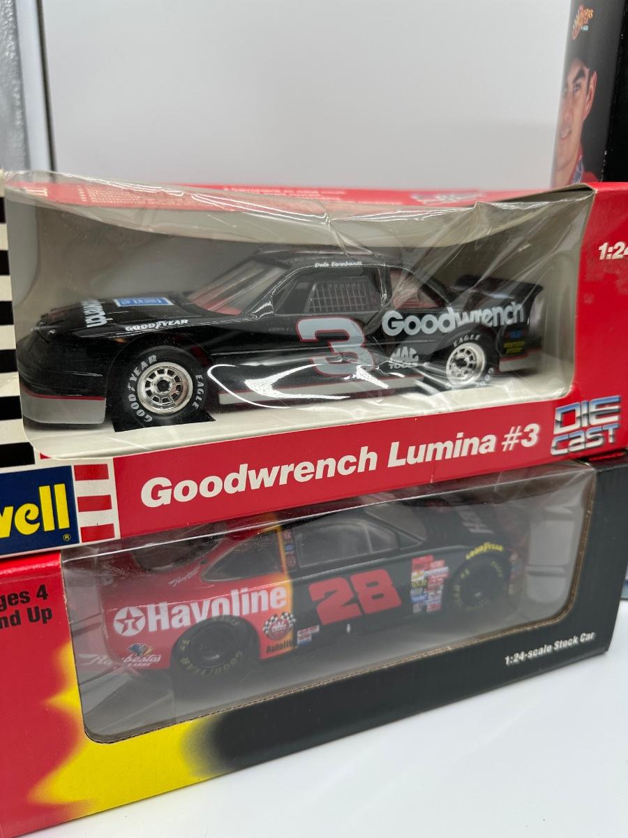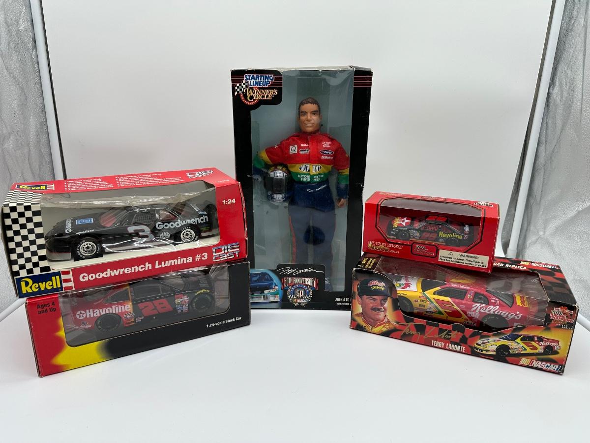 Mixed lot of NASCAR collectibles including diecast stock cars and a boxed driver figure. Includes Revell 1:24 scale diecast cars, Racing Champions 1:43 scale diecast, and a Starting Lineup Winner’s Circle driver figure. Features iconic liveries such as Goodwrench #3 and Havoline #28, plus a Kellogg’s Terry Labonte car. Items show light box wear consistent with age; cars appear unused and displayed in original packaging. Great lot for NASCAR fans or collectors.
